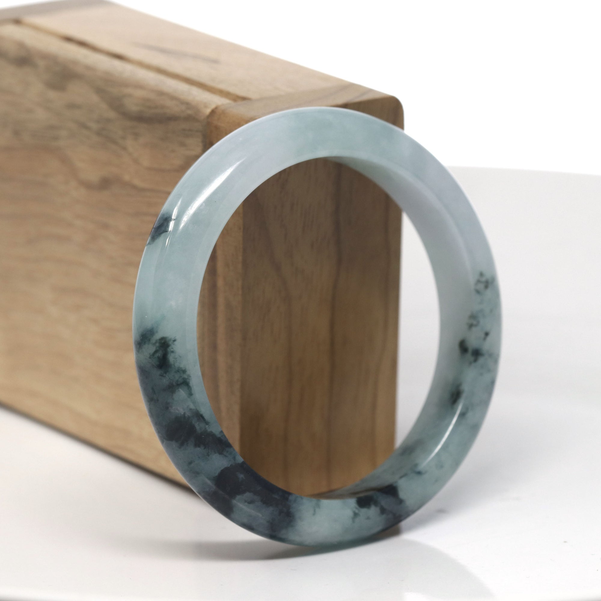 Baikalla Icy Light Blue-Green W/ Deep Green Flowers "Traditional Round" Jadeite Jade Bangle Bracelet (53.8mm) #TT226