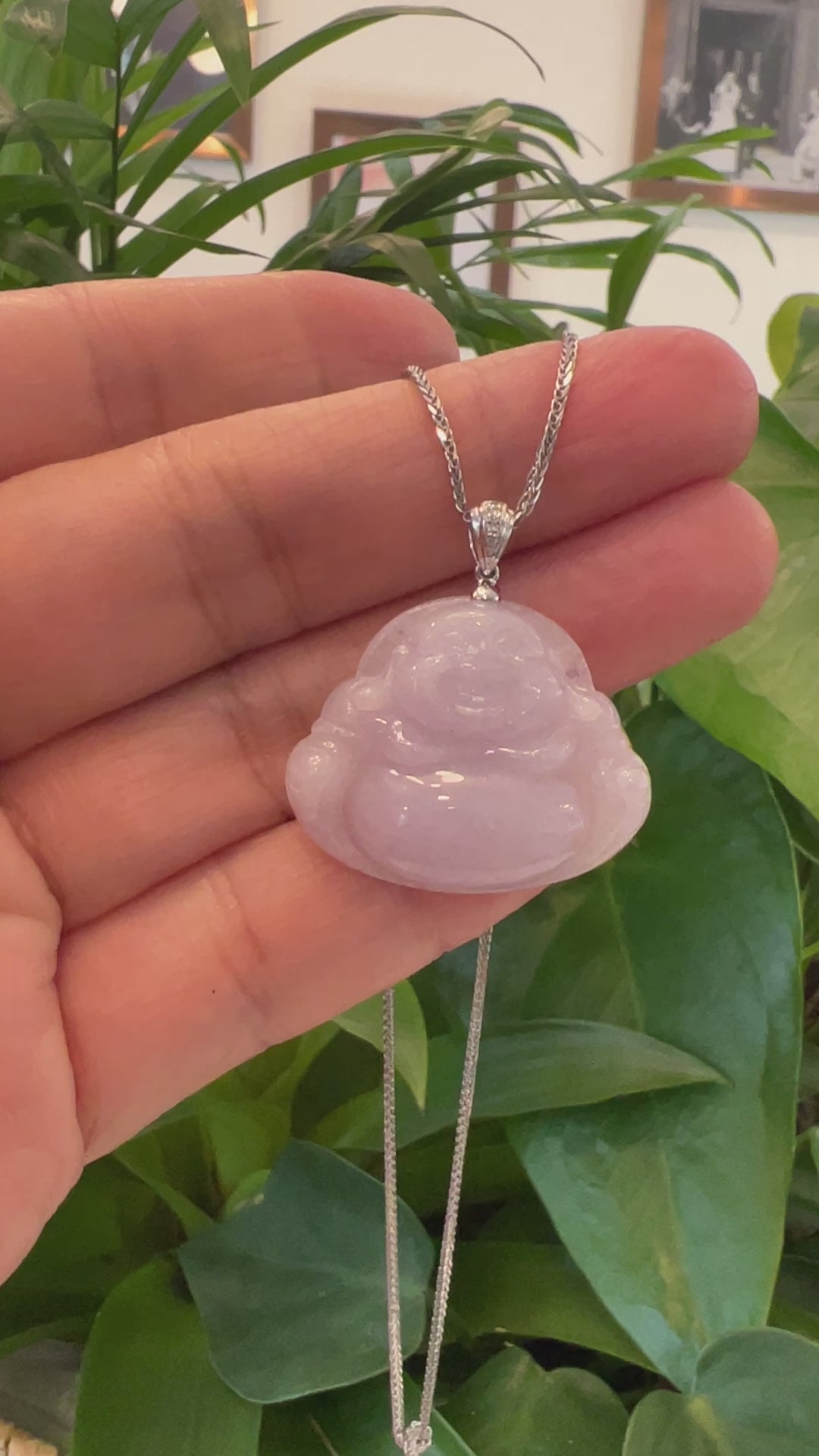 "Laughing Buddha" Genuine Vibrant Lavender Green, Jadeite Jade Buddha Pendant Necklace With 14k White Gold Bail