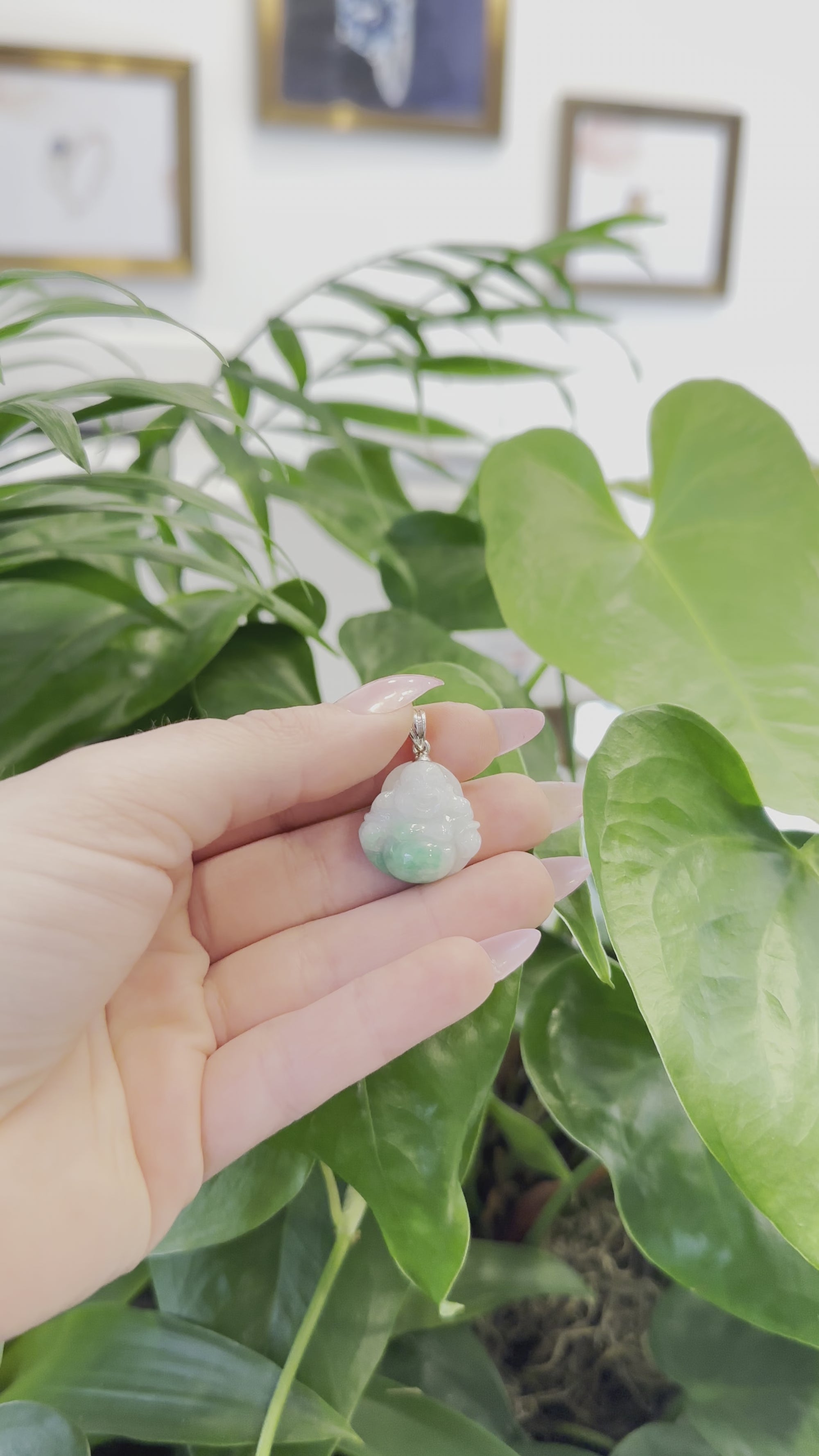 "Laughing Buddha" 14k White Gold Genuine Light Lavender Green, Jadeite Jade Buddha Necklace With Diamond Bail