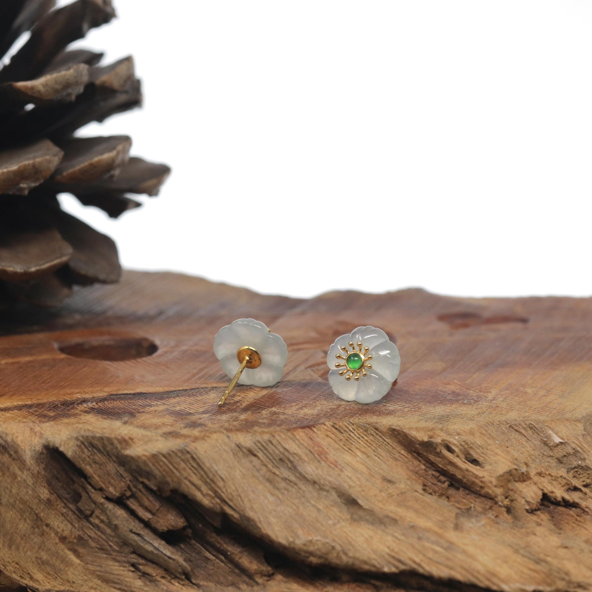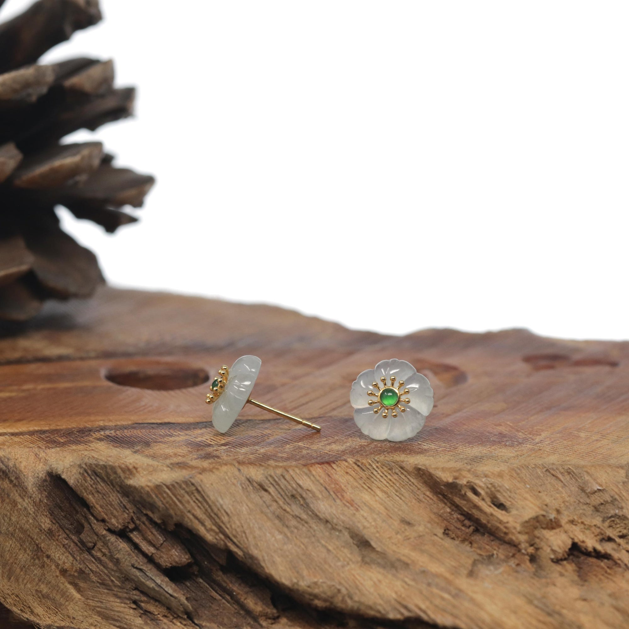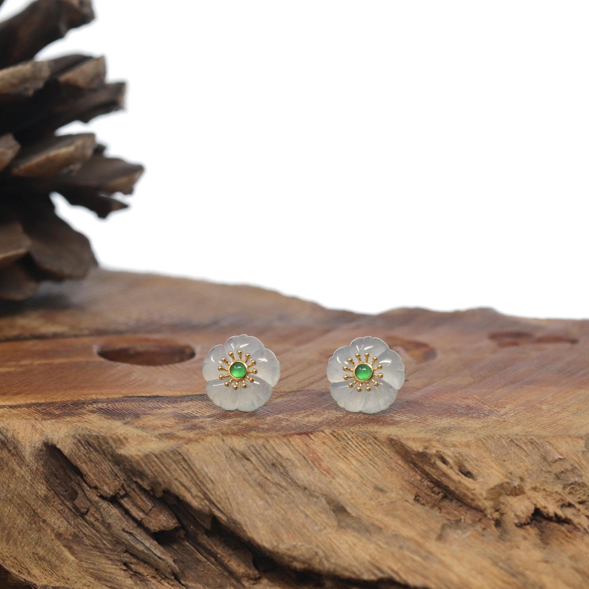 Baikalla™ "Peony Flowers" 14k Solid Gold Real Green Jade Peony Flower Earrings
