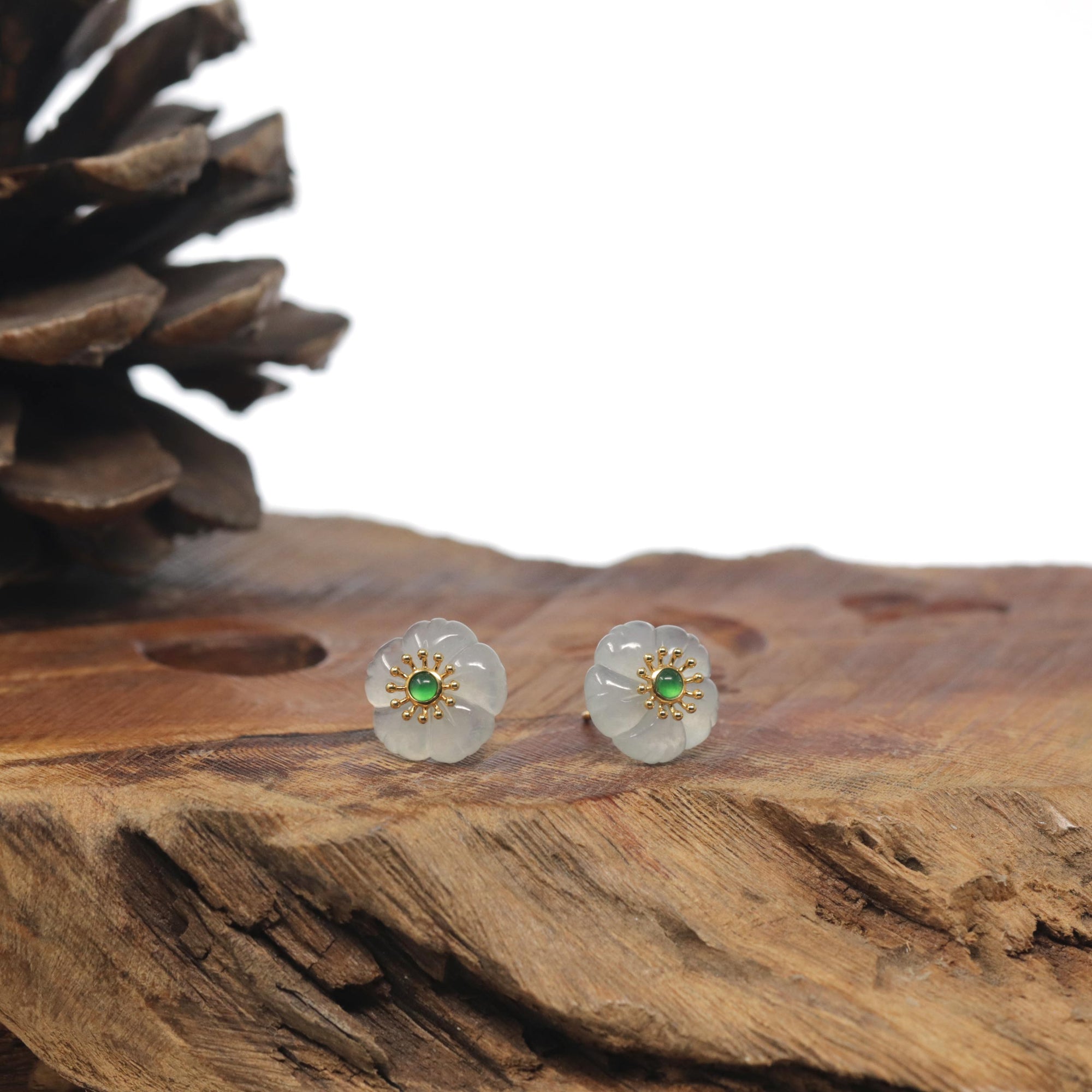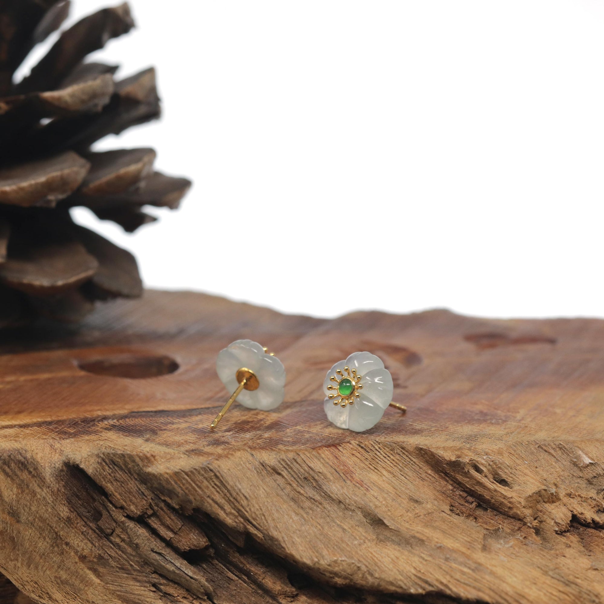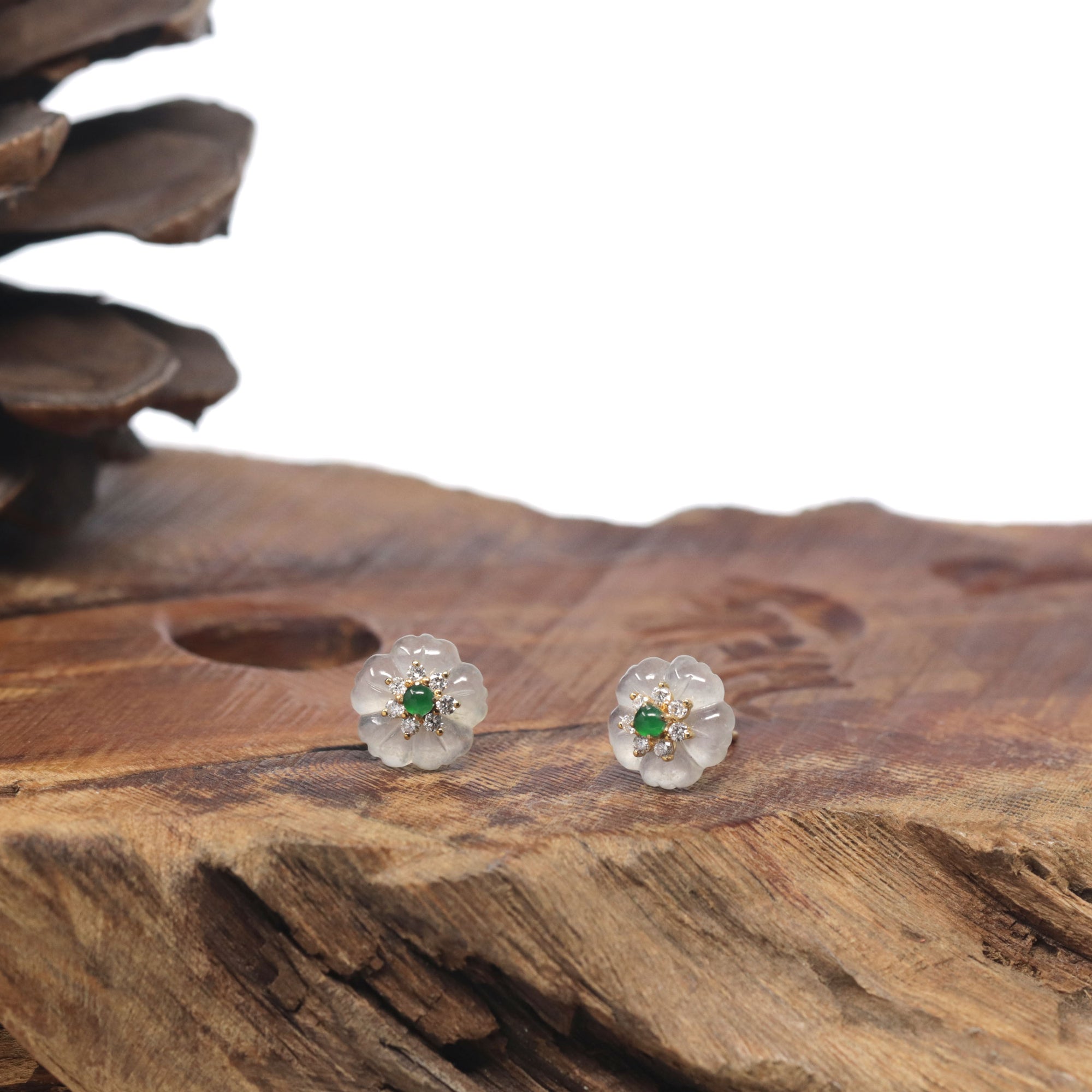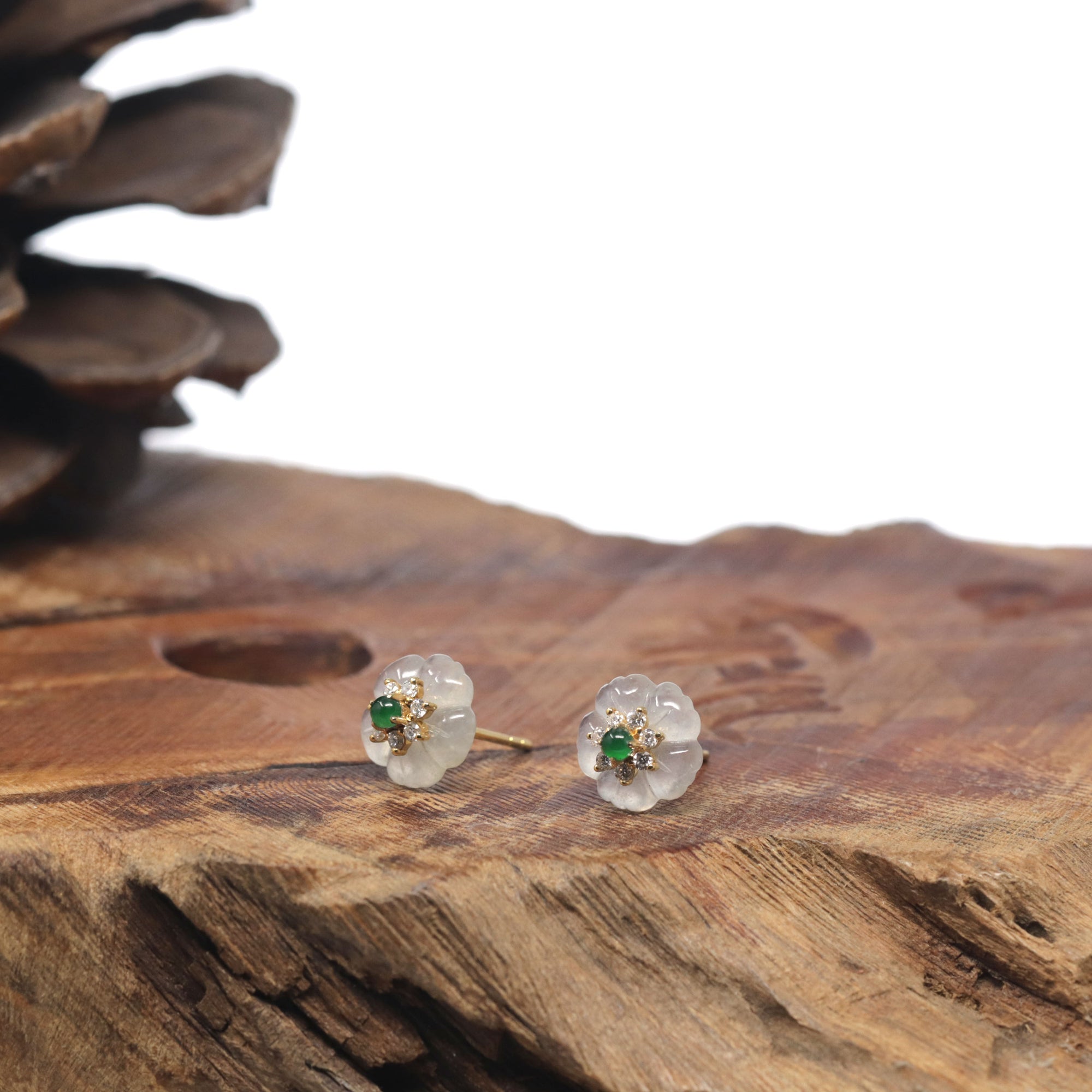 Baikalla™ "Peony Flowers" 14k Solid Gold Real Green Jade Peony Flower Earrings