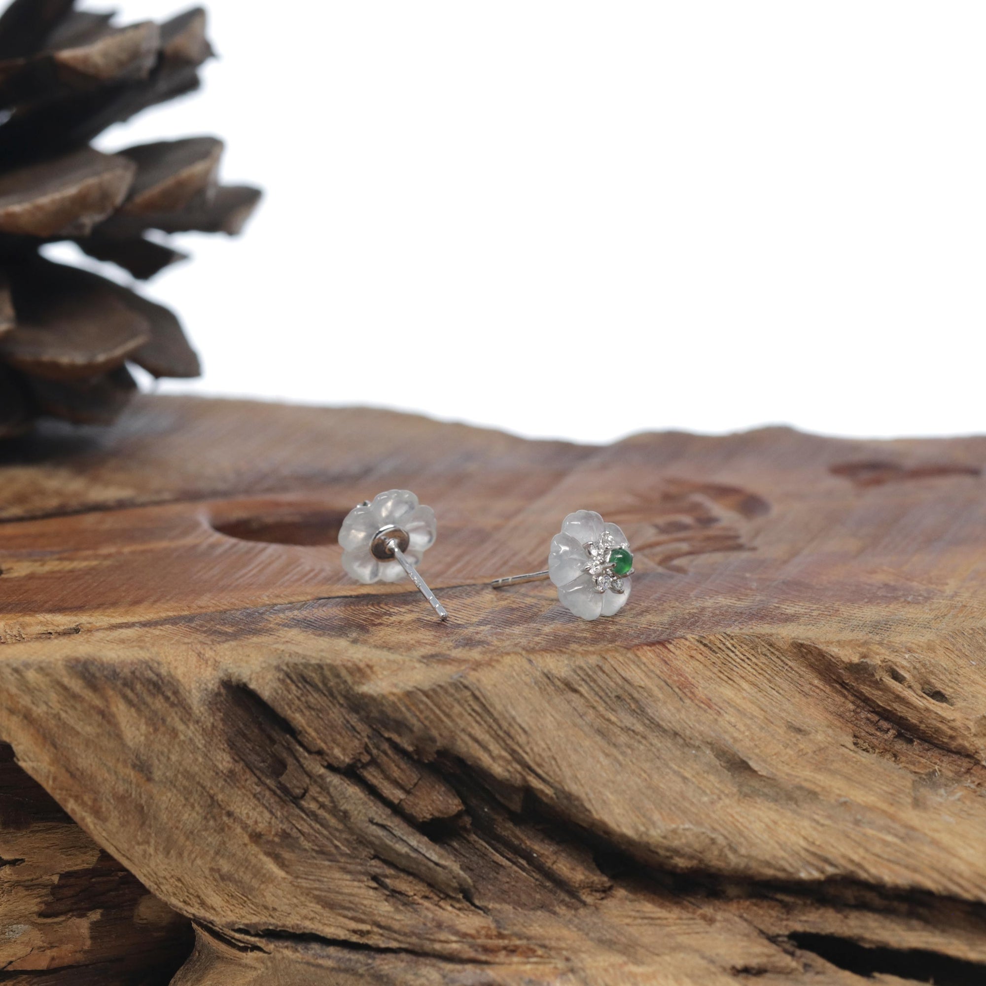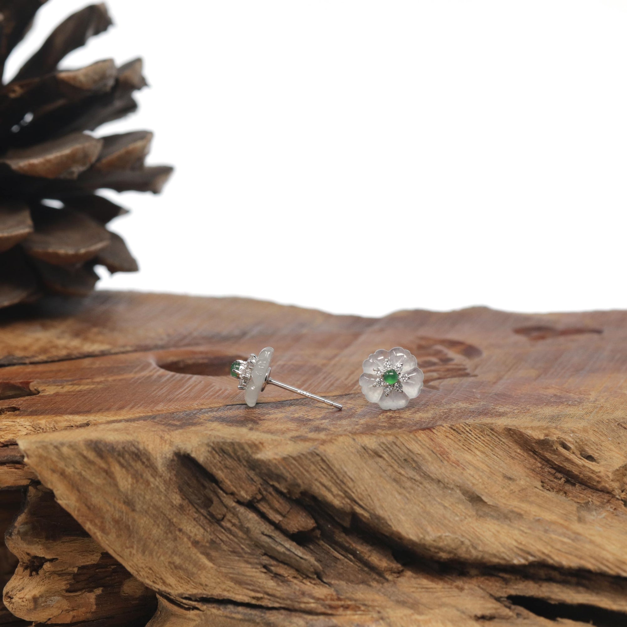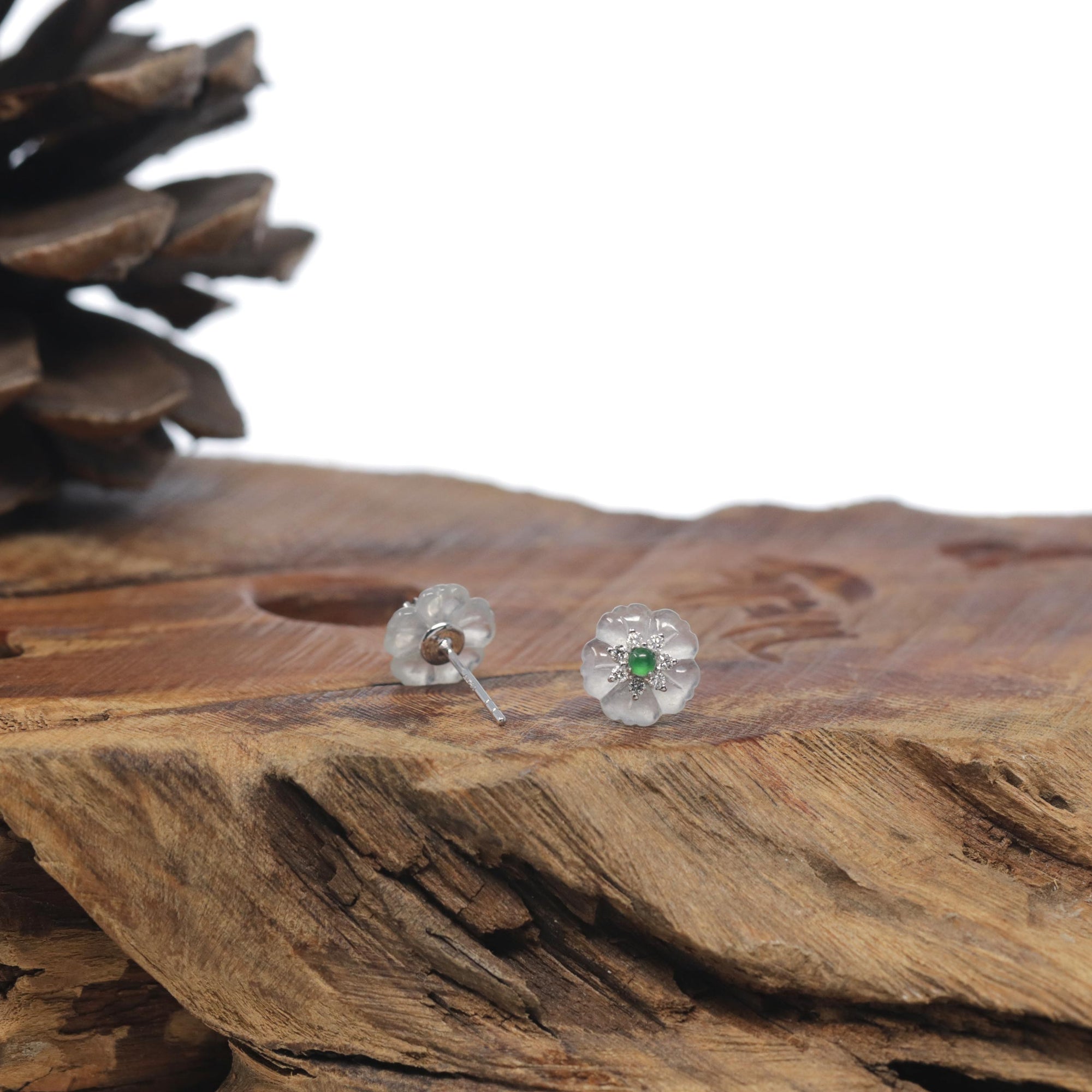 Baikalla 18K White Gold "Classic Stud" Burmese Jadeite Jade Earrings W/ Diamonds & Imperial Jade