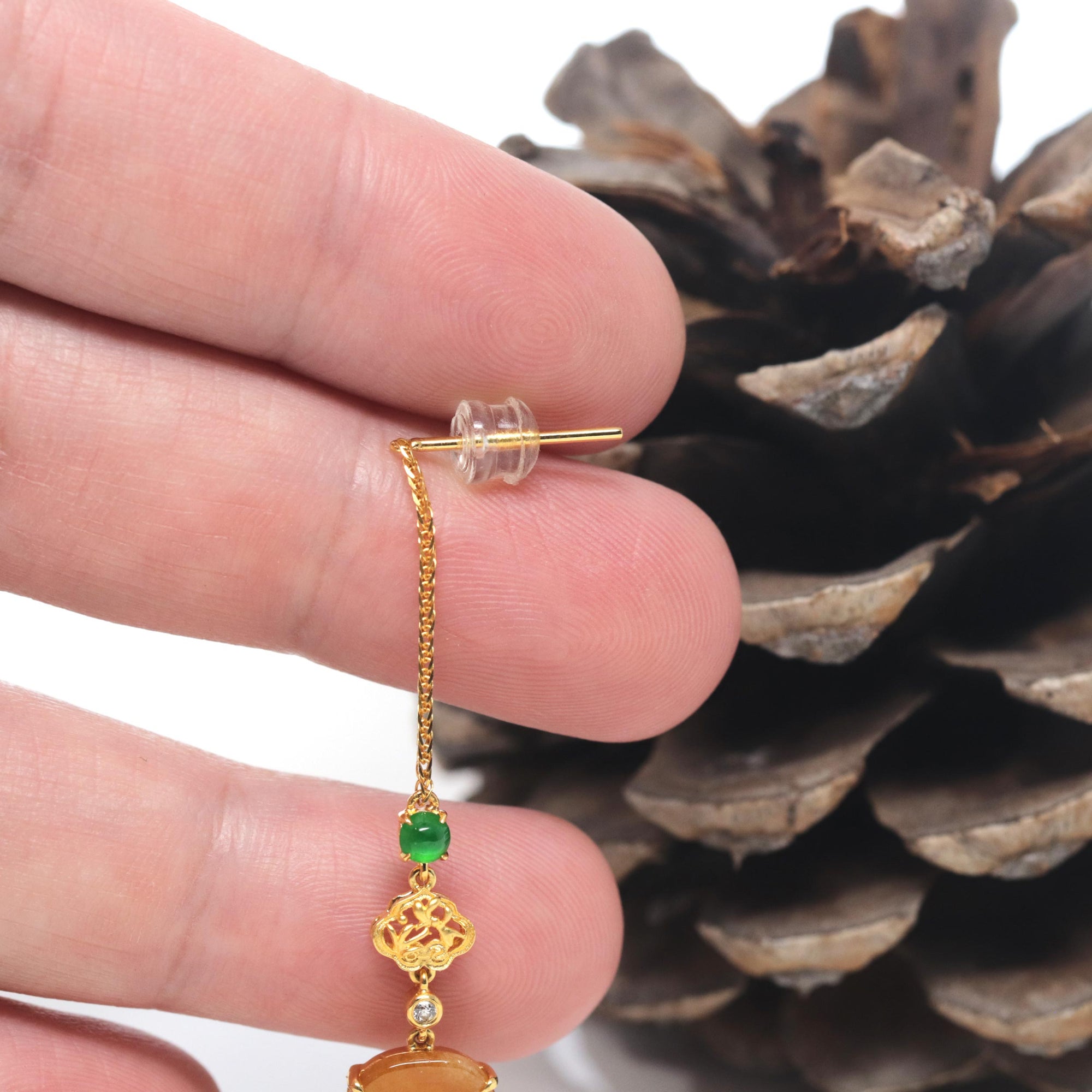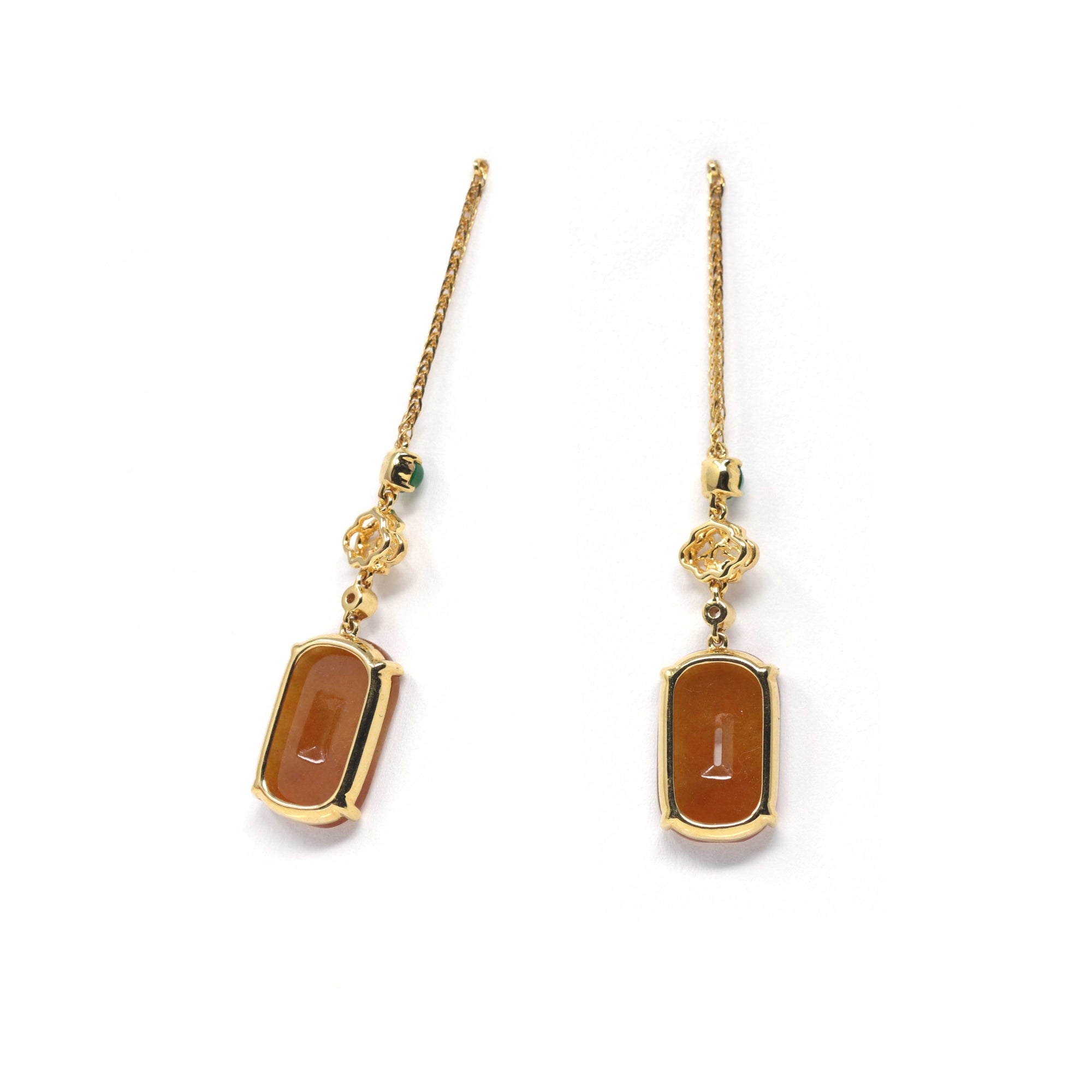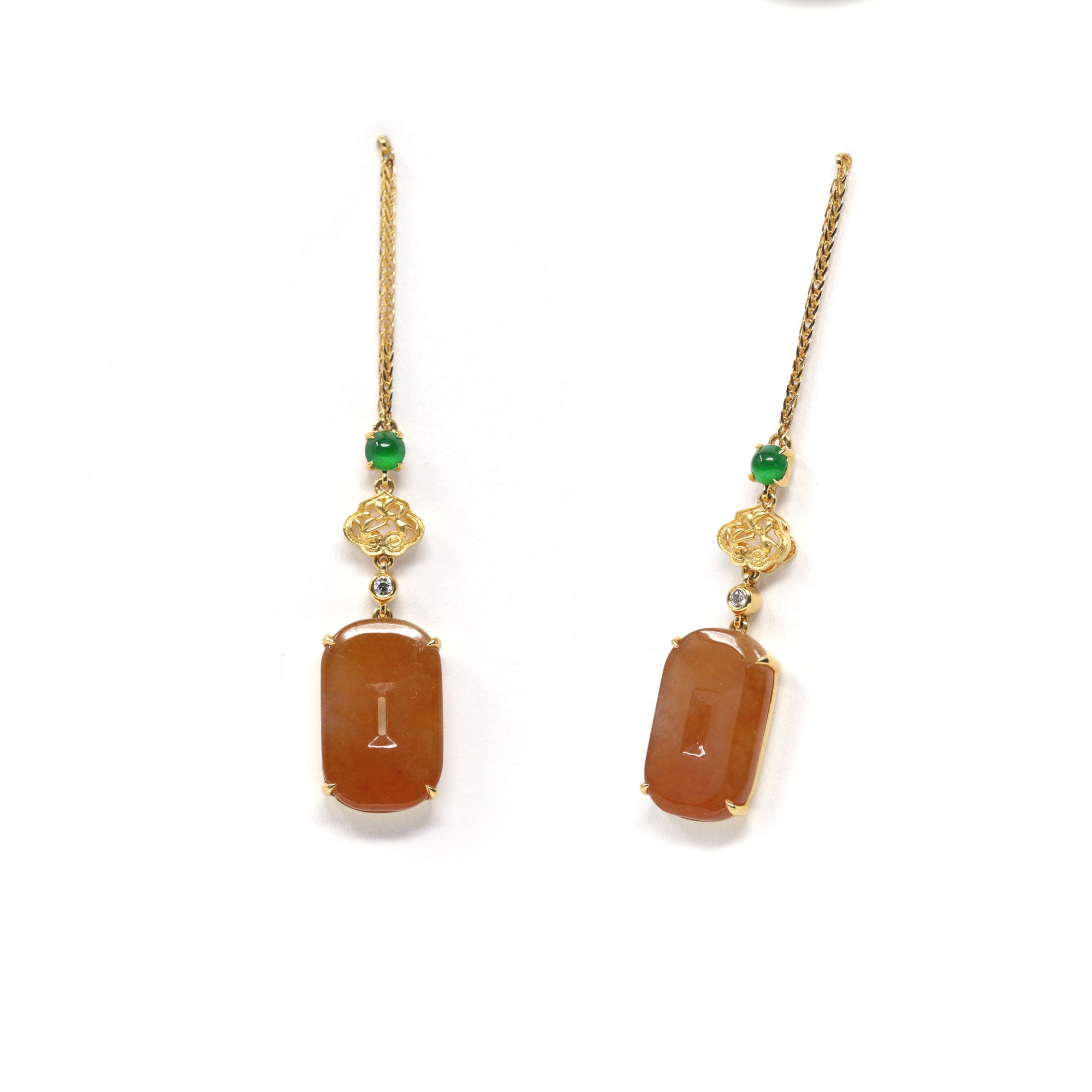 Baikalla 18ky Gold Natural Burmese Reddish Orange Jadeite Jade Square Kou Kou Dangle Earrings w/ Natural Diamonds & Imperial Jade
