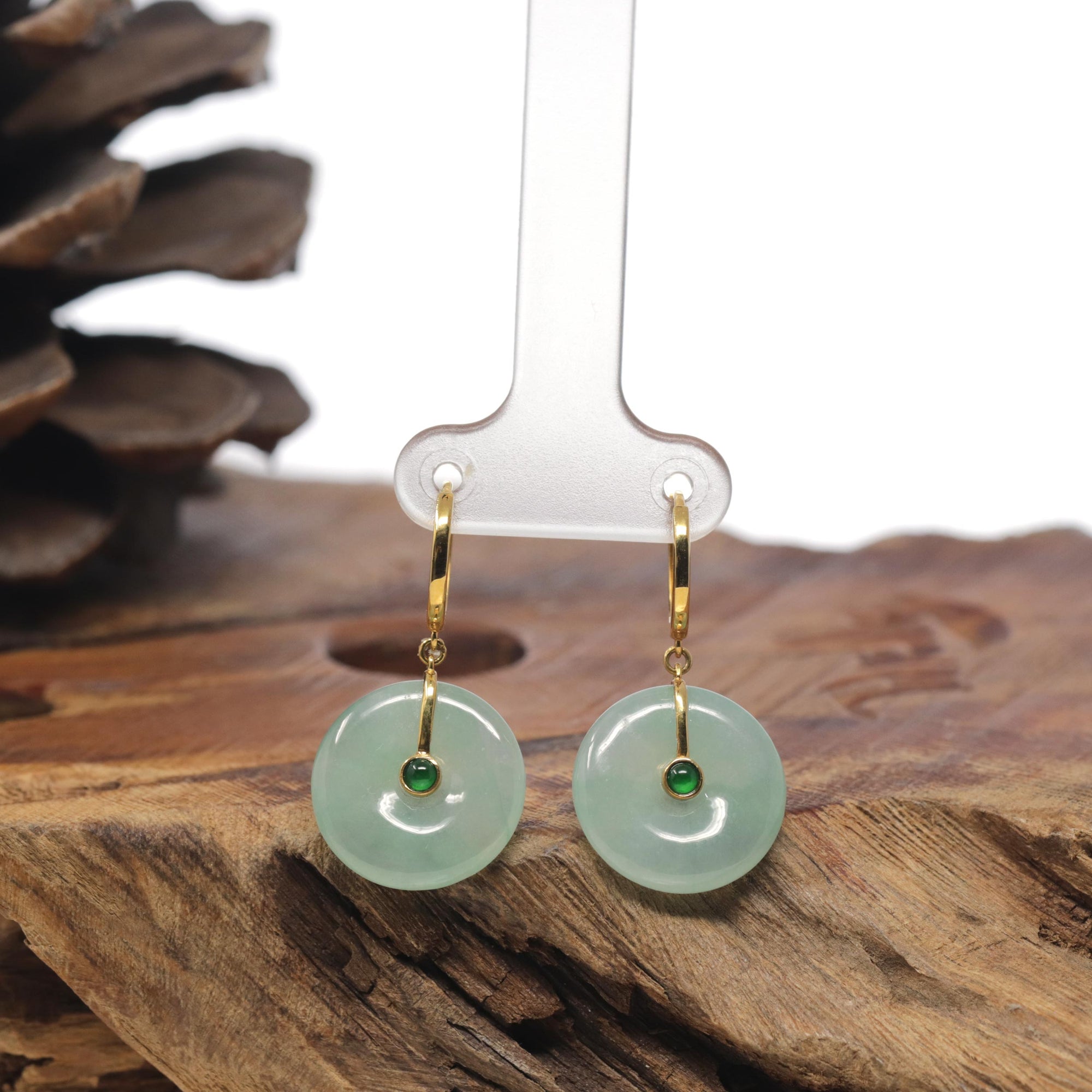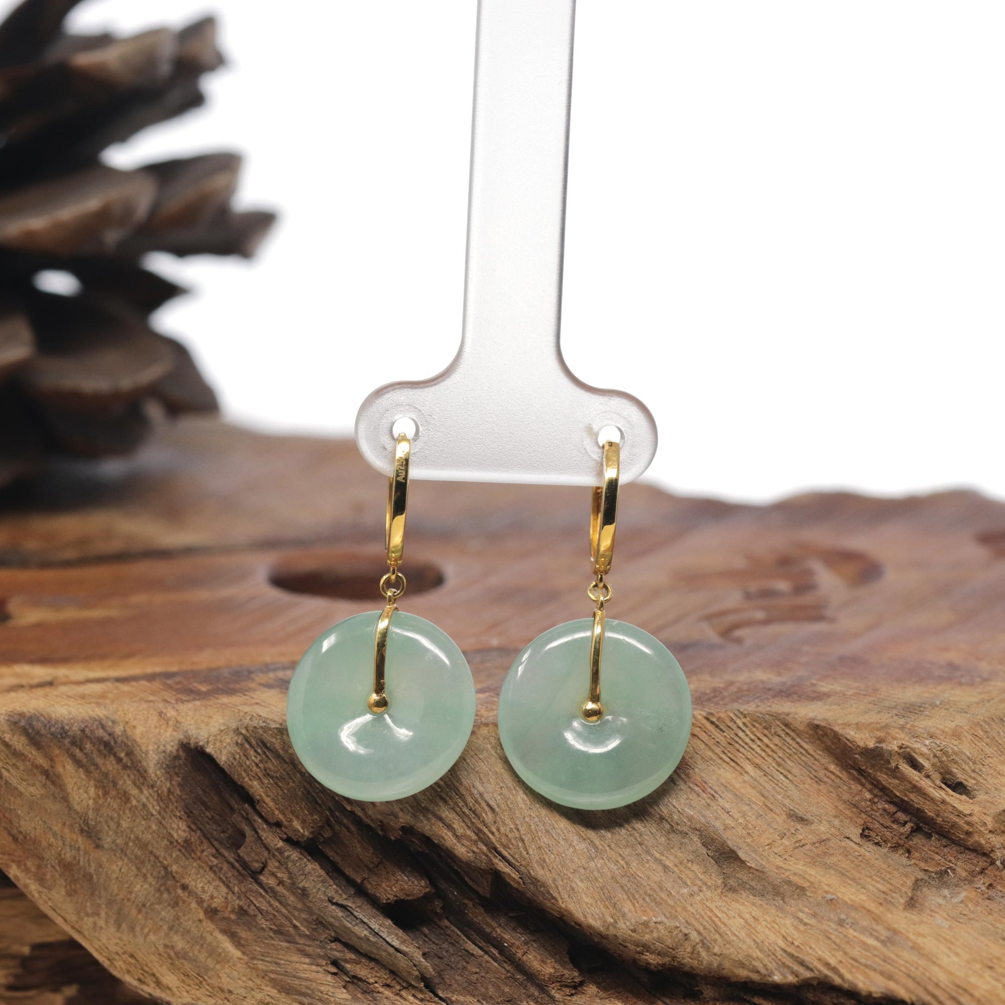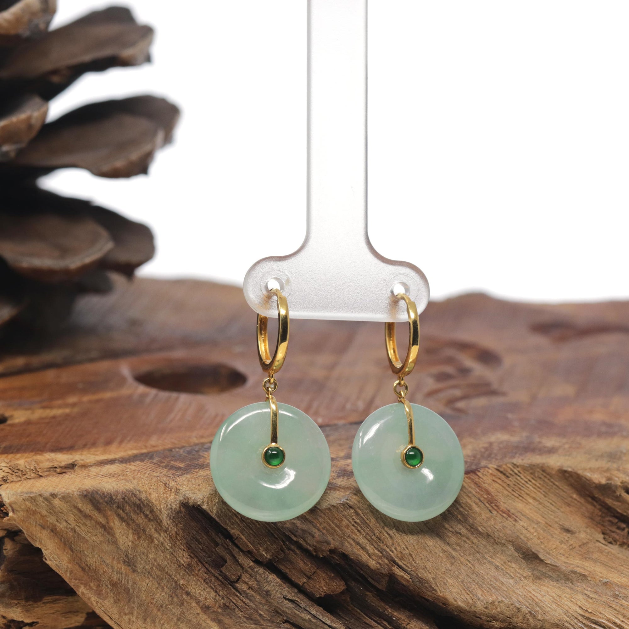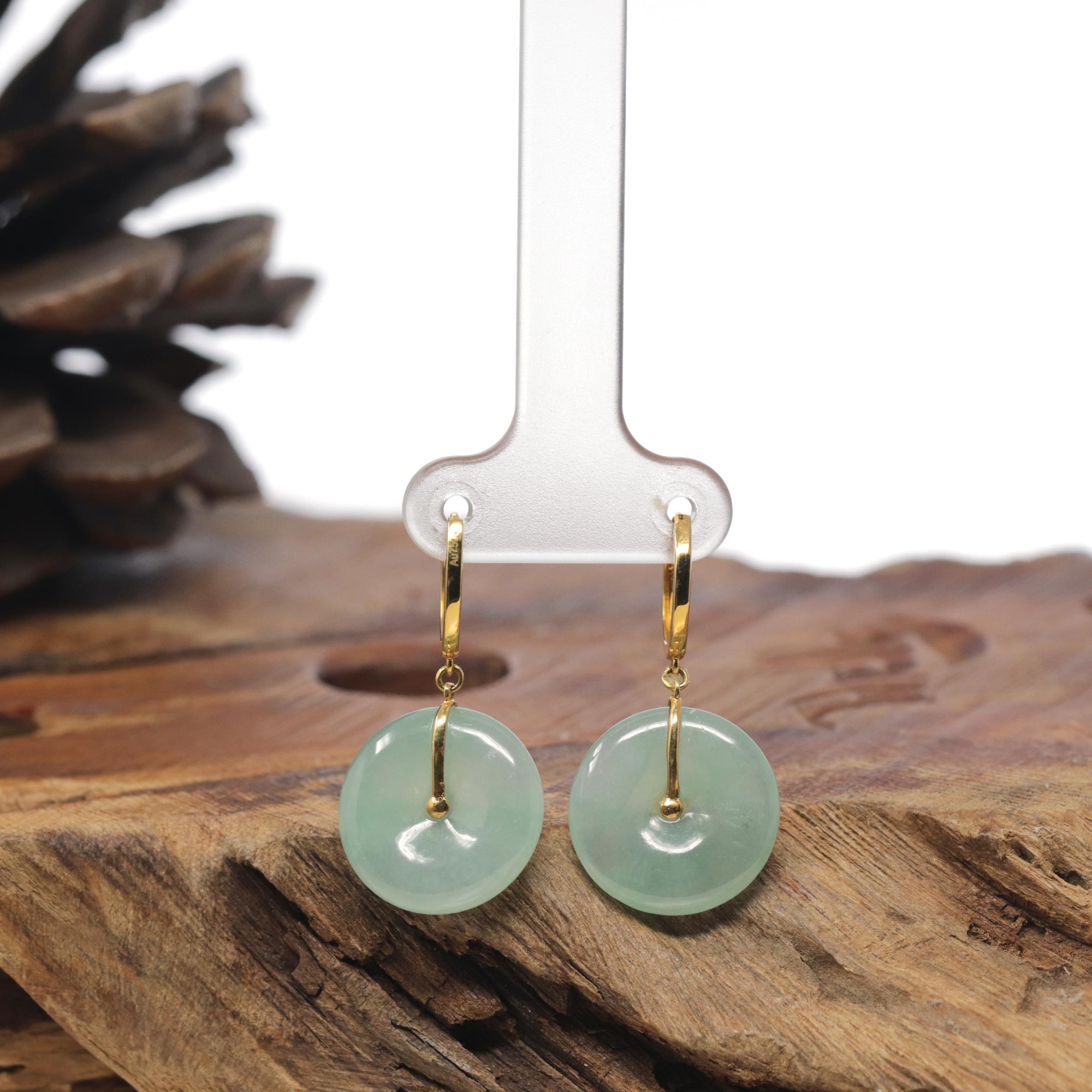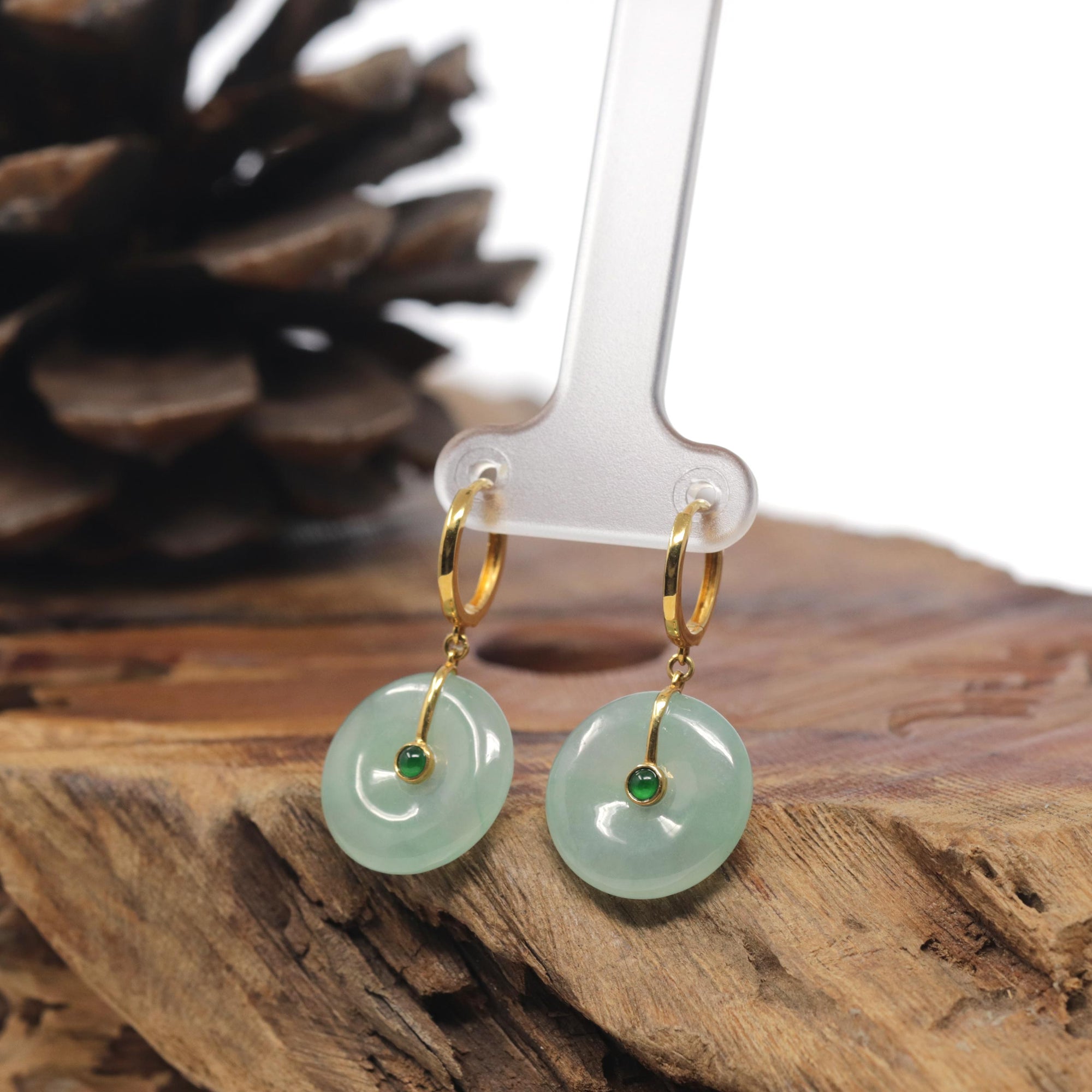 Baikalla 18k Yellow Gold Icy Green "Ping An Kou" Burmese Jadeite Jade Hoop Dangle Earrings