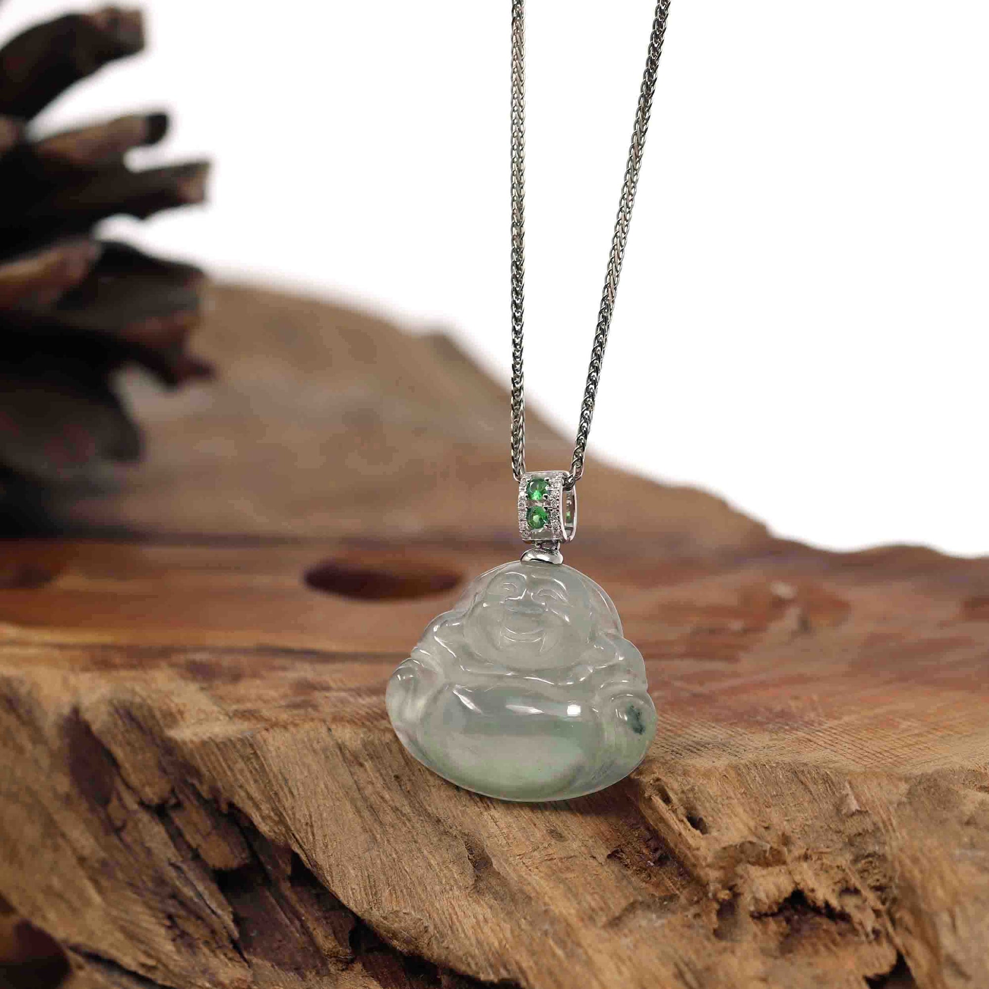 Natural Burmese Jadeite Jade Happy Buddha With 14k White Gold AA Emerald Bail