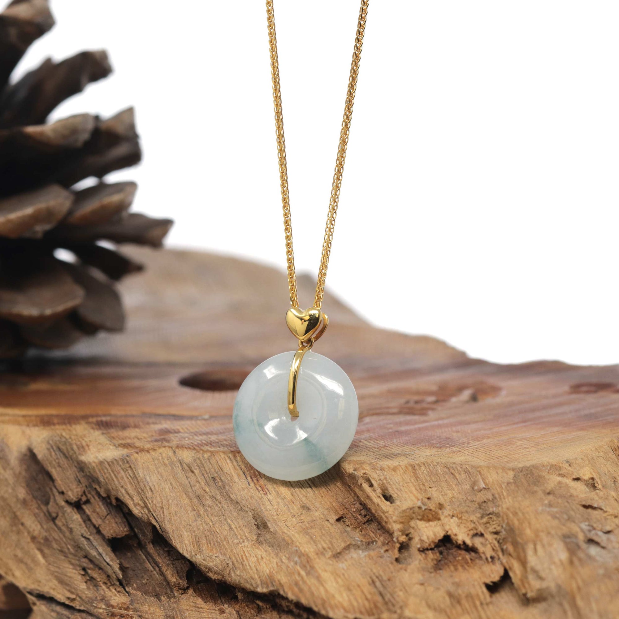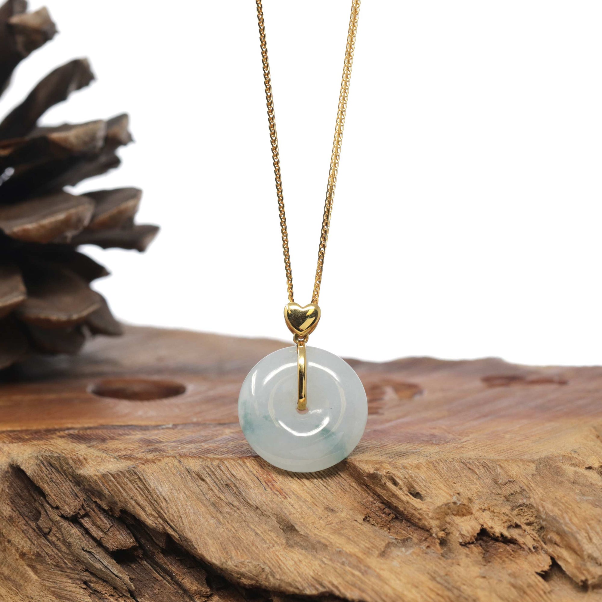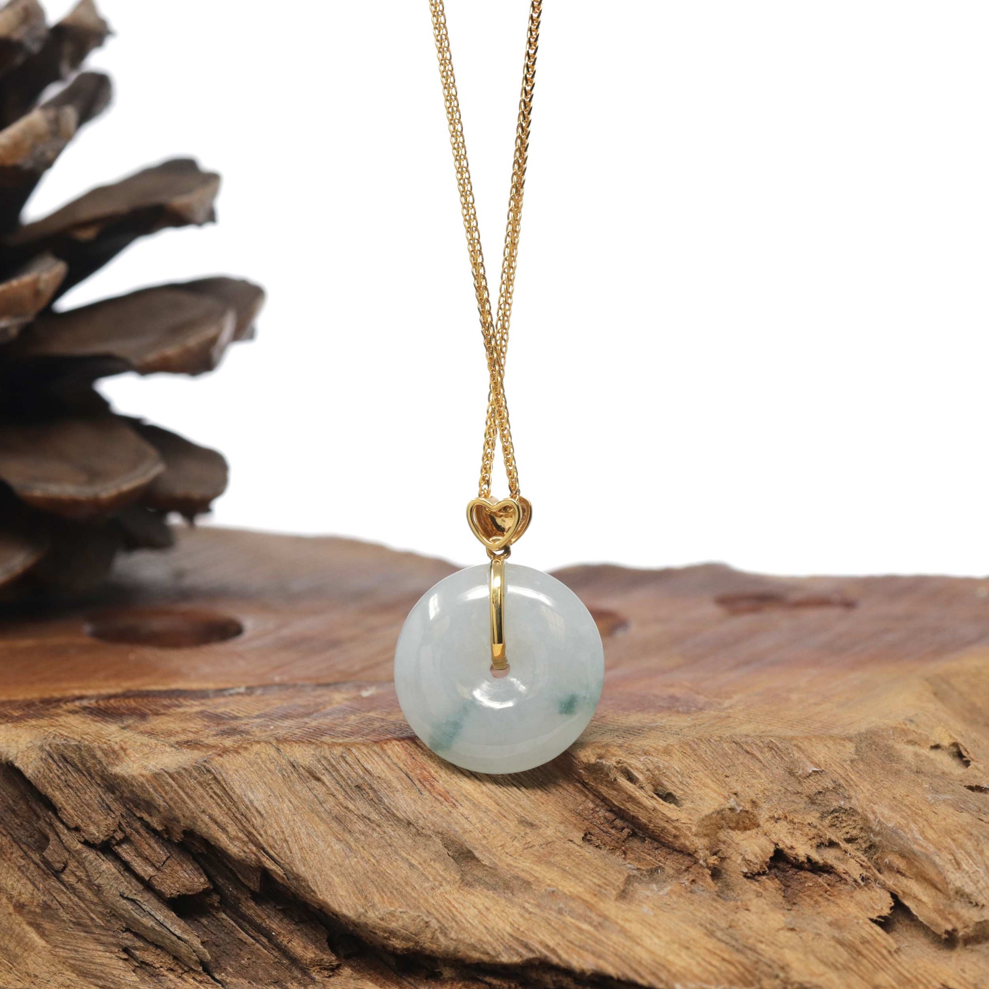 Baikalla 18K Yellow Gold "Ping An Kou" (Good Luck Button) Natural Icy Light Blue-Green Flower Jadeite Jade Pendant W/ Heart Bail