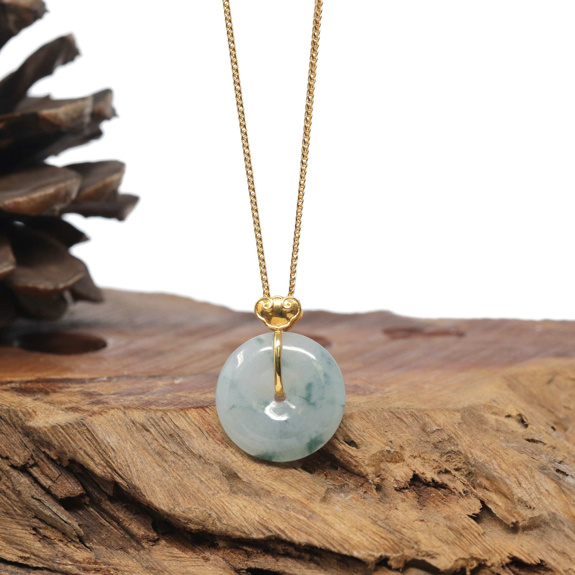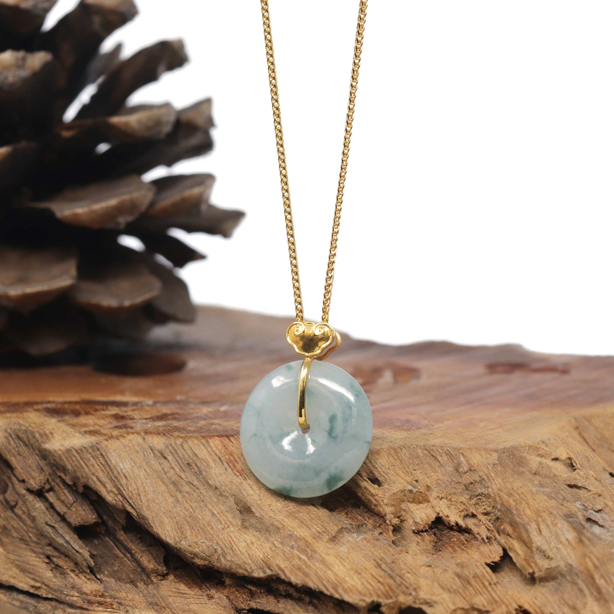 Baikalla 18K Yellow Gold "Ping An Kou" (Good Luck Button) Natural Icy Blue-Green Flower Jadeite Jade Pendant
