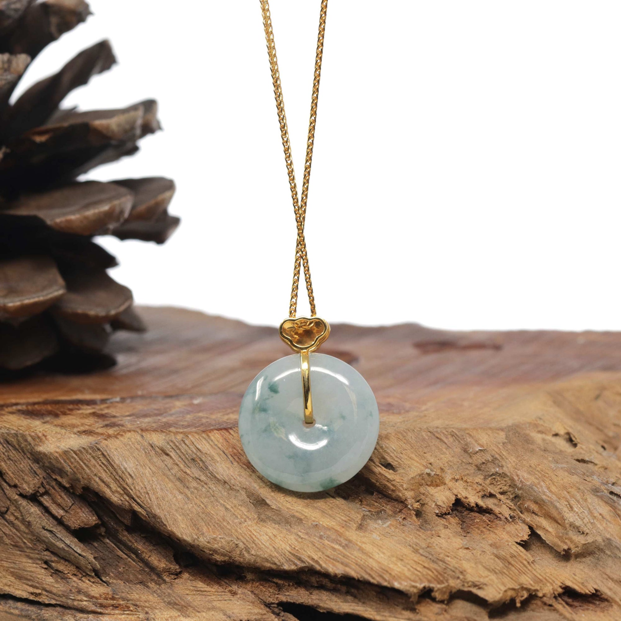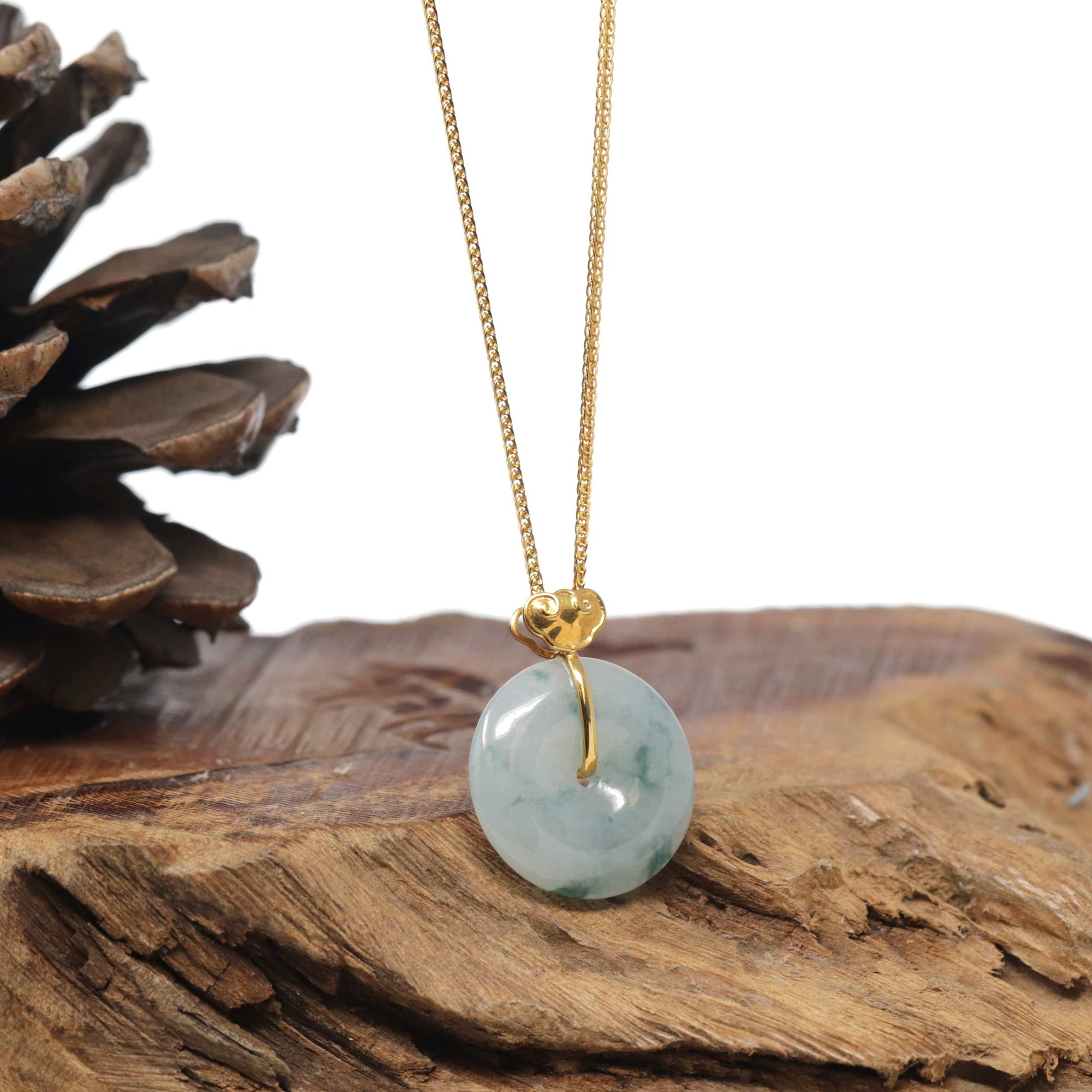 Baikalla 18K Yellow Gold "Ping An Kou" (Good Luck Button) Natural Icy Light Blue-Green Flowers Jadeite Jade Pendant