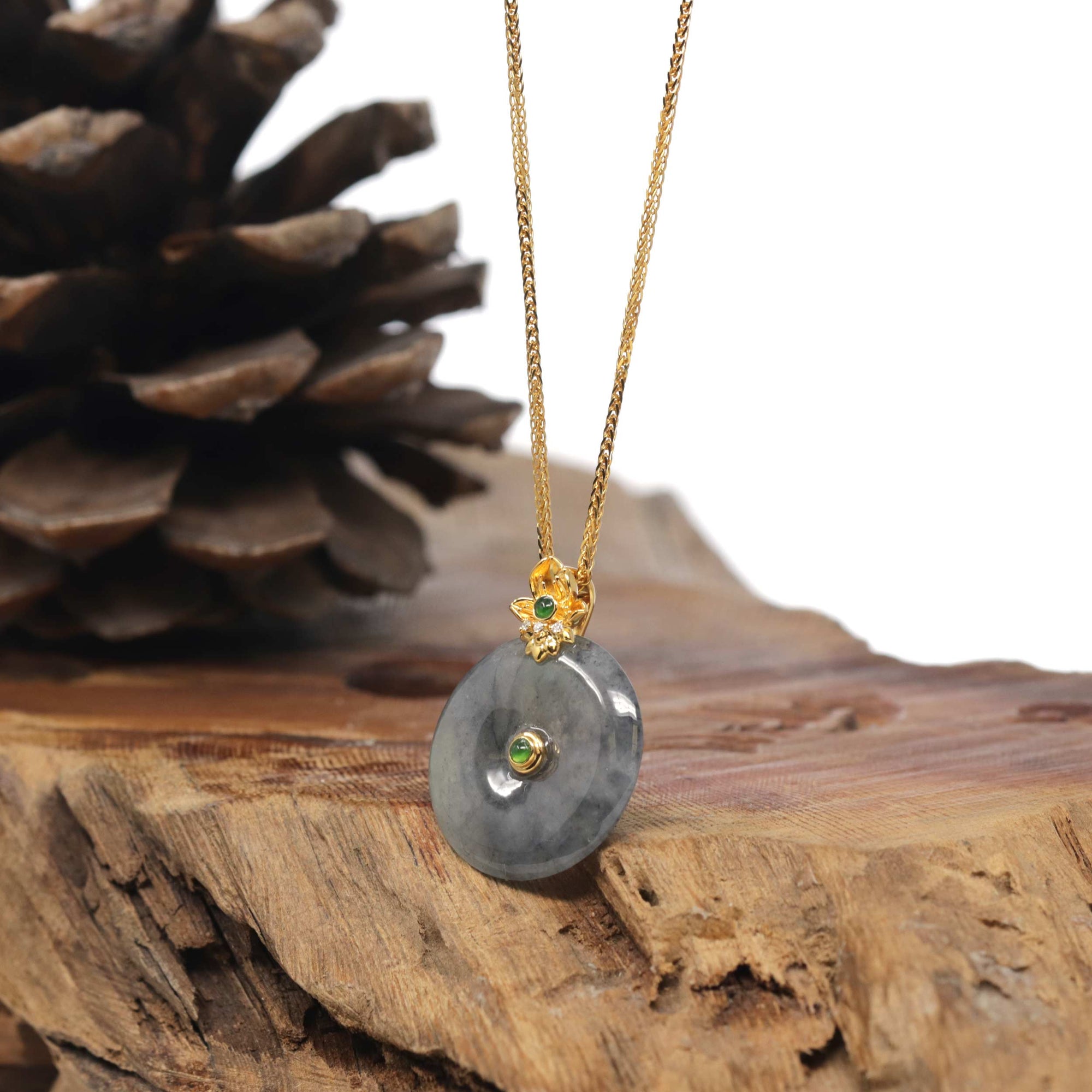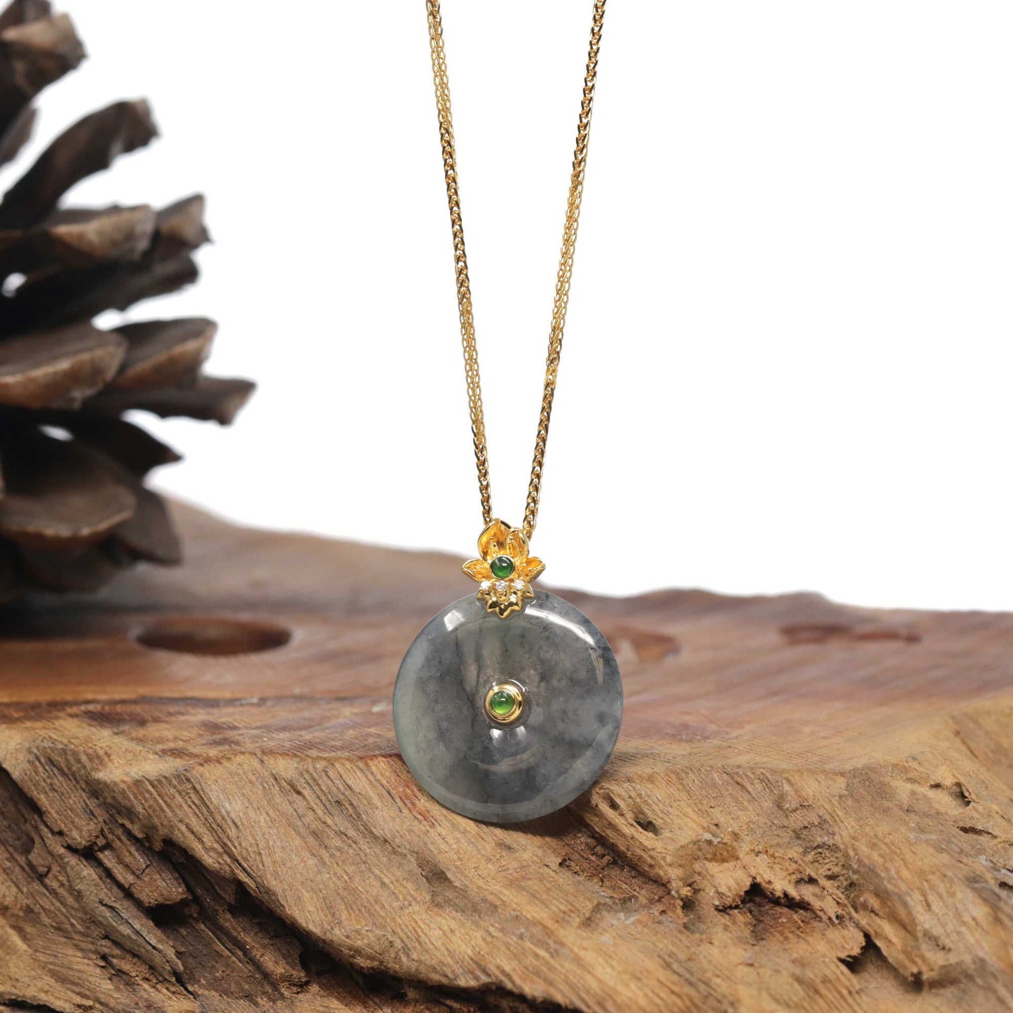 Baikalla 18K Yellow Gold "Ping An Kou" (Good Luck Button) Natural Deep Blue-Green Flower Jadeite Jade Pendant W/ Natural Diamonds & Ruby
