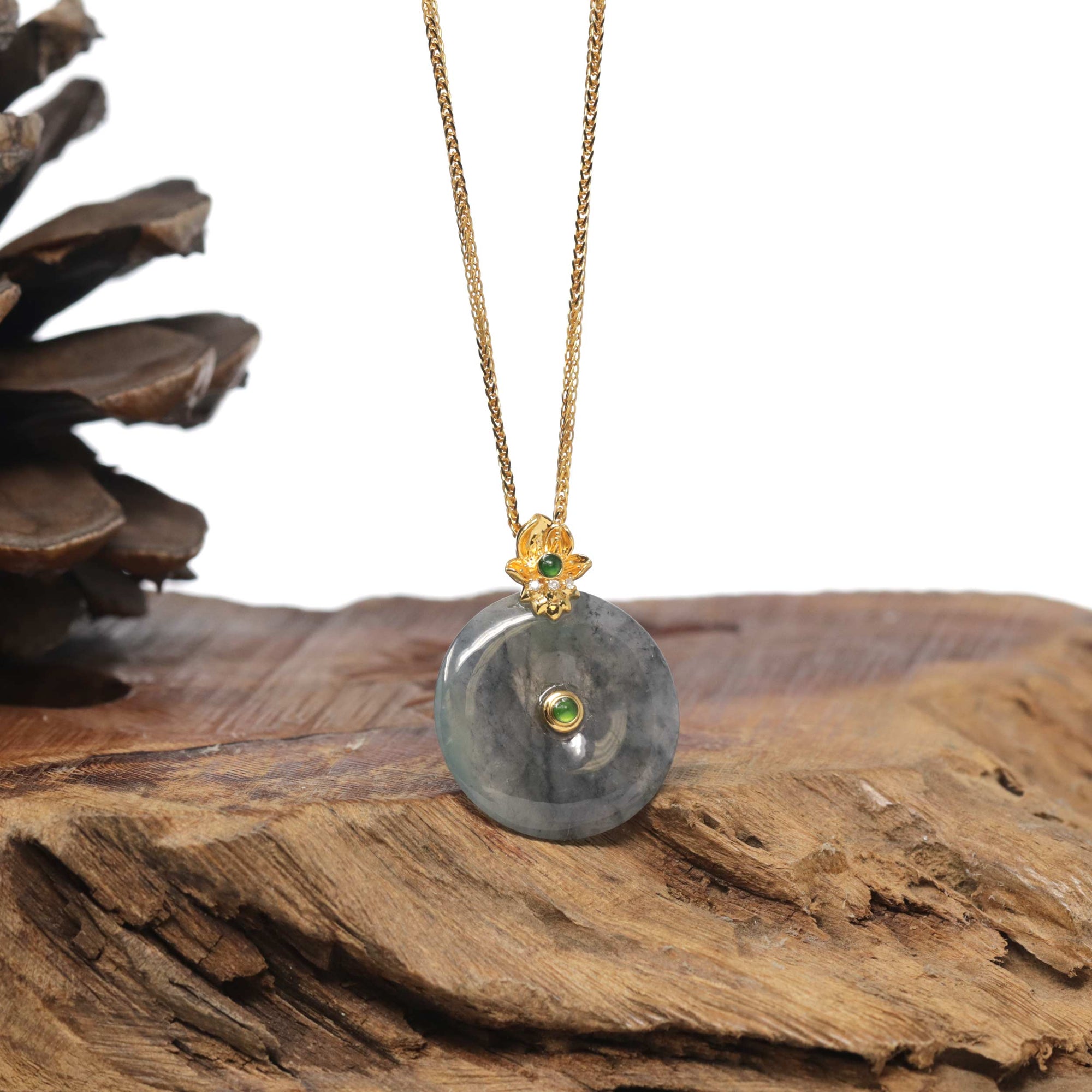 Baikalla 18K Yellow Gold "Ping An Kou" (Good Luck Button) Natural Icy Blue-Green Flower Jadeite Jade Pendant