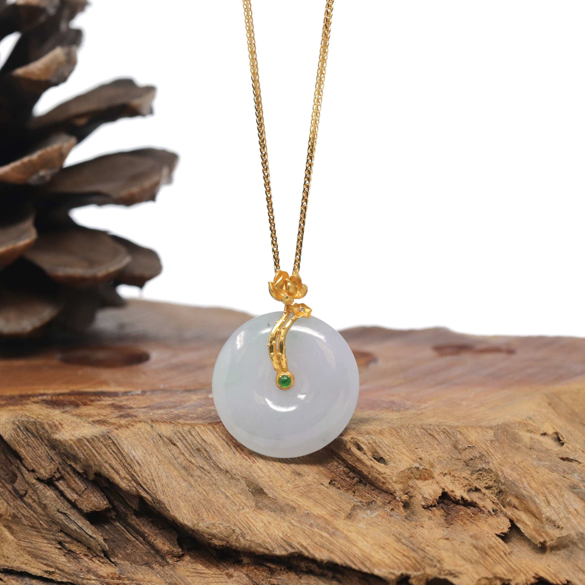 Baikalla 18K Yellow Gold "Ping An Kou" (Good Luck Button) Natural Icy Light Blue-Green Flowers Jadeite Jade Pendant