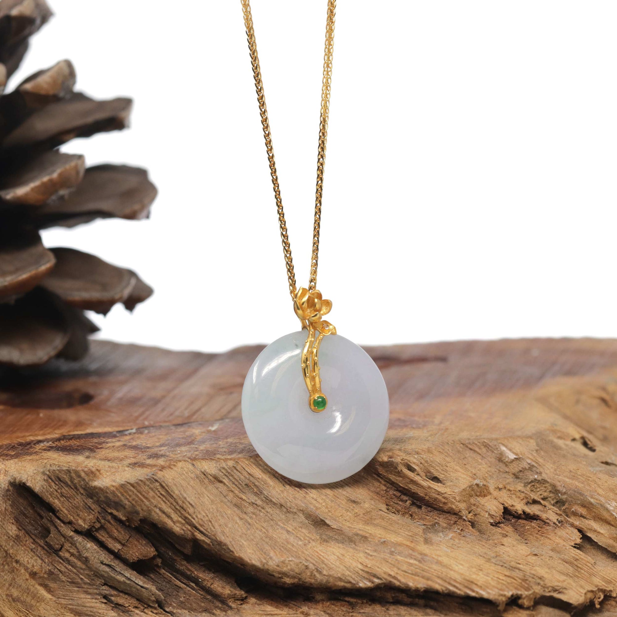 Baikalla "Double Ping An Kou" (Good Luck Button) 18K Yellow Gold Icy White Jadeite Jade Pendant W/ Imperial Jade & Lotus Bail