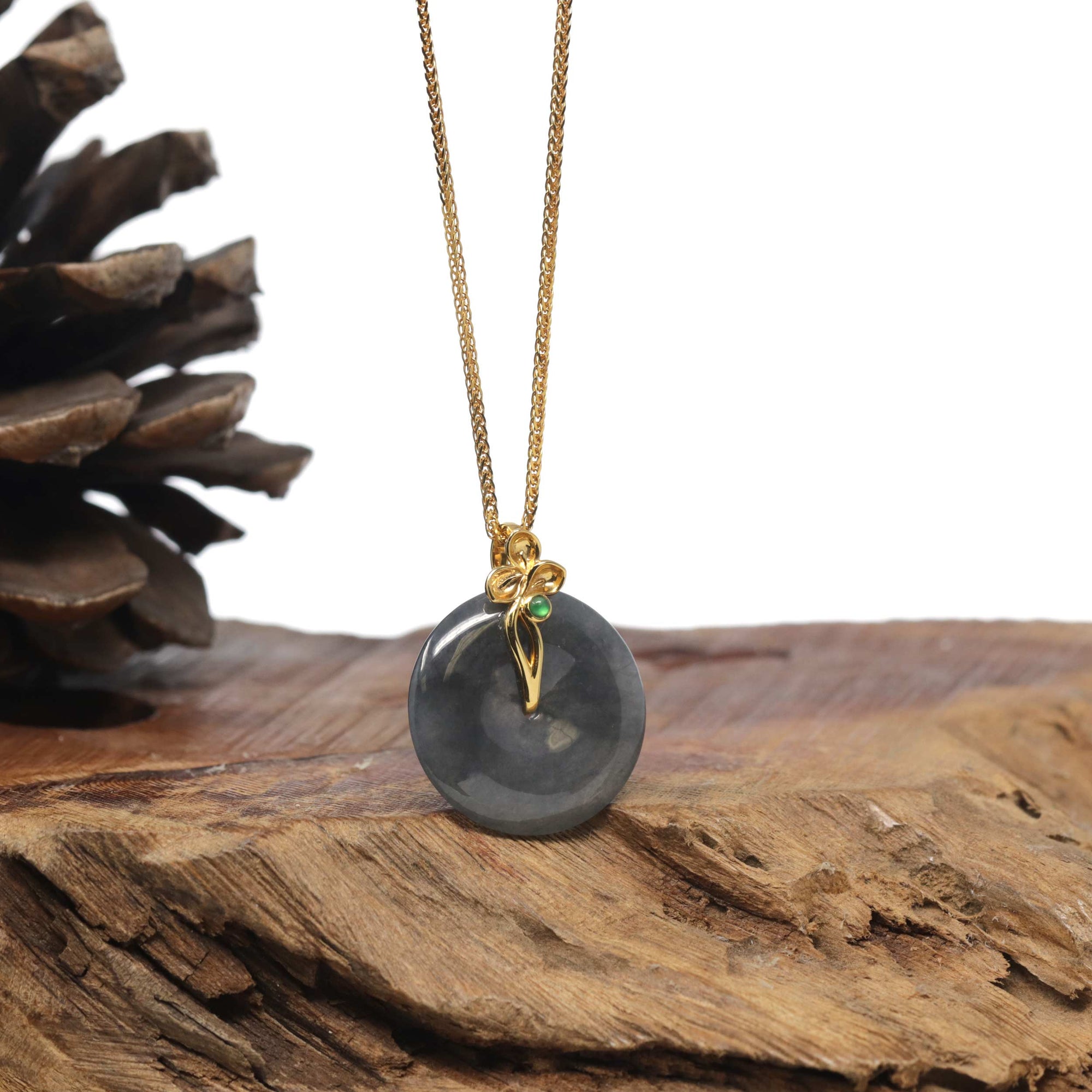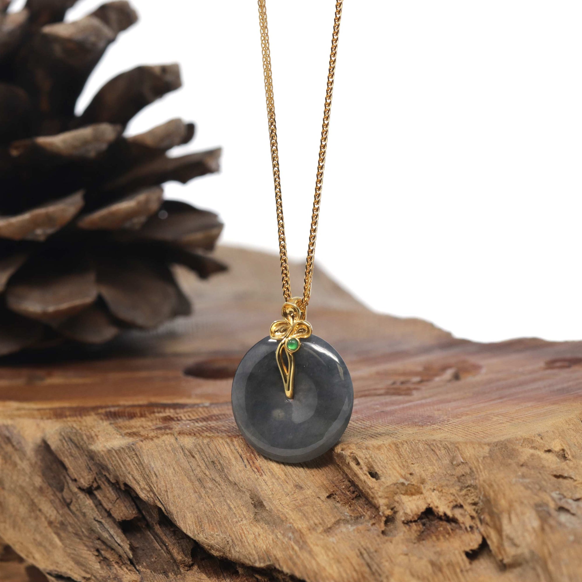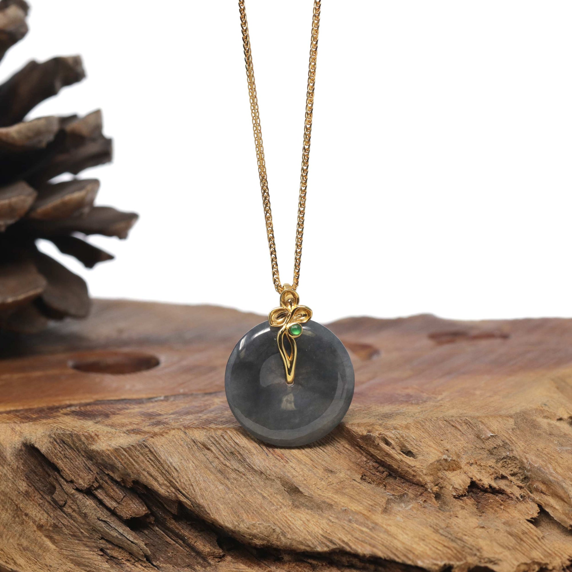 Baikalla 18K Yellow Gold "Ping An Kou" (Good Luck Button) Natural Black Wuji Jadeite Jade Pendant W/ Imperial Green Jade