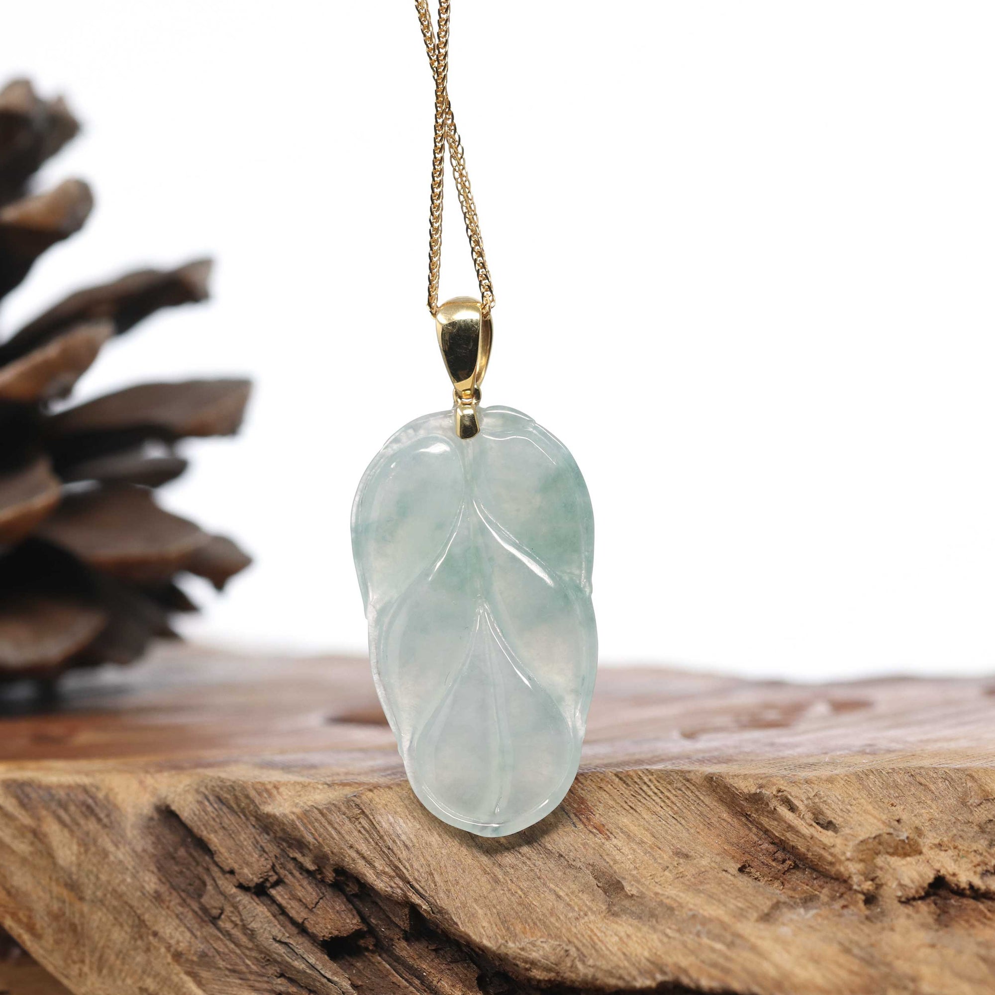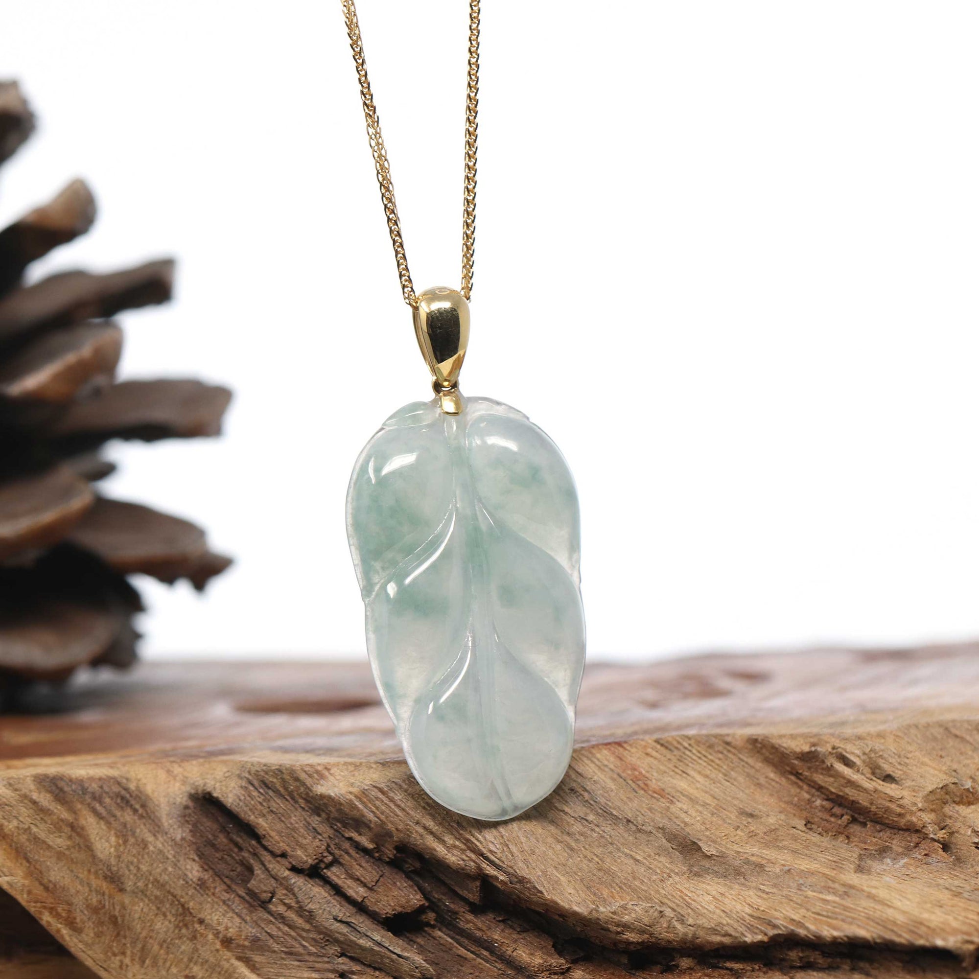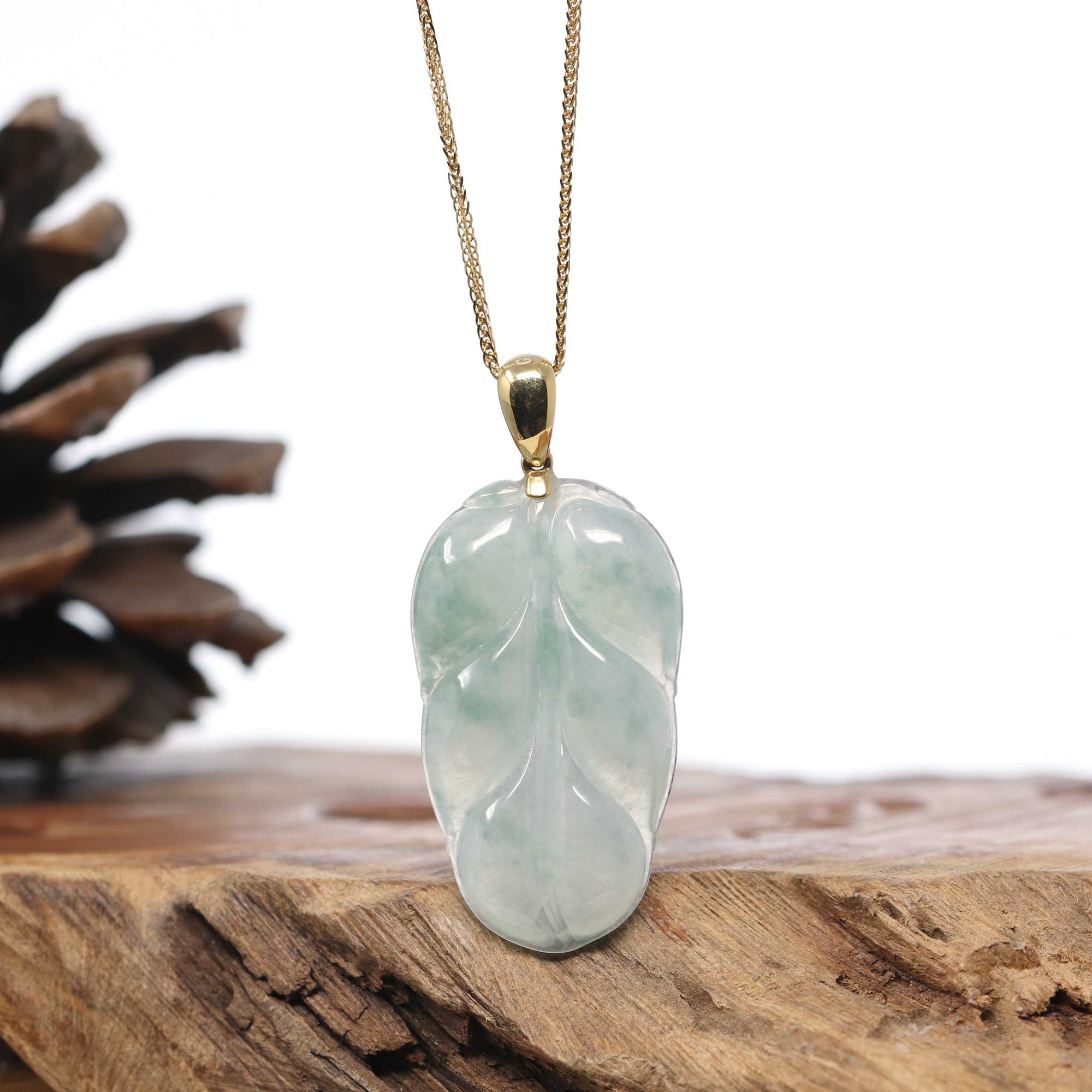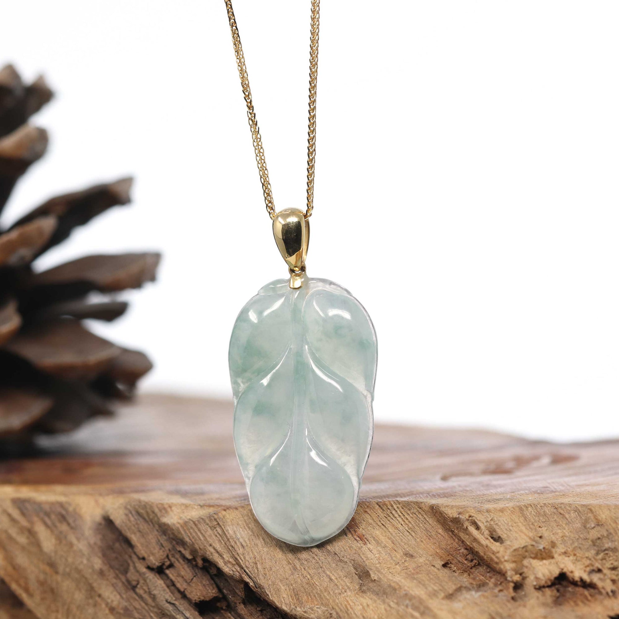 Genuine Ice Green Jadeite Jade Jin Zhi Yu Ye (Leaf) Necklace With Yellow Gold Bail