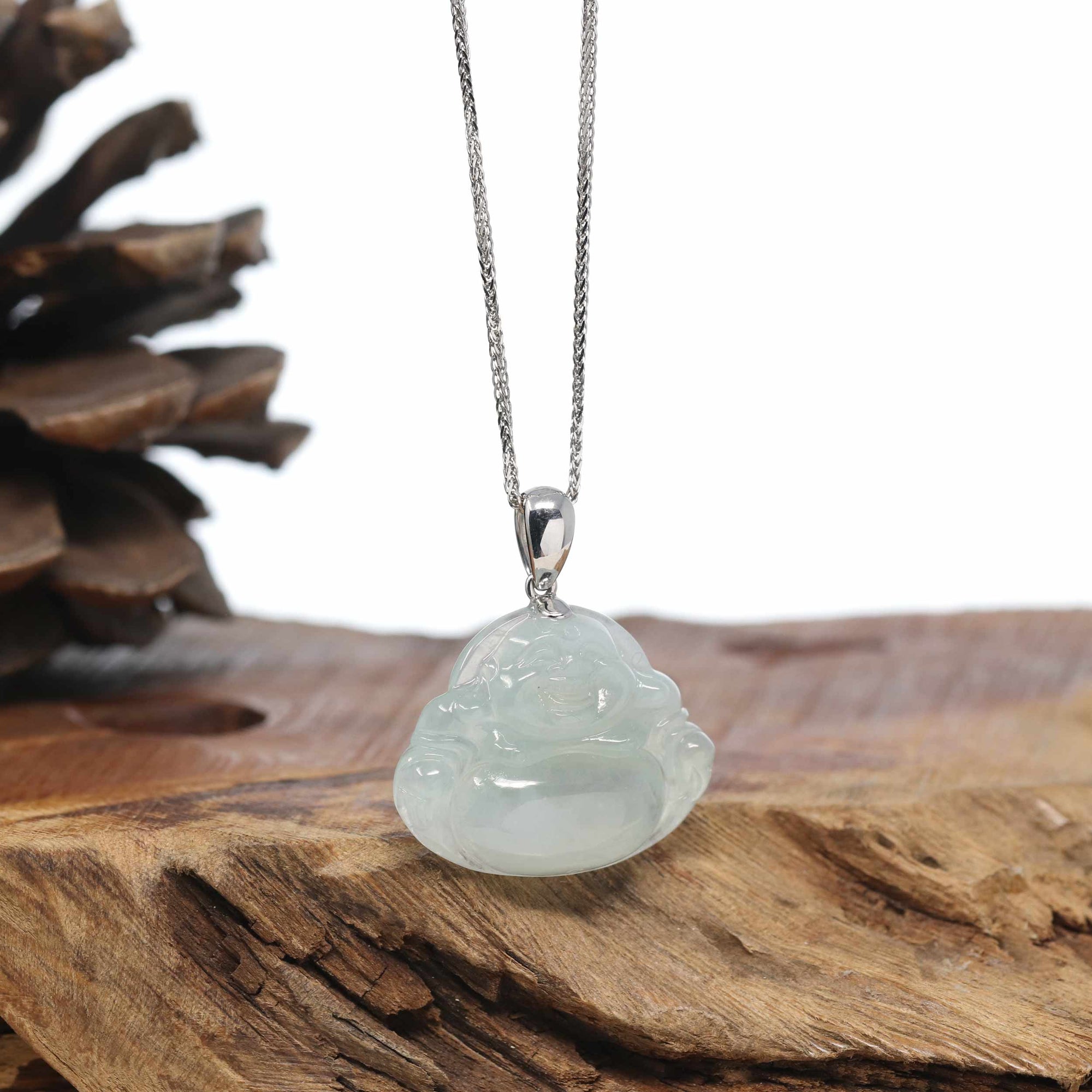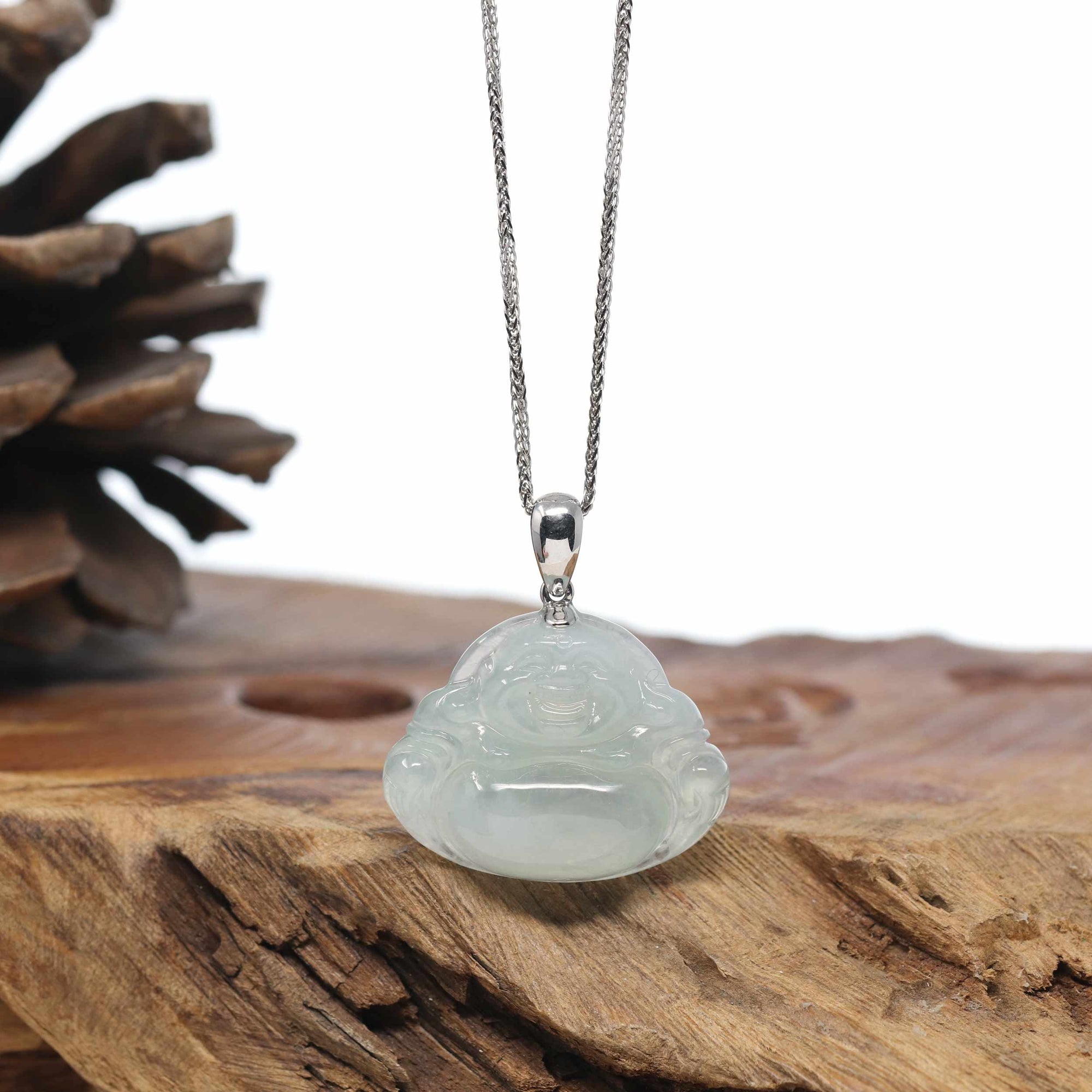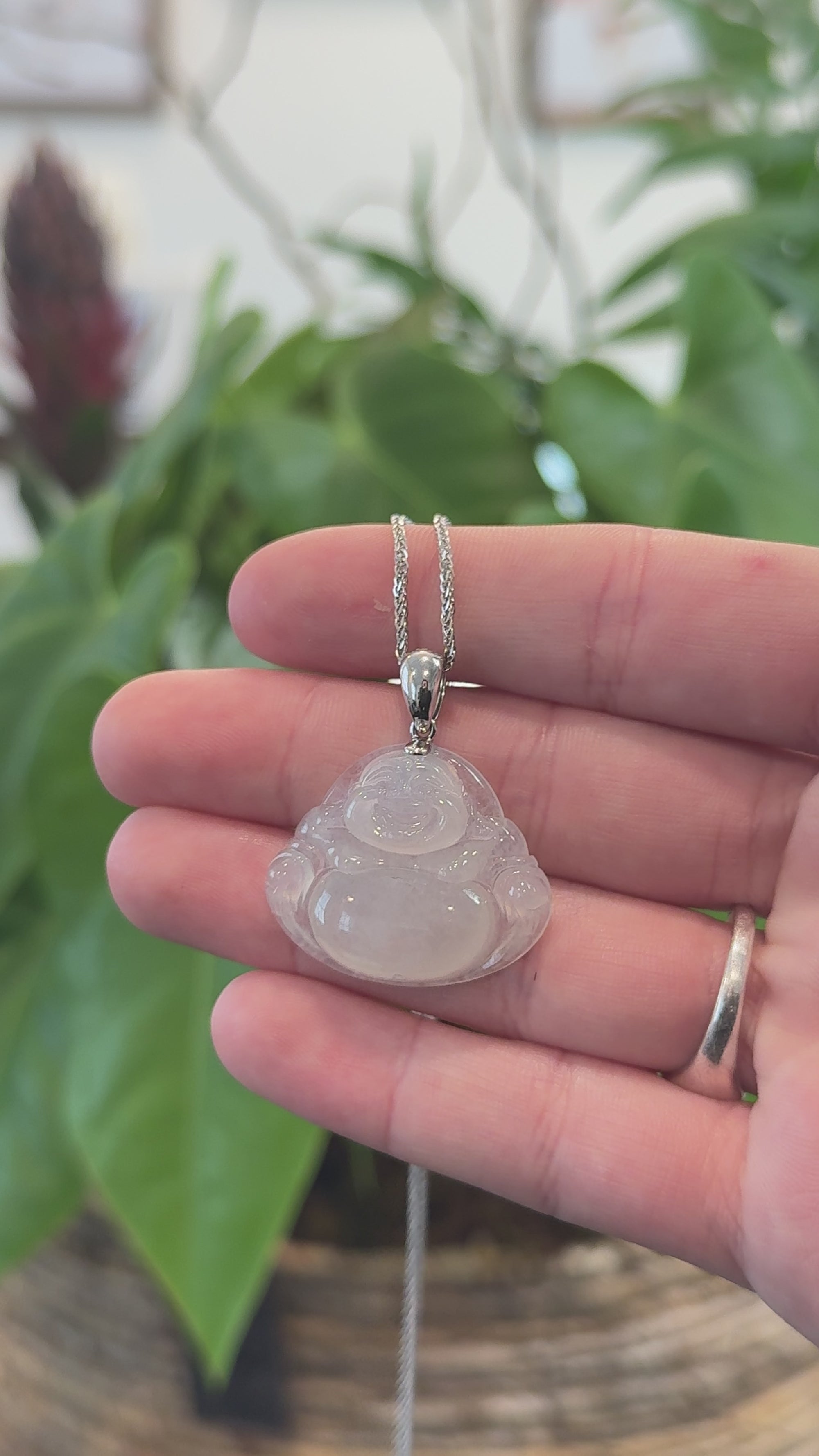 "Laughing Buddha" Genuine Vibrant Lavender Green, Jadeite Jade Buddha Pendant Necklace With 14k White Gold Bail