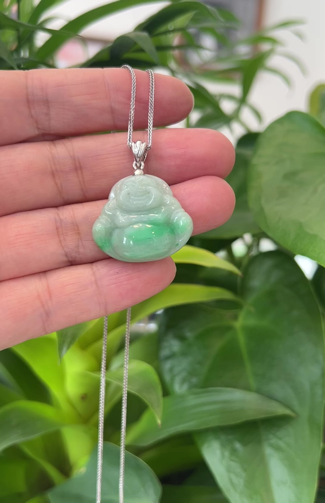 "Laughing Buddha" Genuine Vibrant Green Jadeite Buddha Pendant Necklace With Sterling Silver Bail