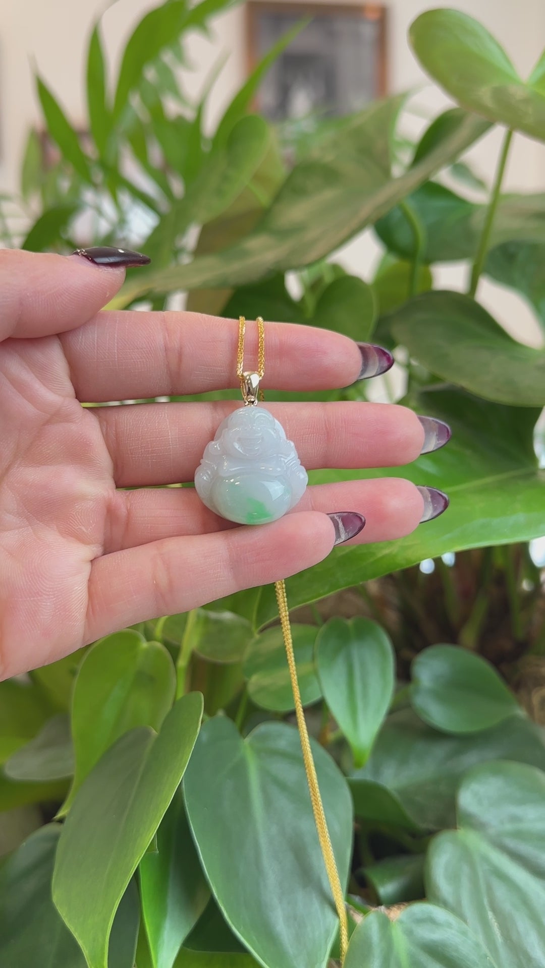 Natural Burmese Jadeite Jade Happy Buddha With 14k Yellow Gold AA Emerald Bail
