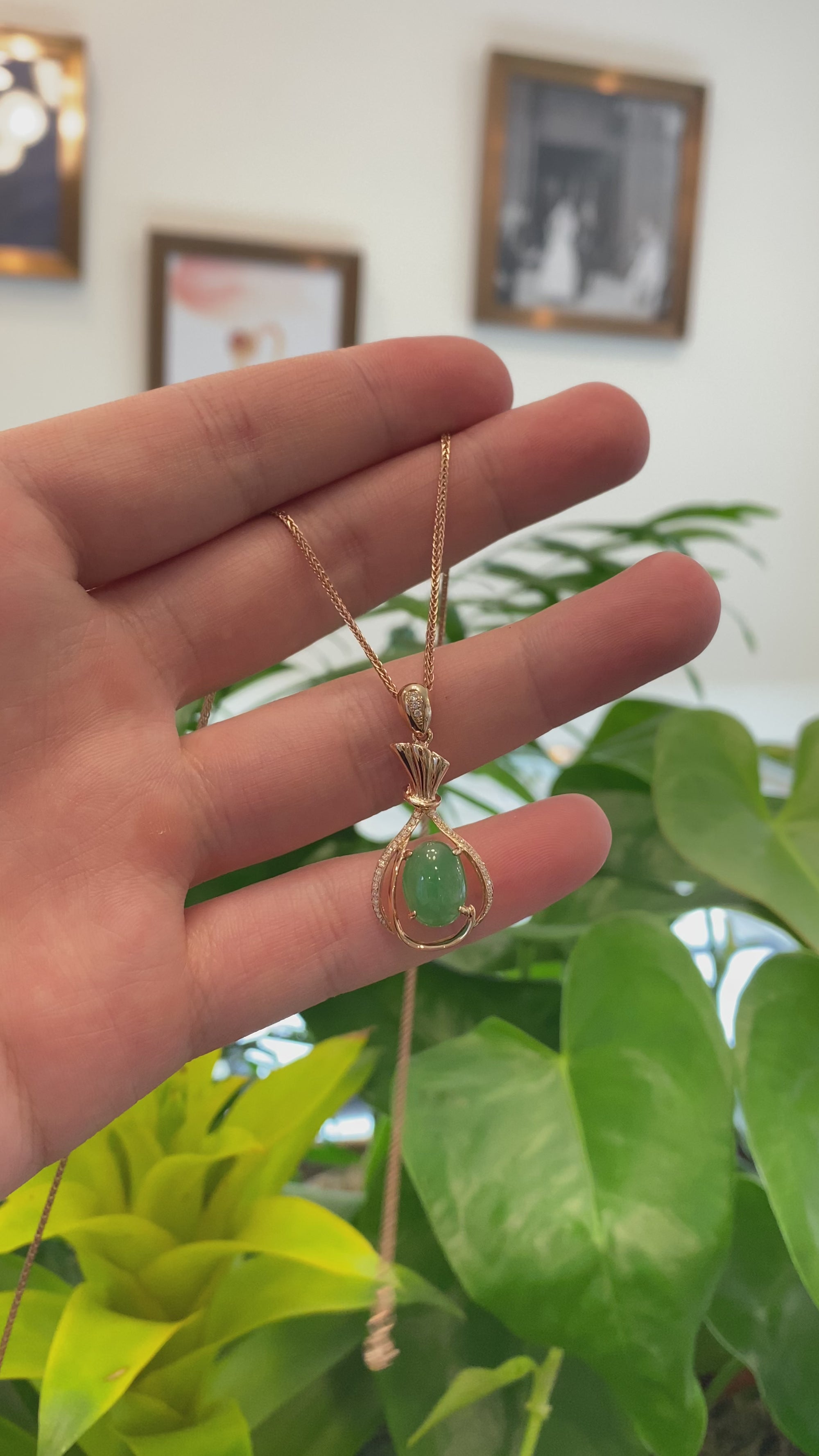 18K Rose Gold Oval Imperial Jadeite Jade Money Bag Style Necklace with Diamonds