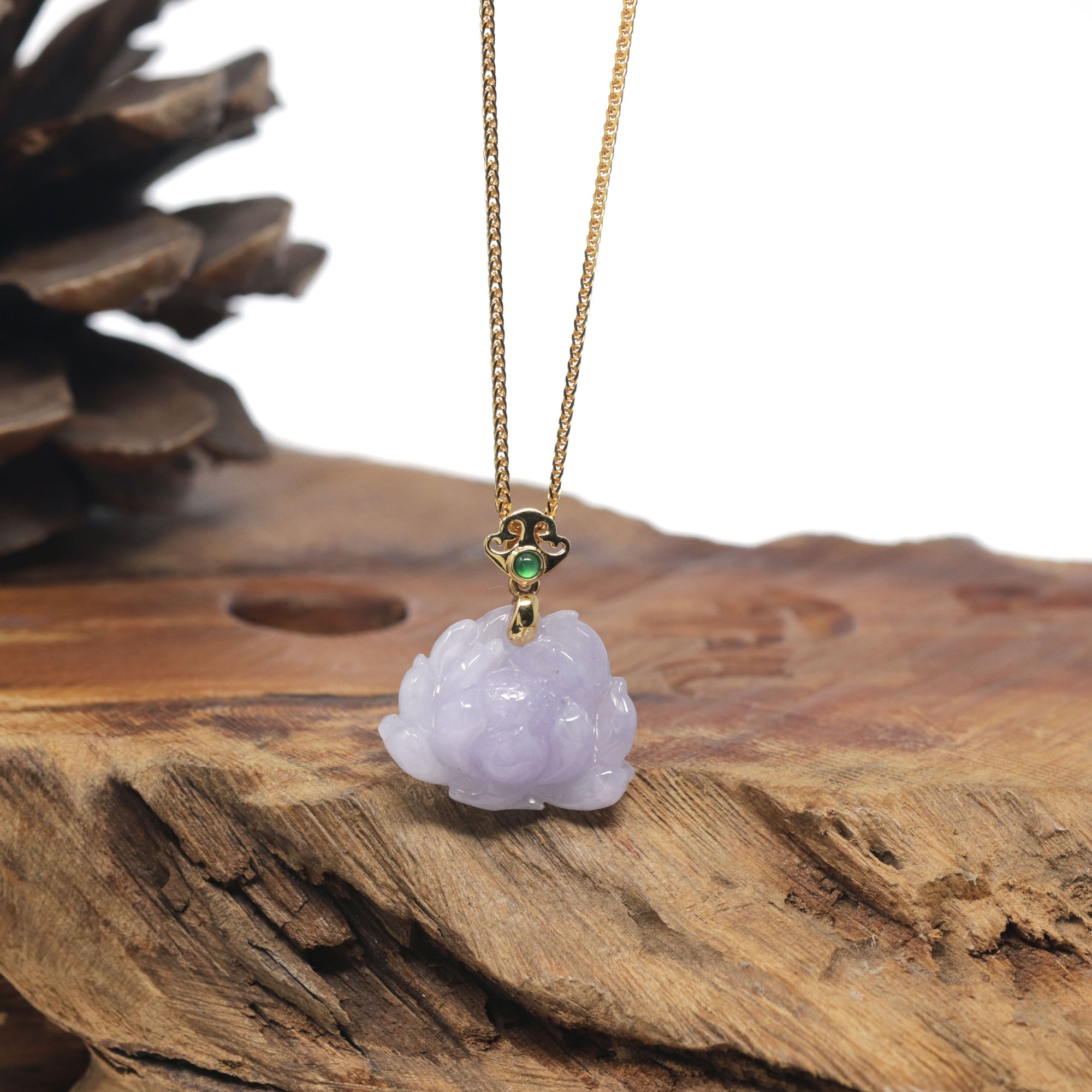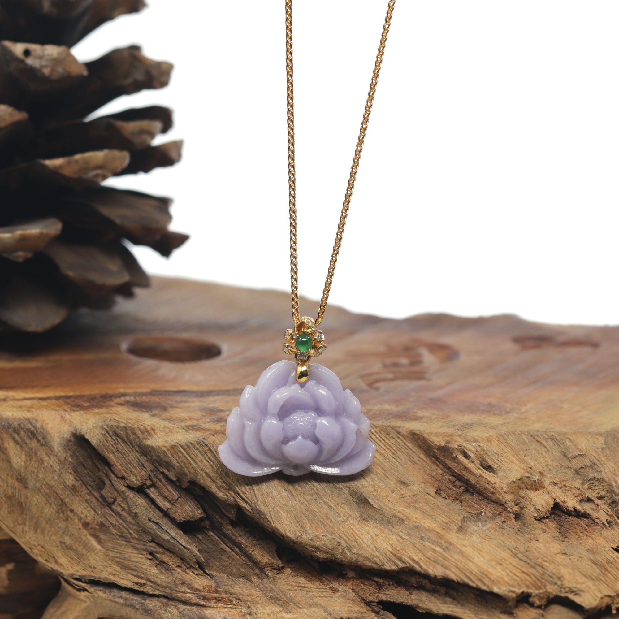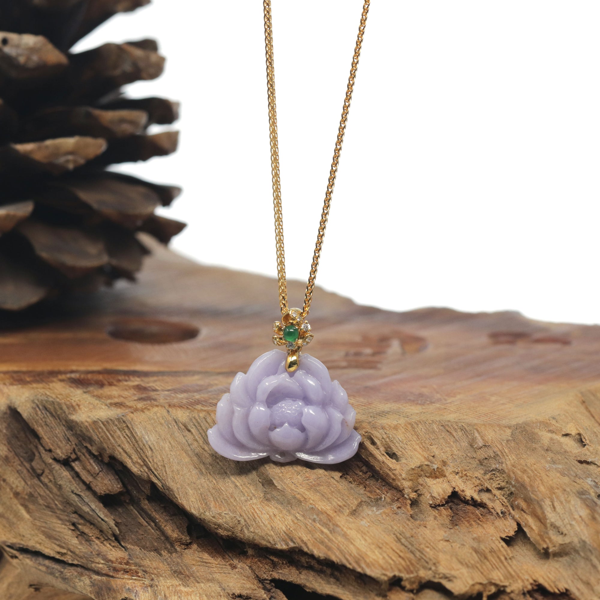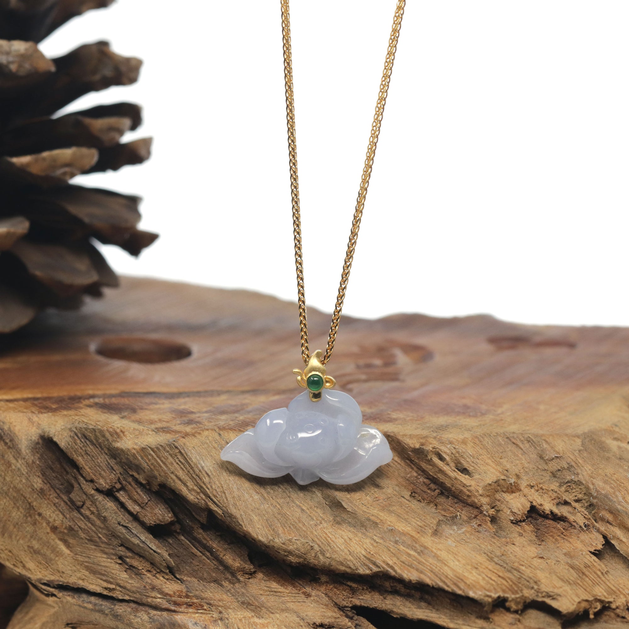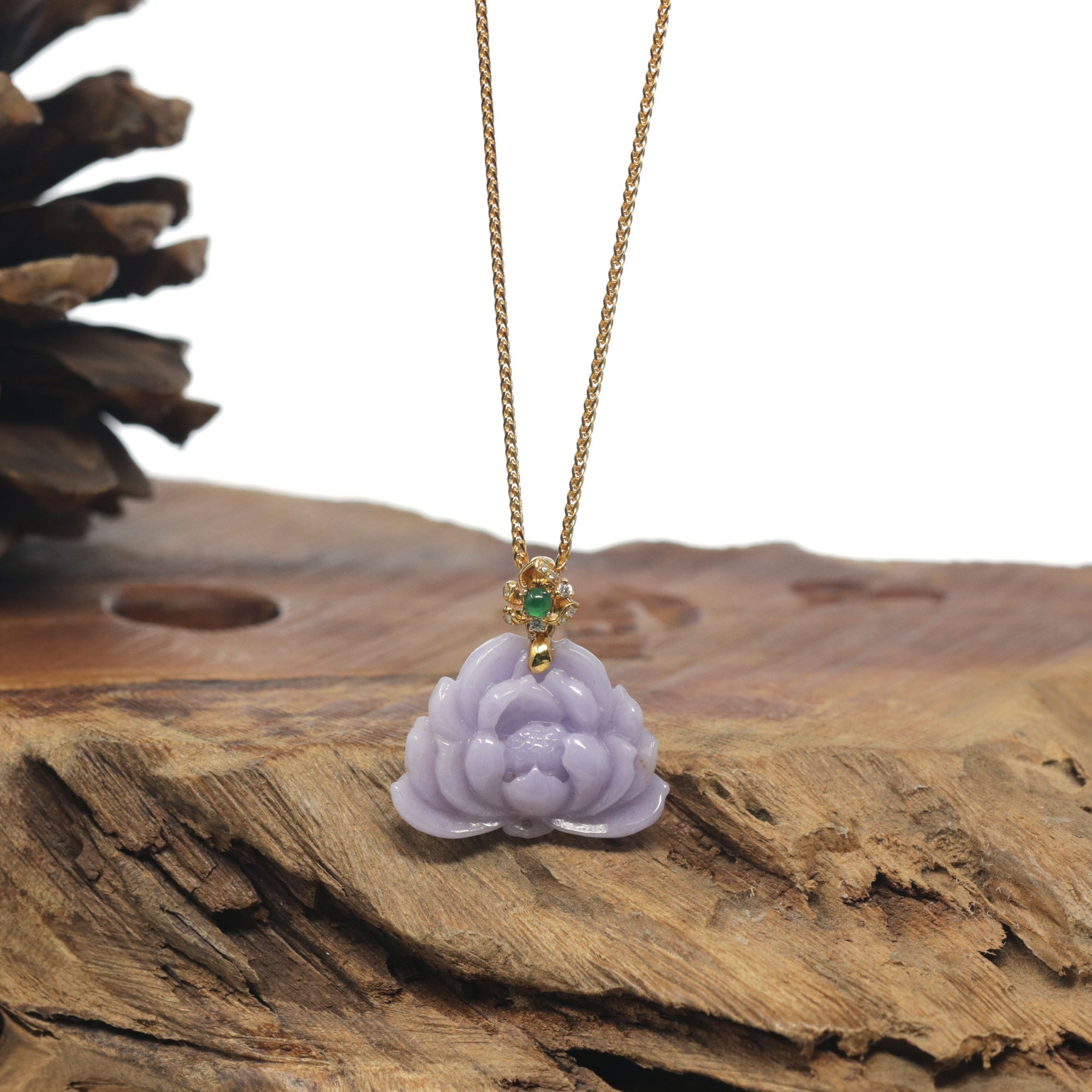 Baikalla Icy Lavender Lotus Jadeite Jade Pendant W/ 18K Yellow Gold Bail & Imperial Green Jade