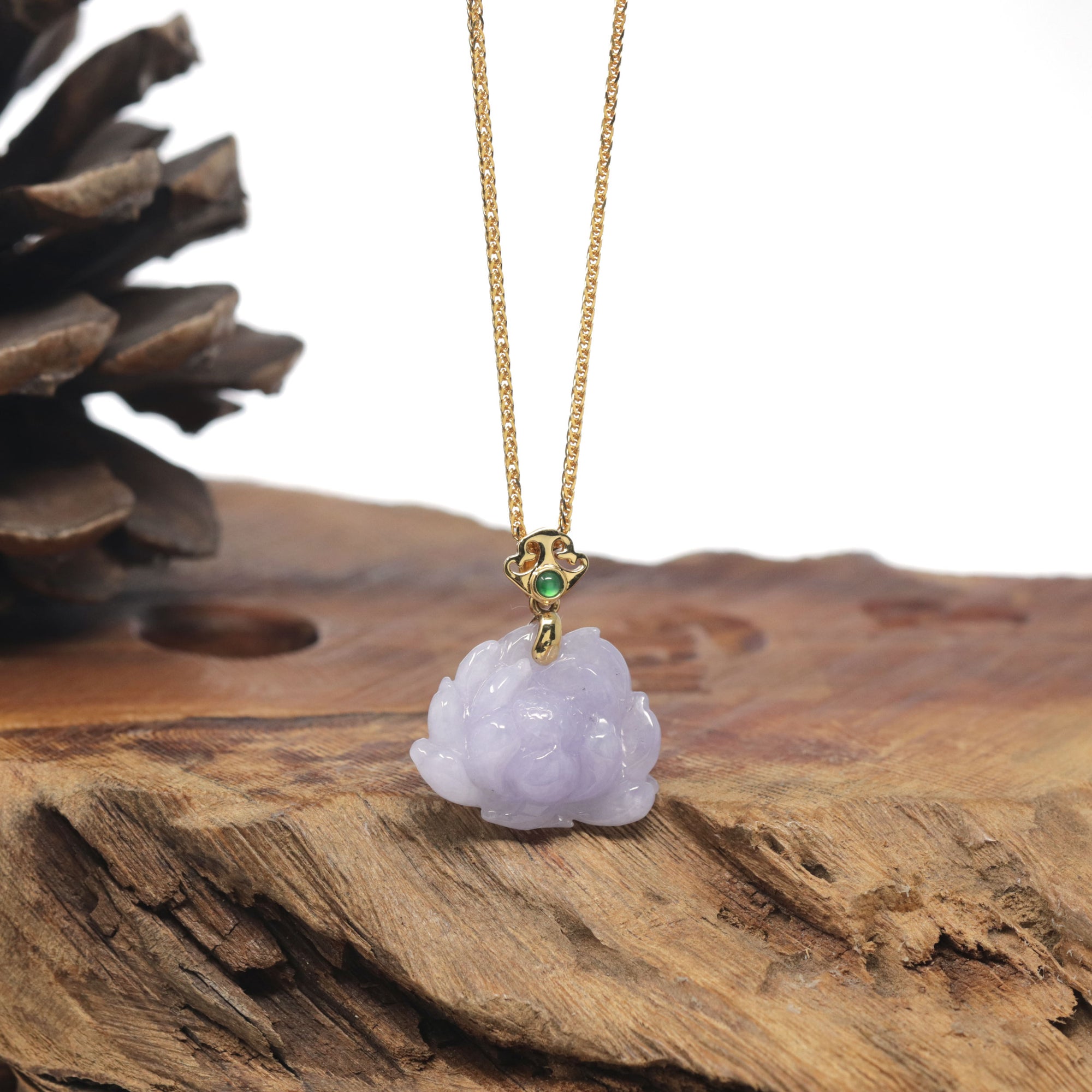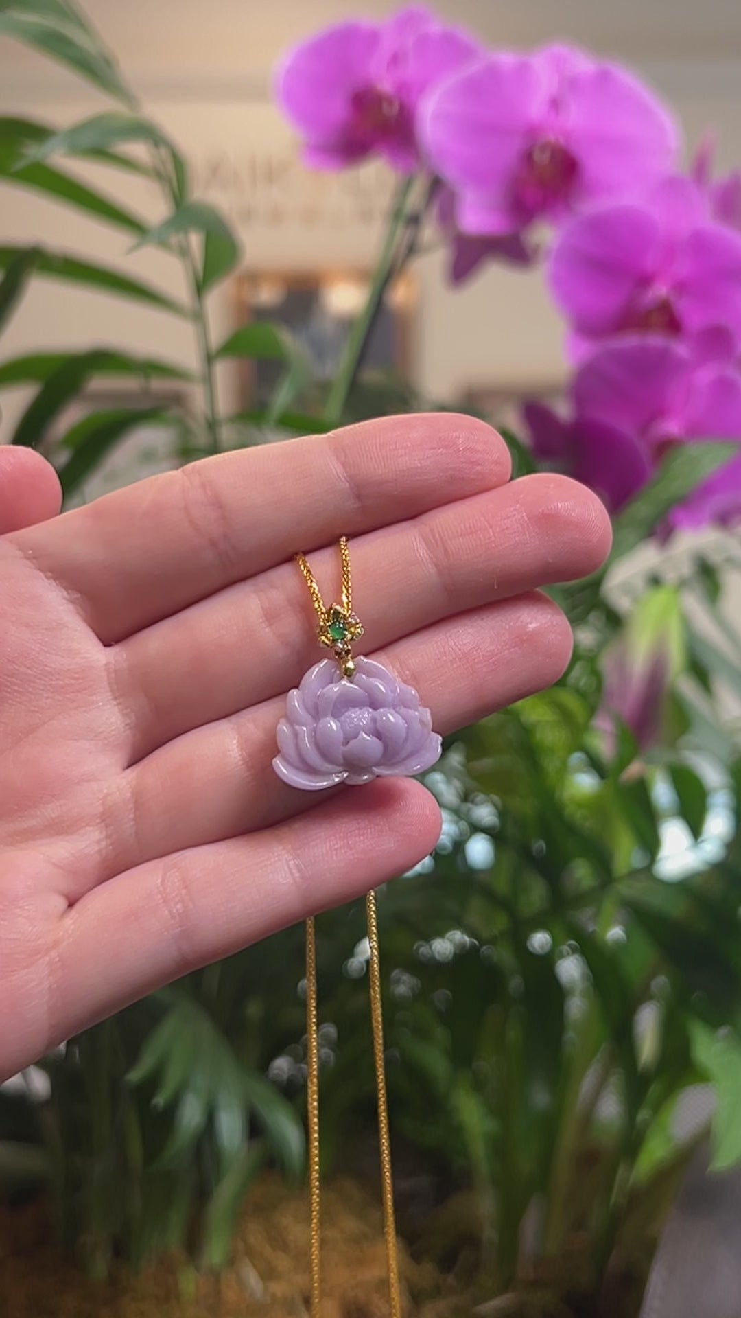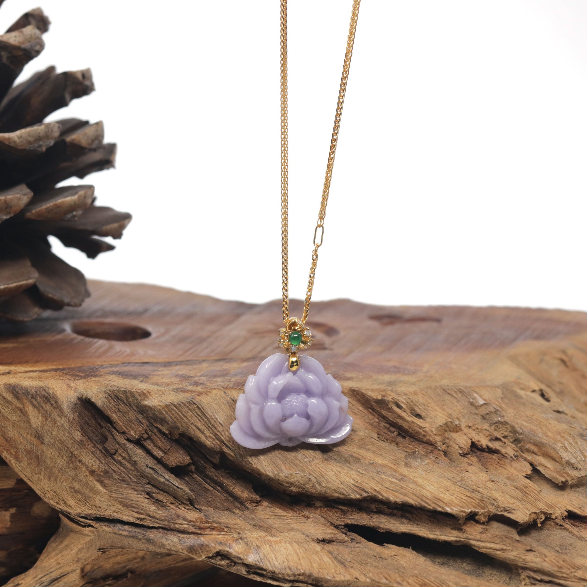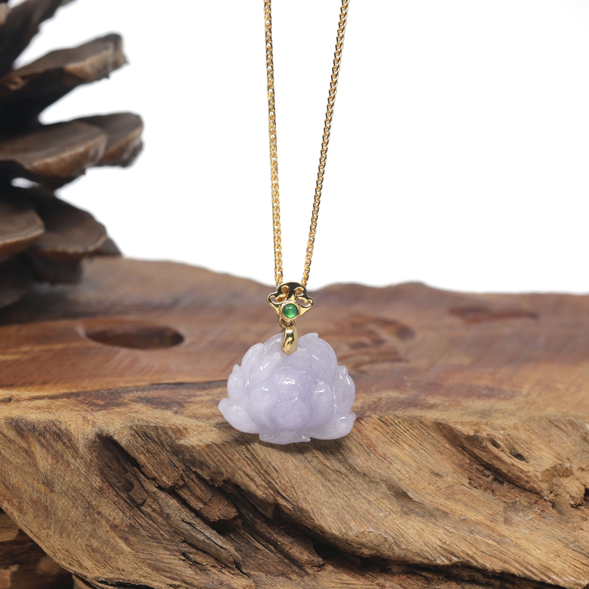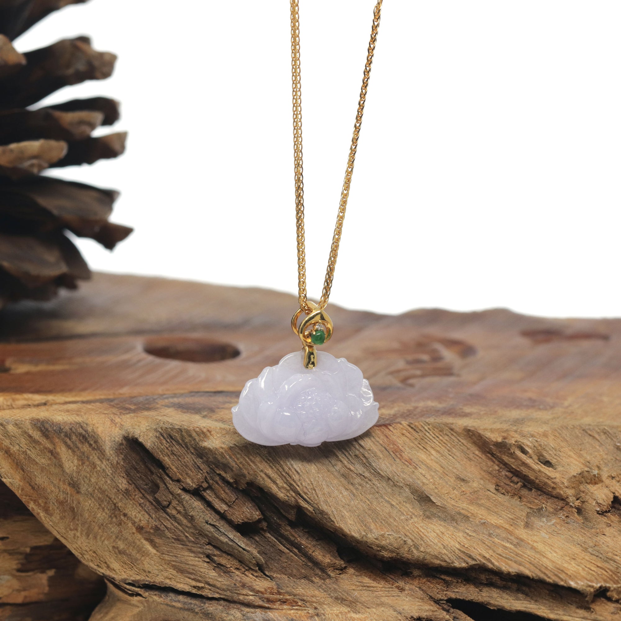 Baikalla Icy Lavender Lotus Jadeite Jade Pendant W/ 18K Yellow Gold Bail & Imperial Green Jade