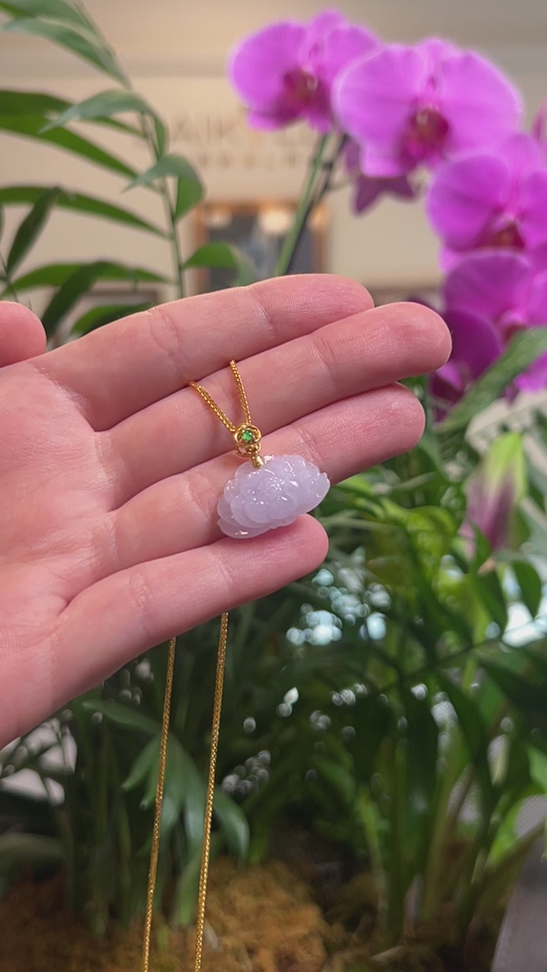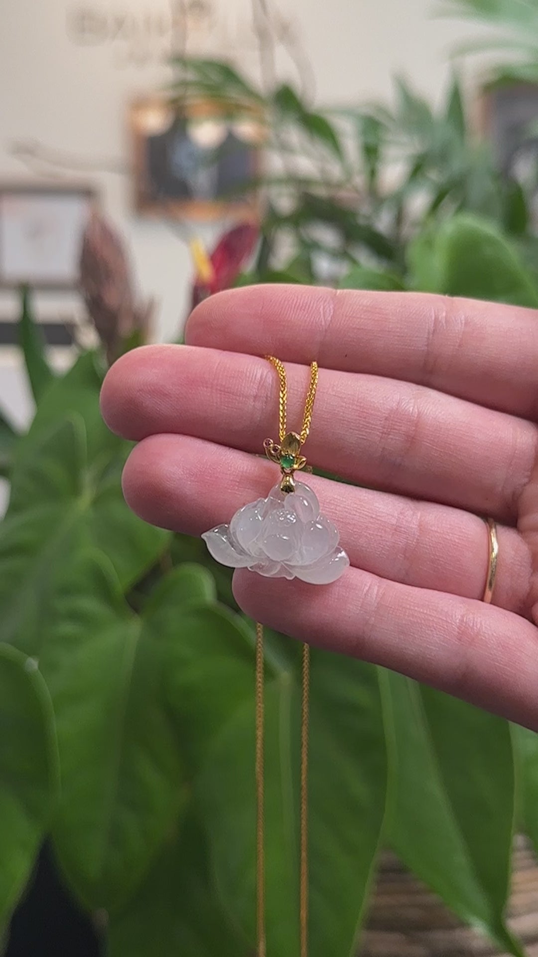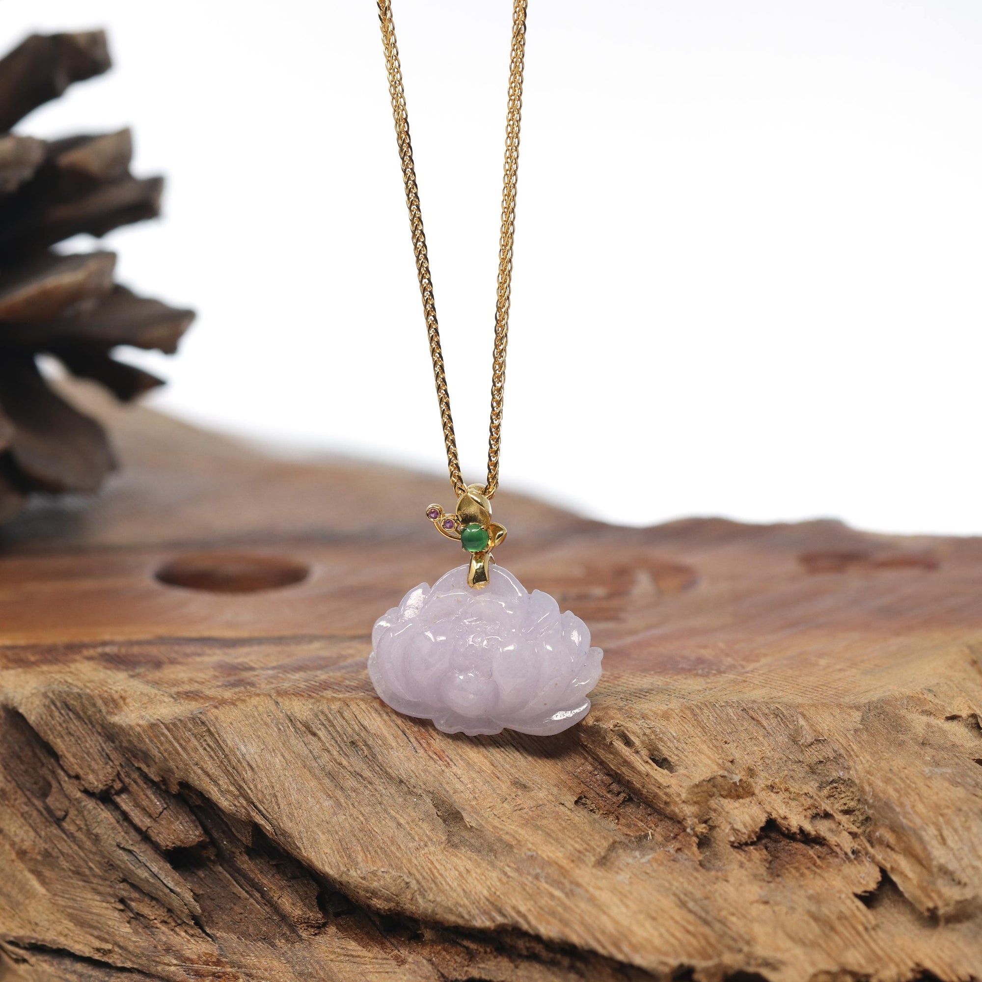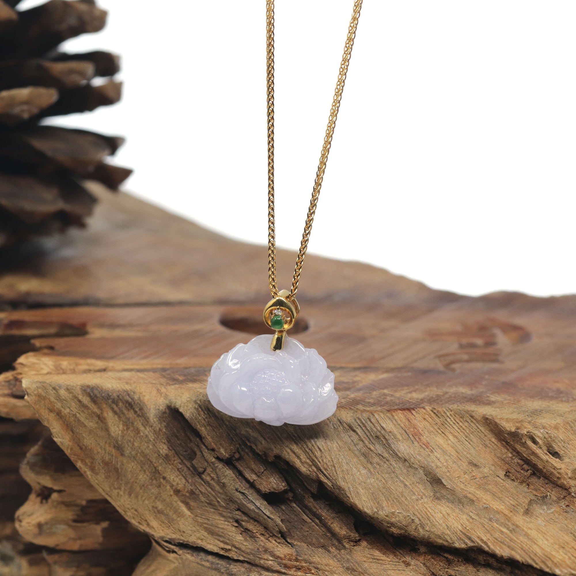 Baikalla Icy Lavender Lotus Jadeite Jade Pendant W/ 18K Yellow Gold Bail & Imperial Green Jade
