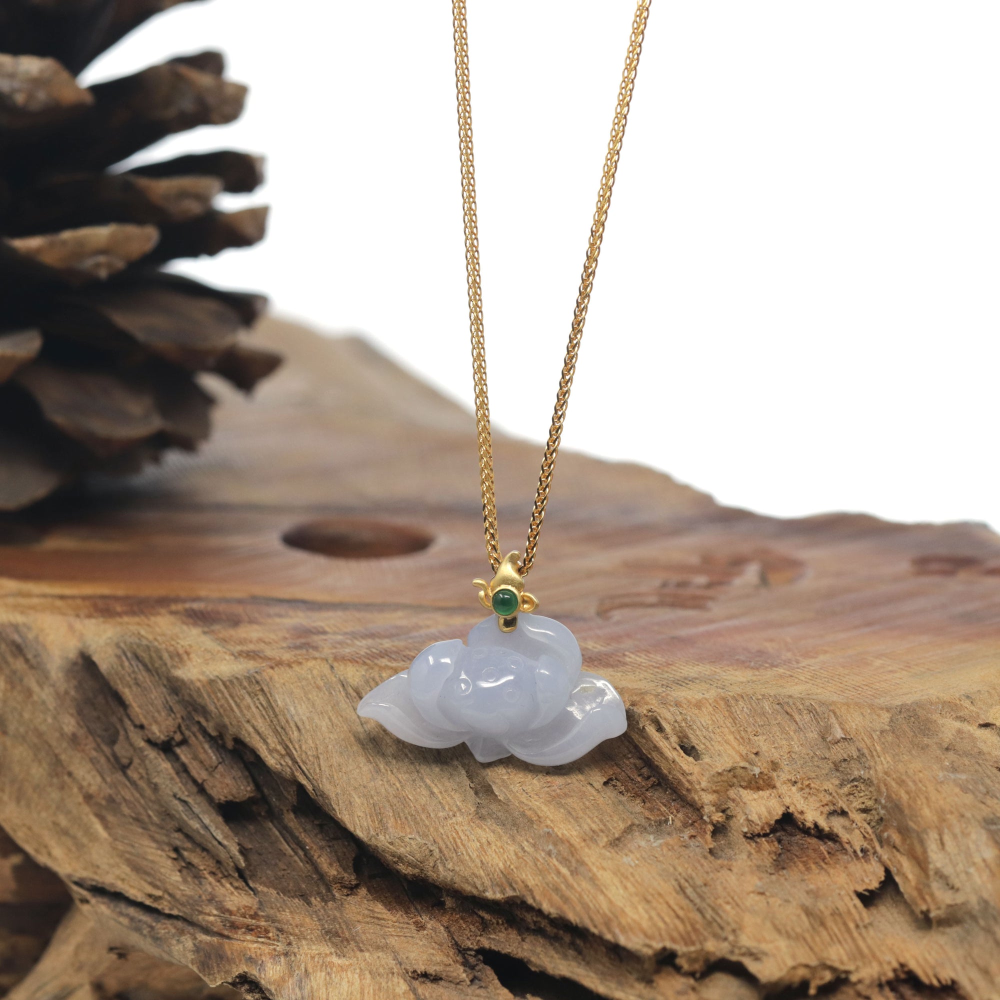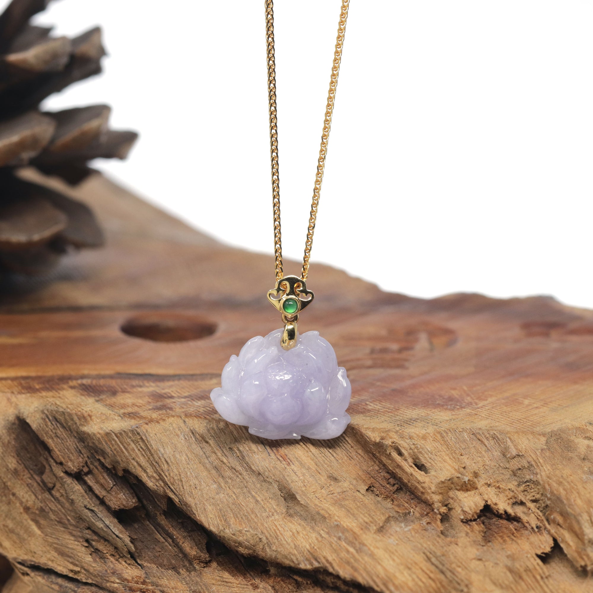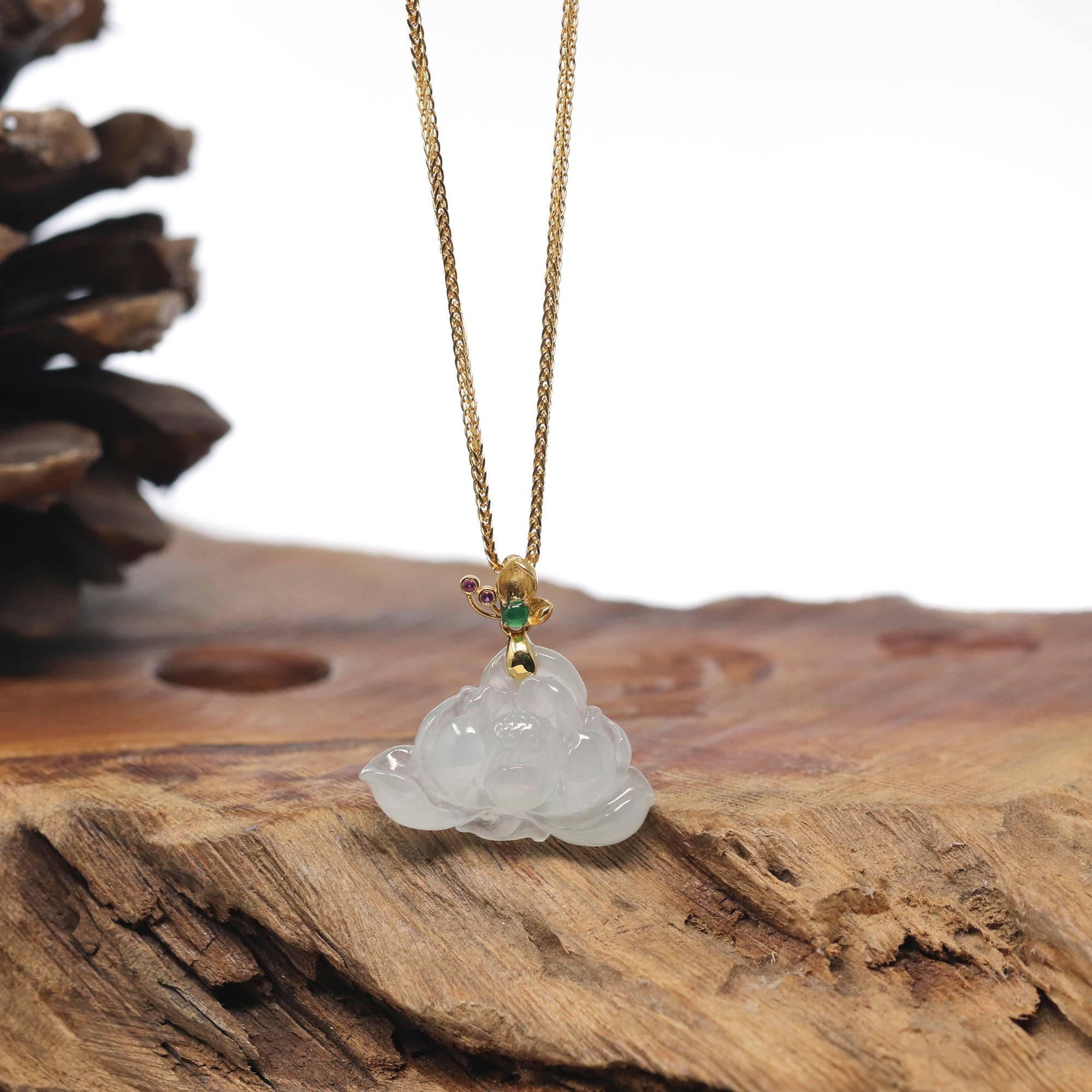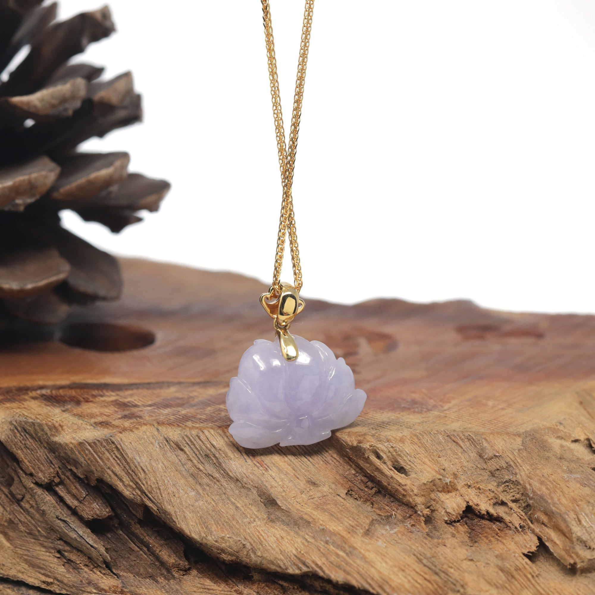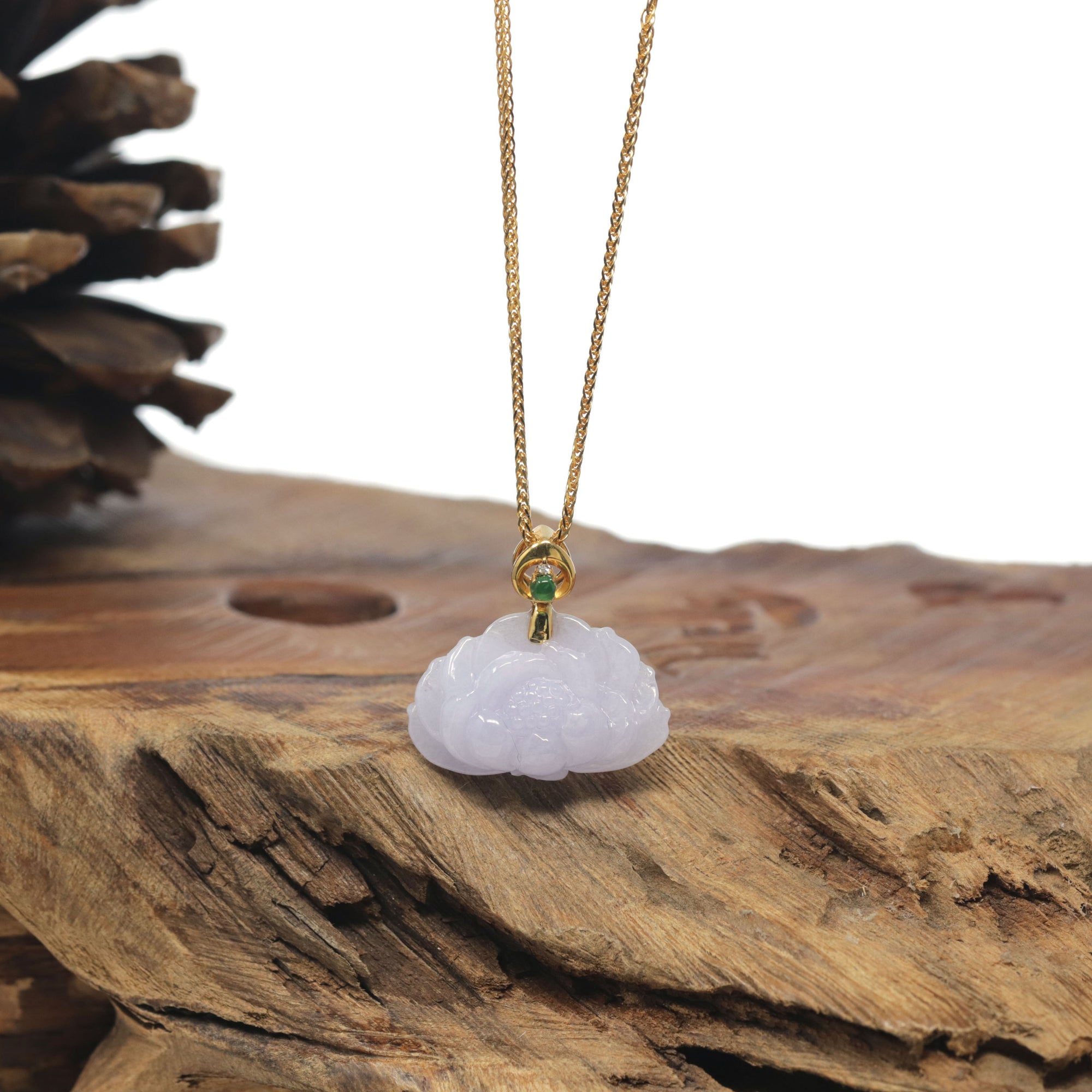 Baikalla Icy Lavender Lotus Jadeite Jade Pendant W/ 18K Yellow Gold Bail & Imperial Green Jade