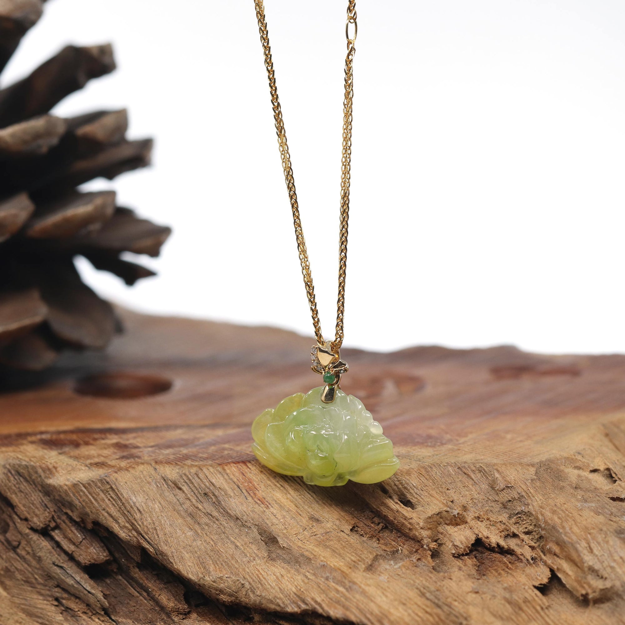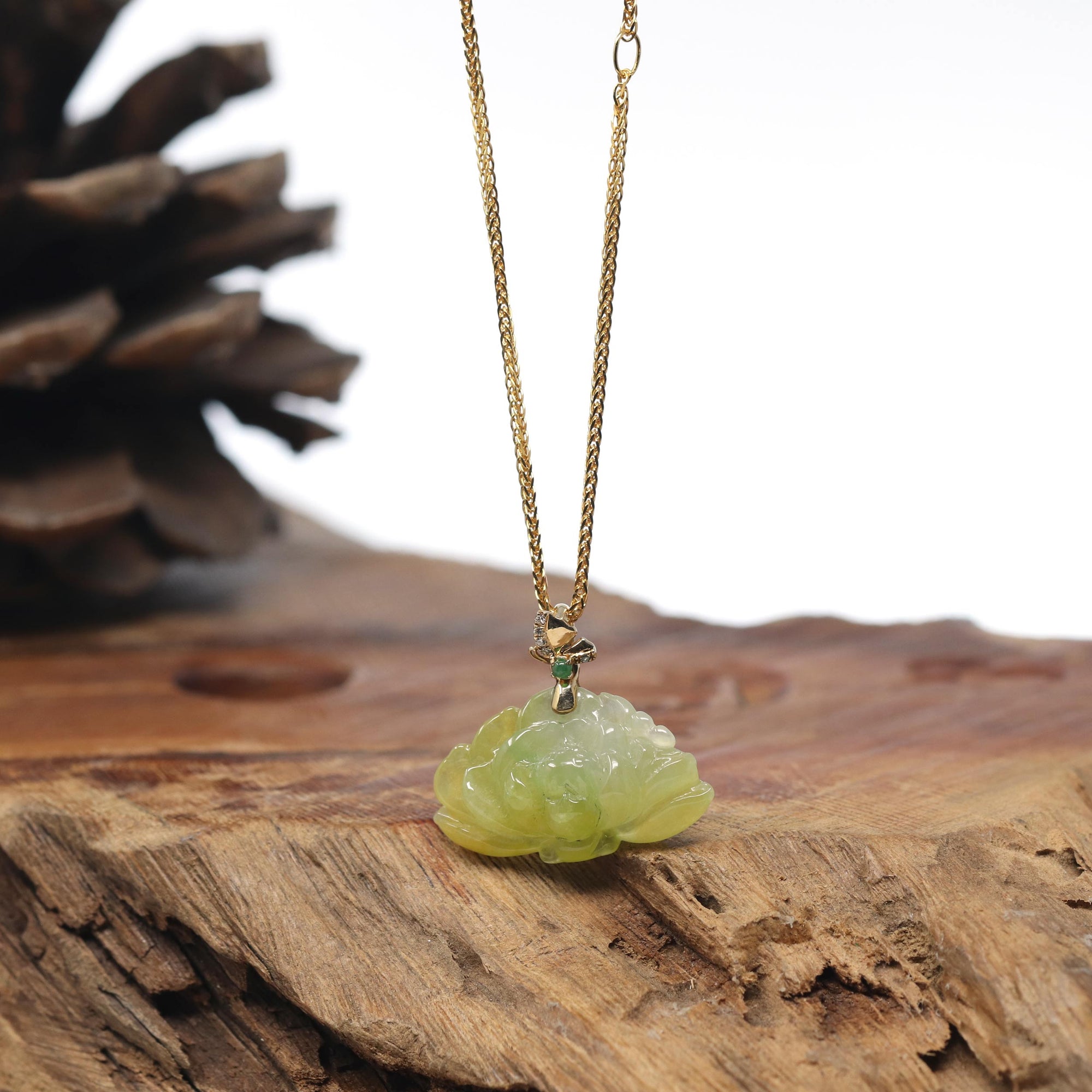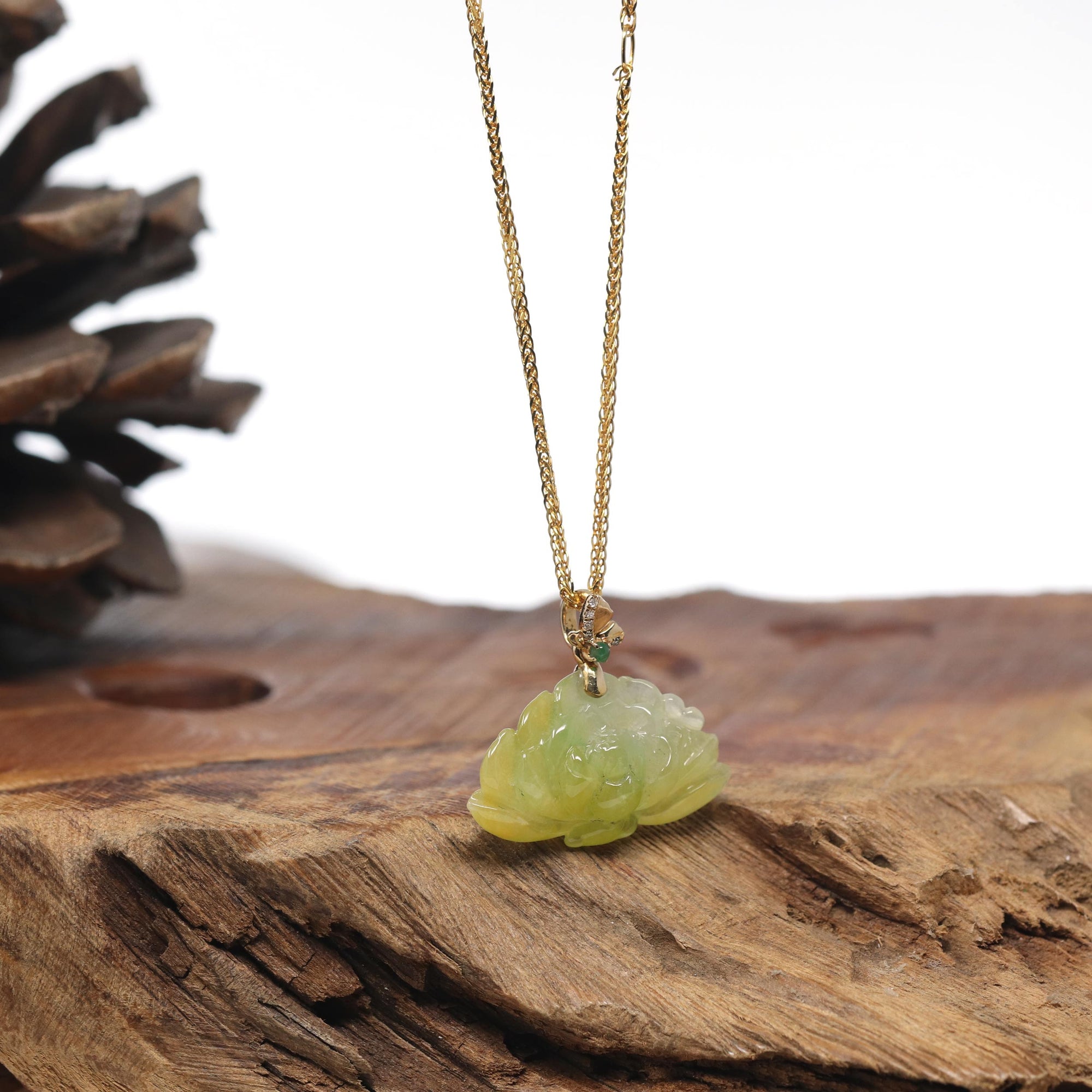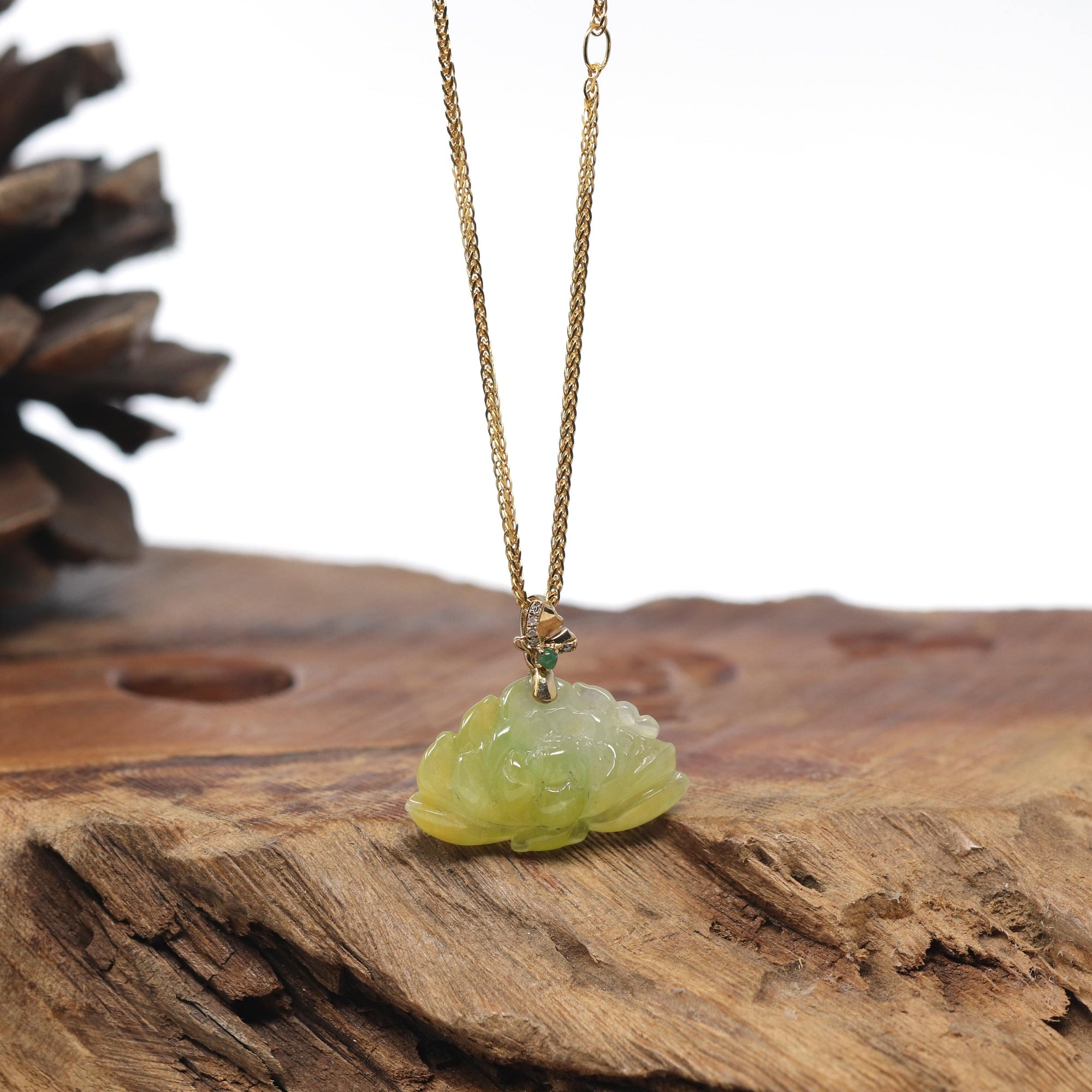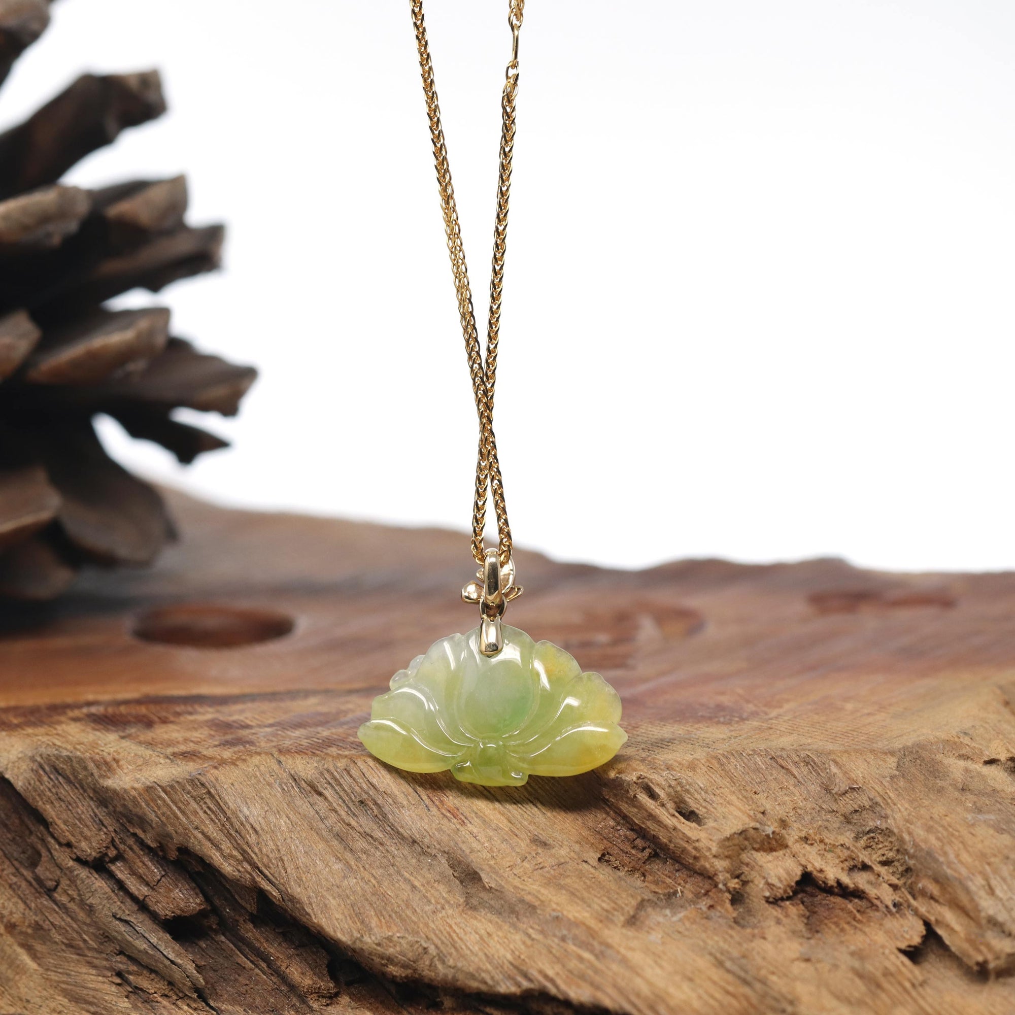 Baikalla Yellow & Green Lotus Jadeite Jade Pendant W/ 18K Yellow Gold Butterfly Bail & Diamonds