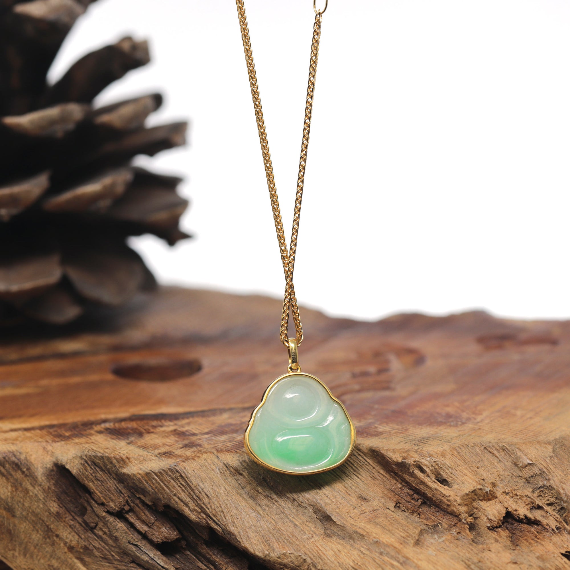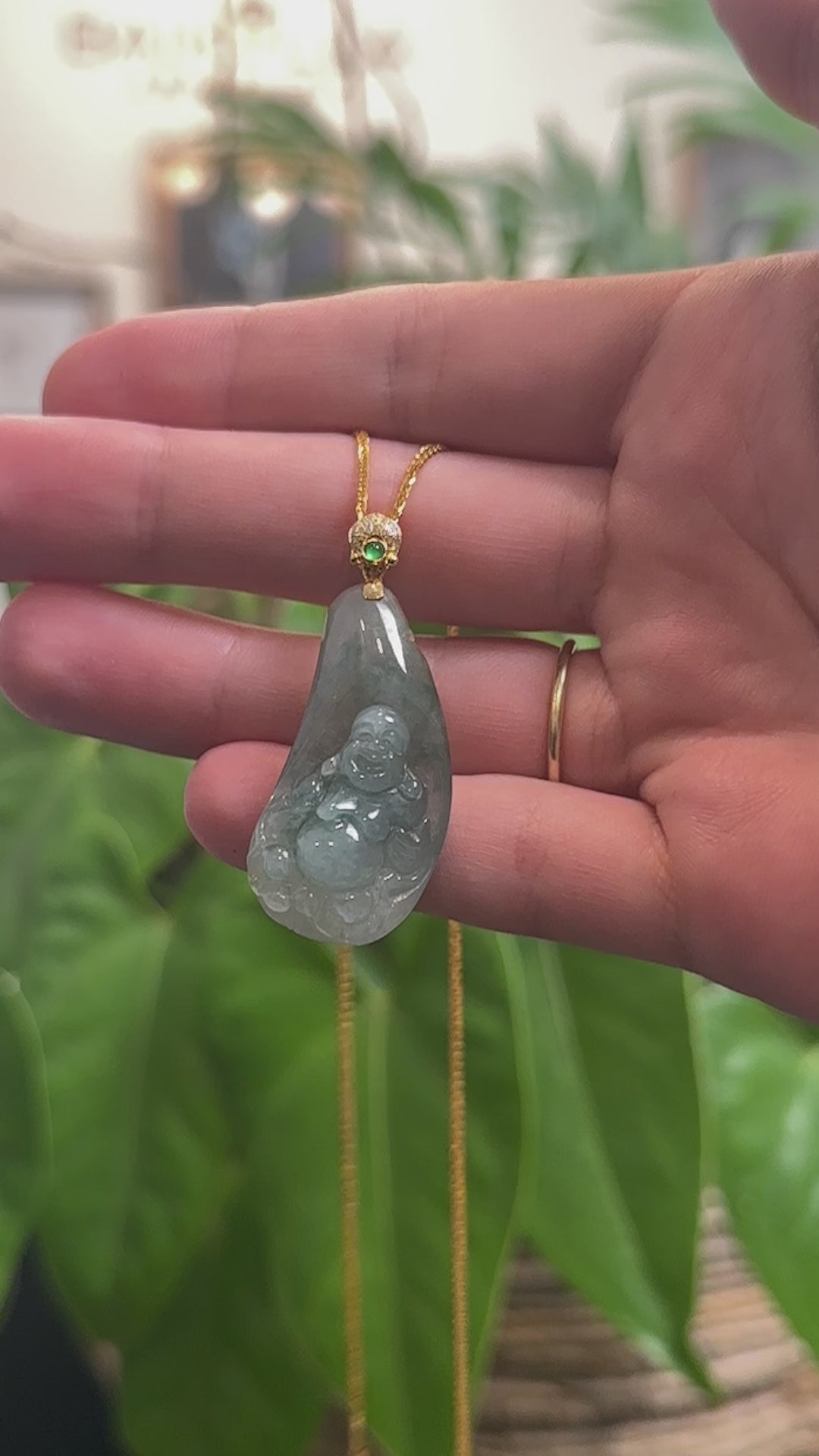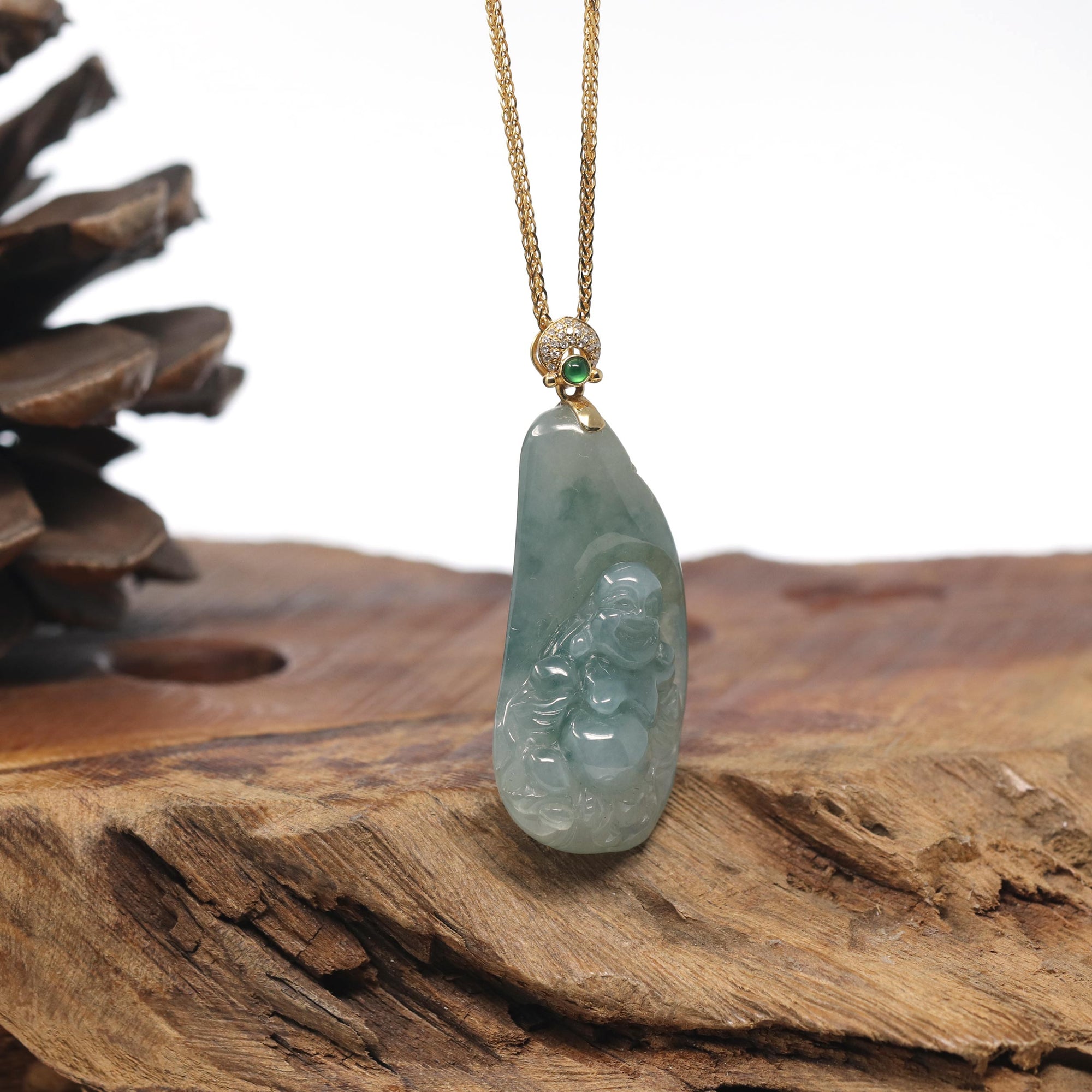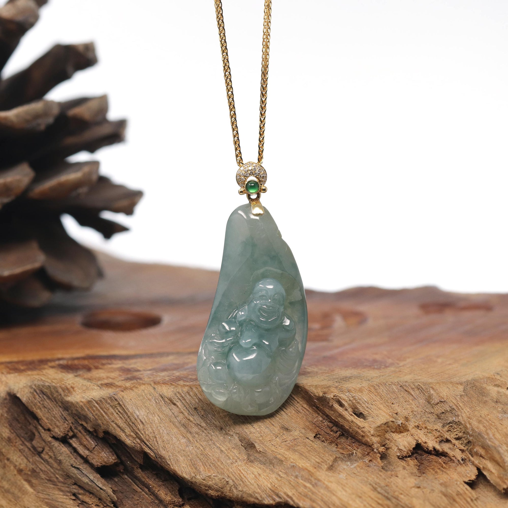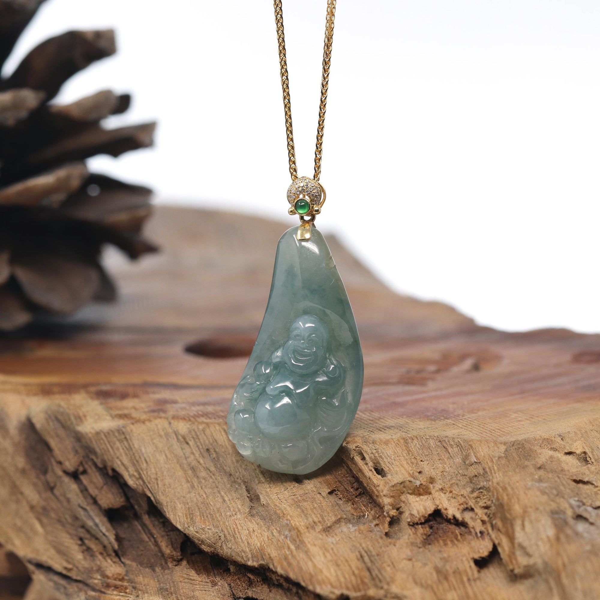 Baikalla Ice Blue Green Flower Jadeite Jade "Happy Buddha" Necklace With 18K Gold Bail