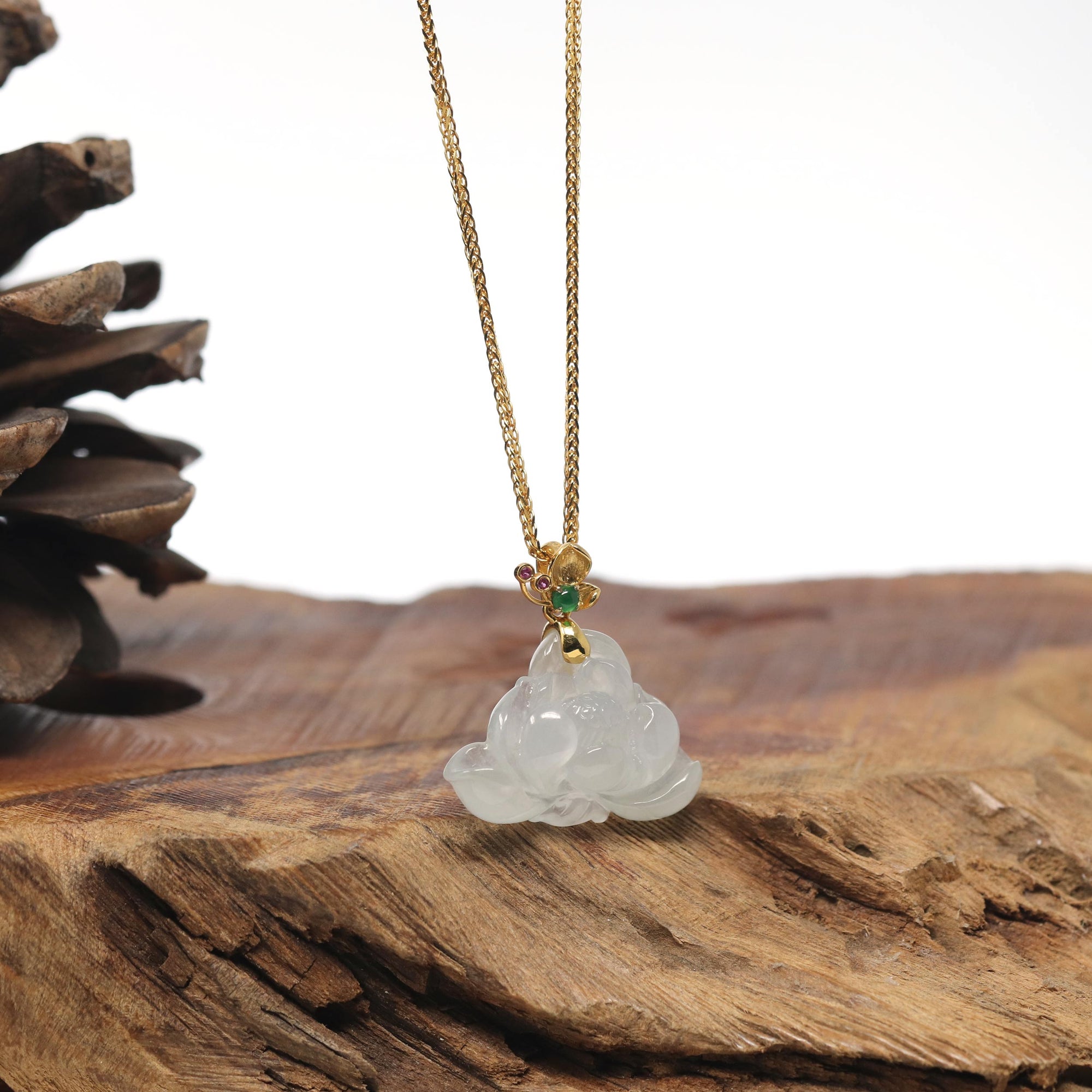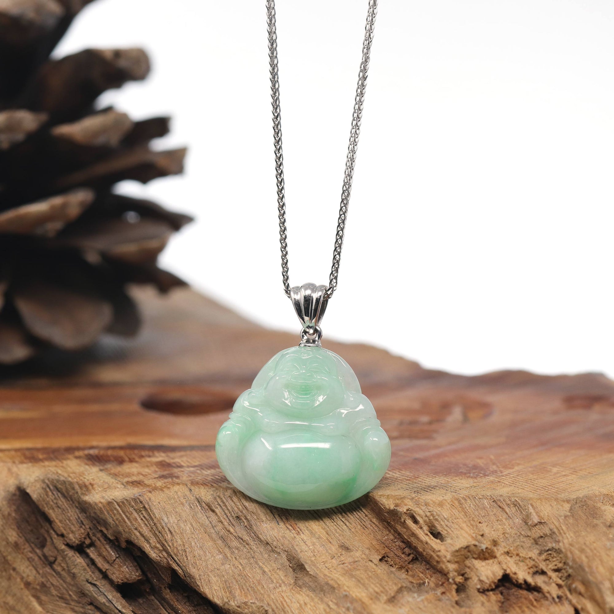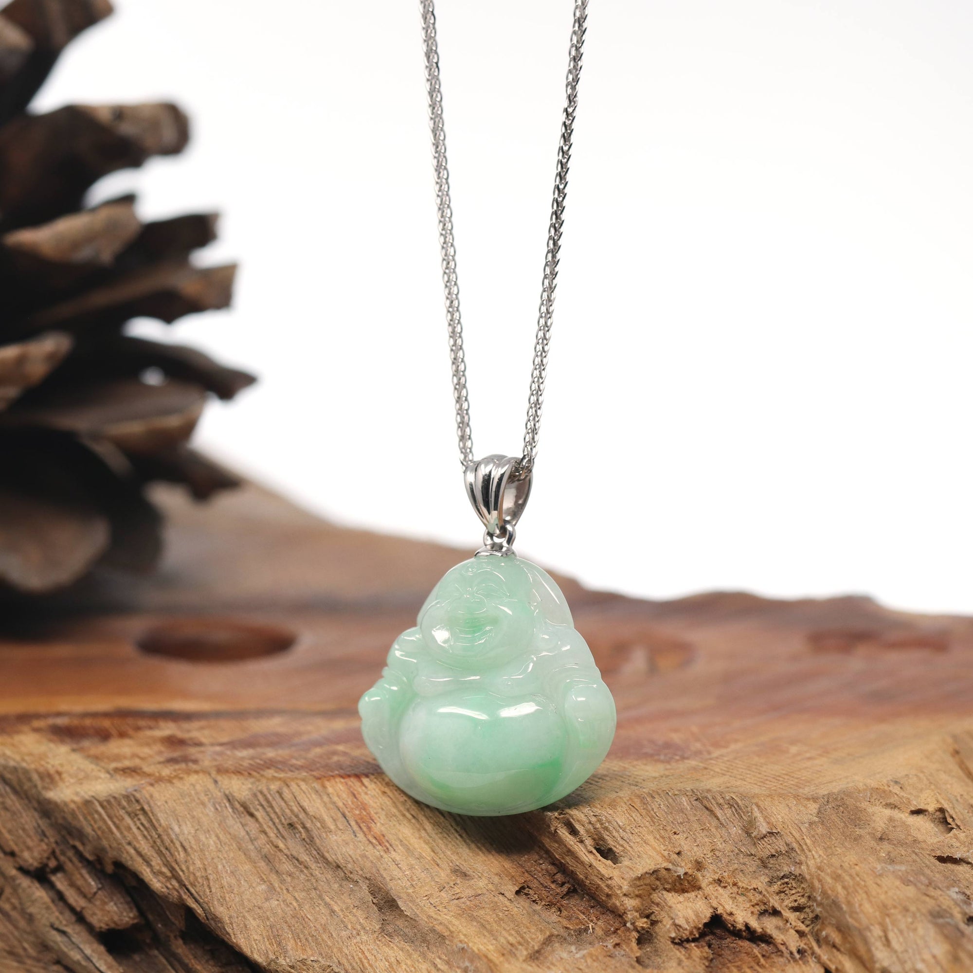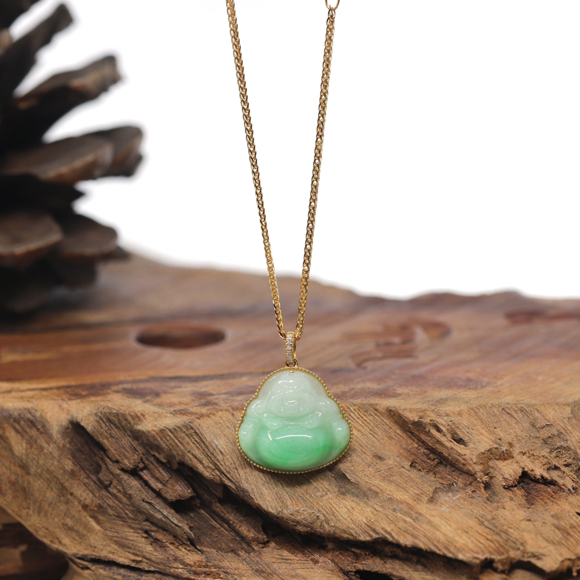 Baikalla Ice Blue Green Flower Jadeite Jade "Happy Buddha" Necklace With 18K Gold Bail