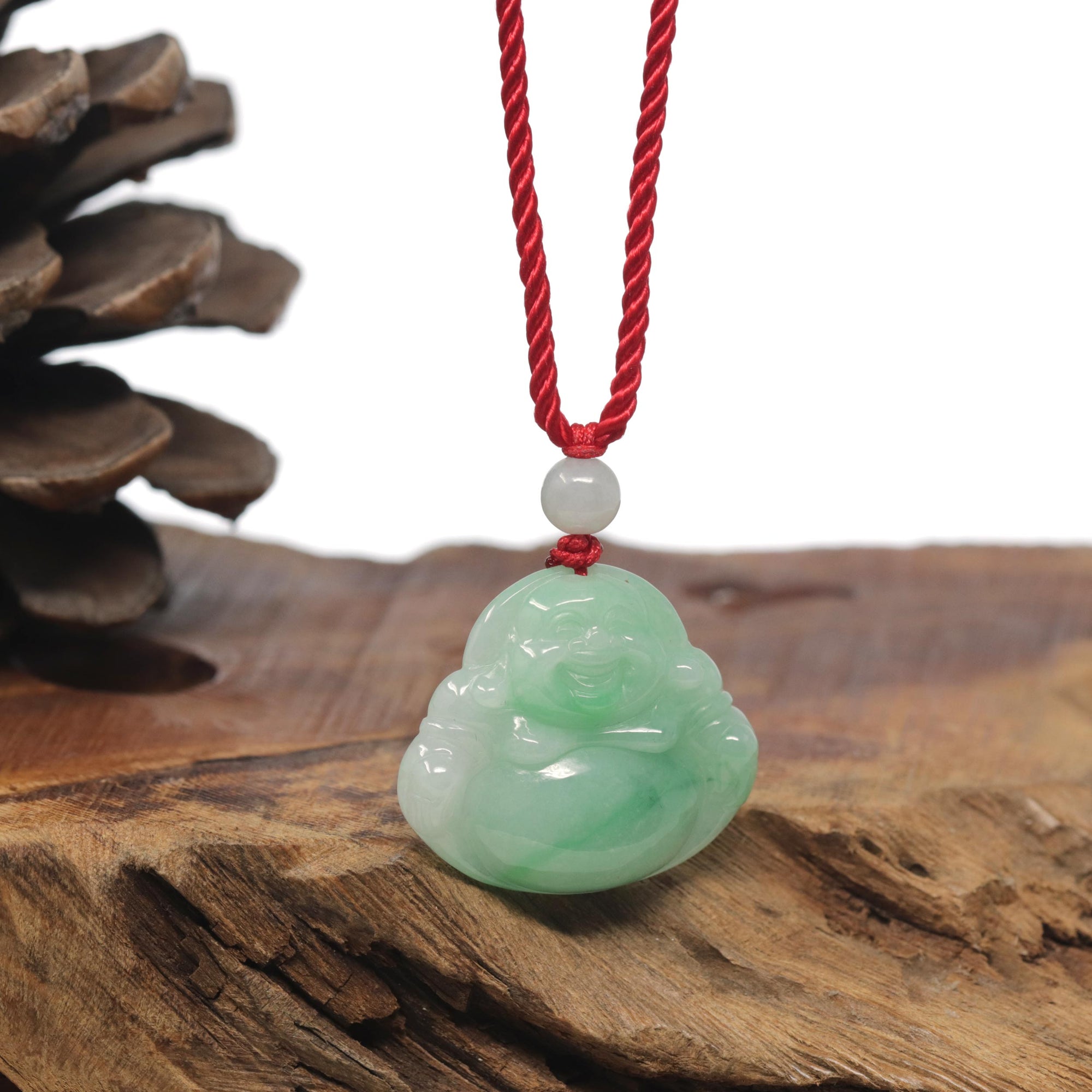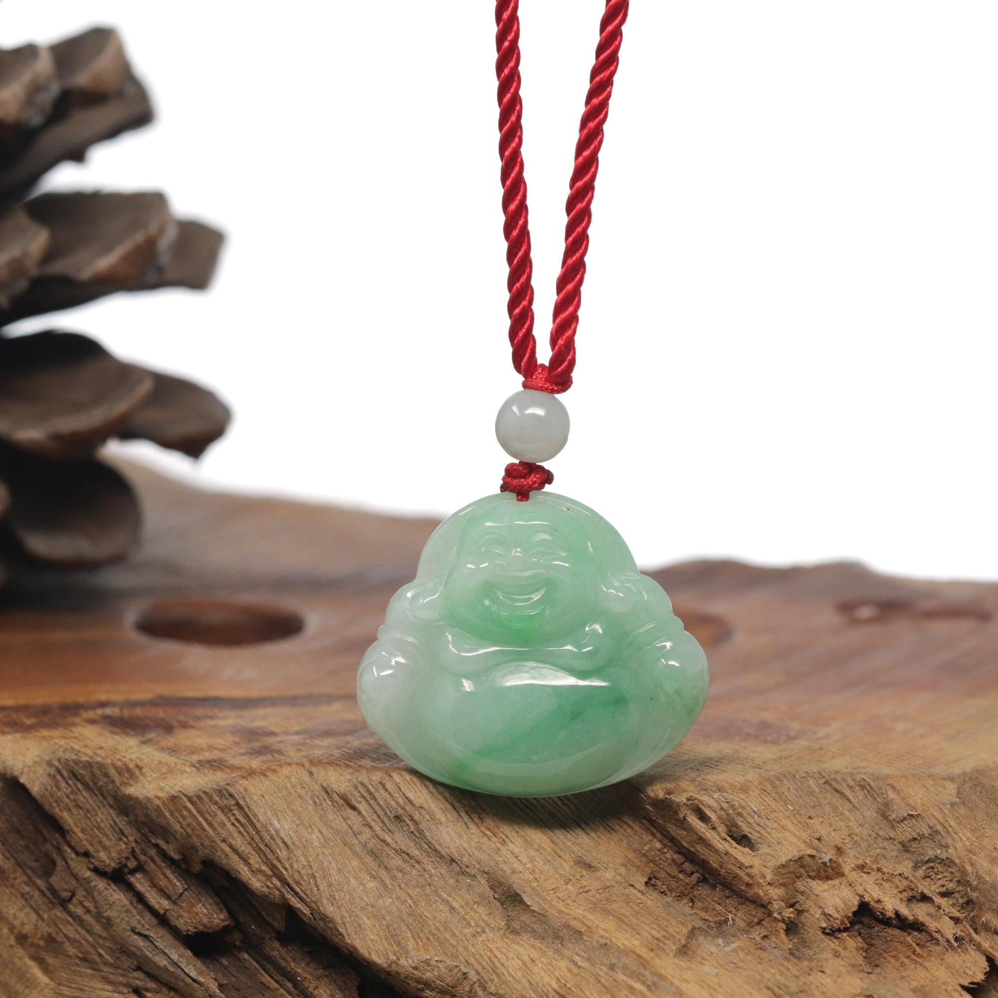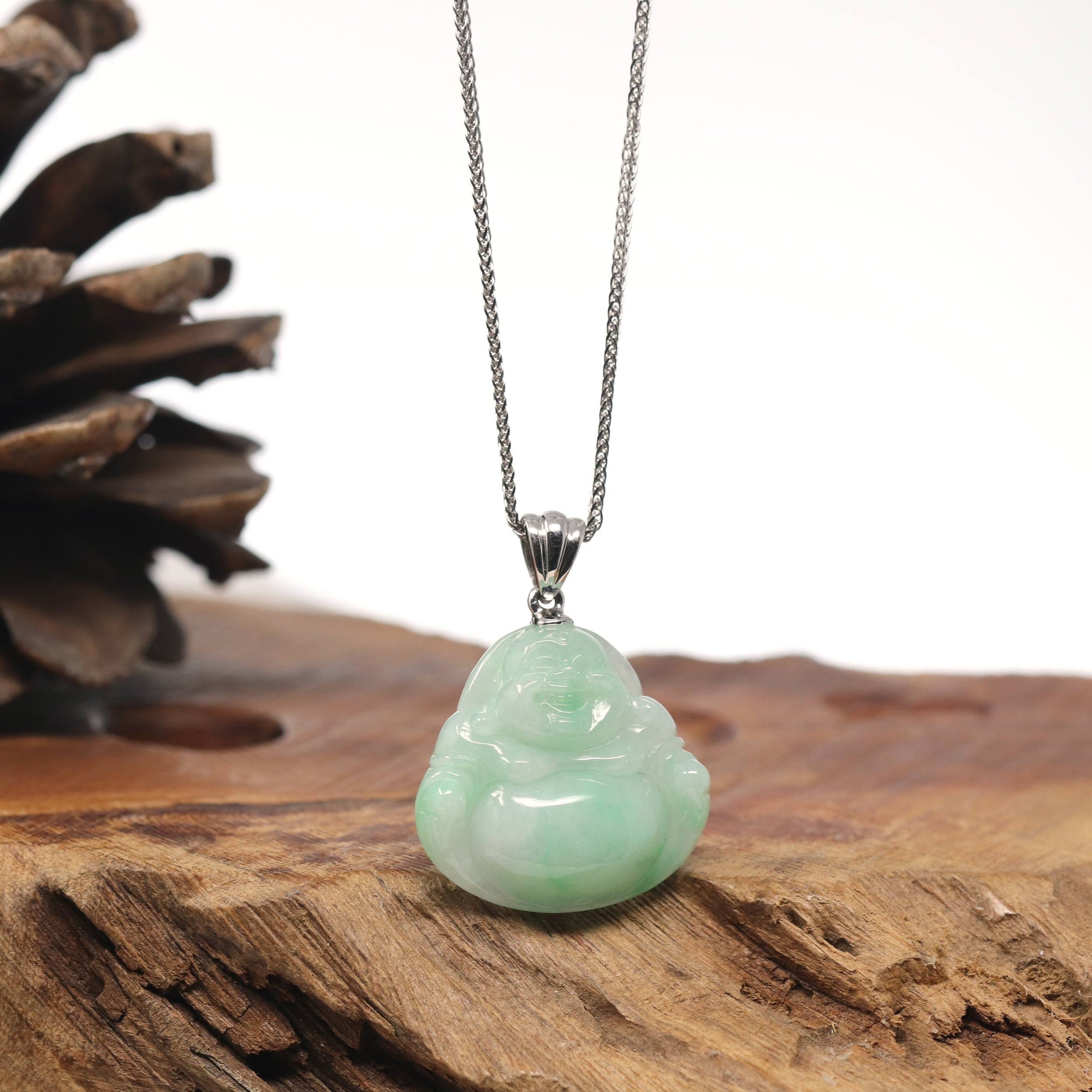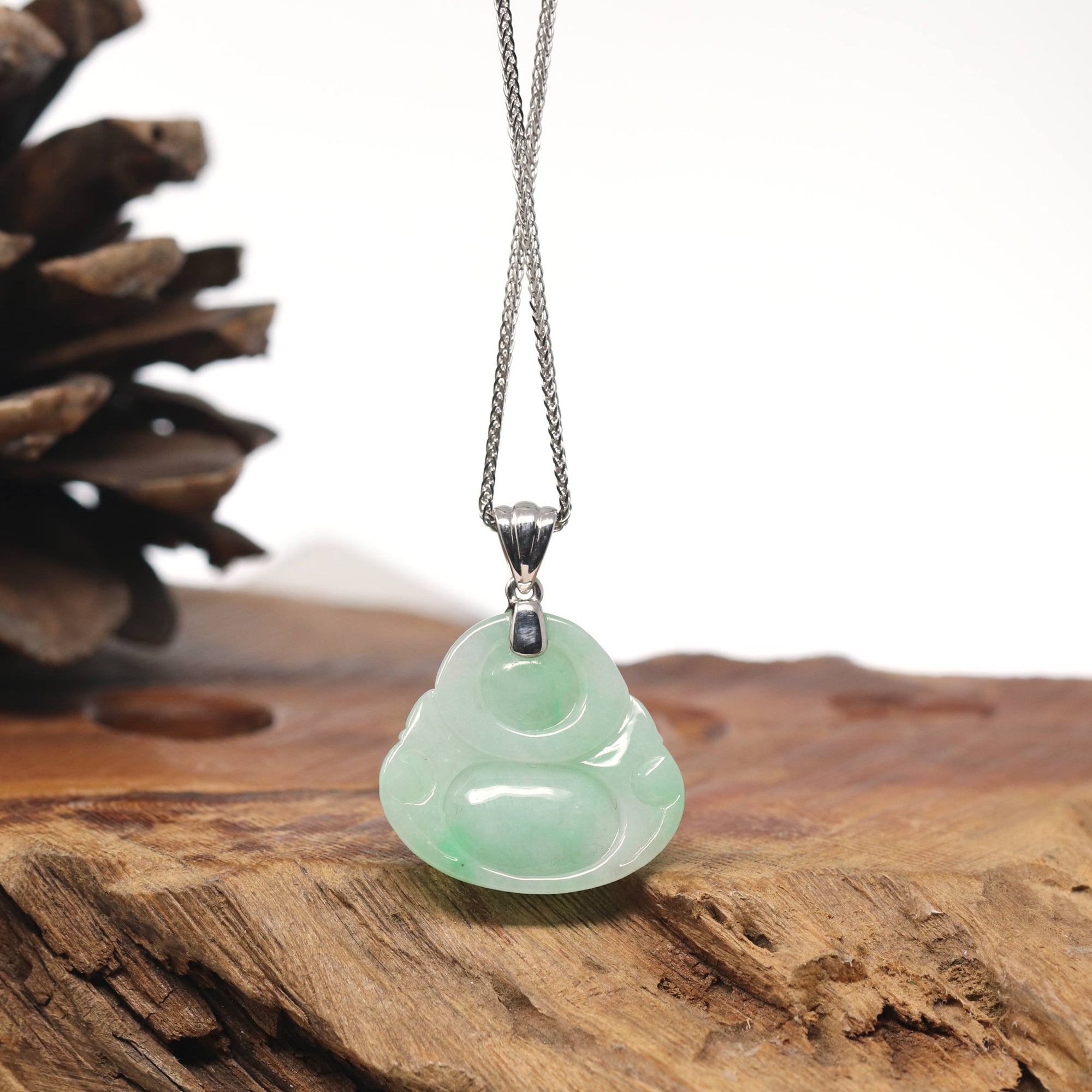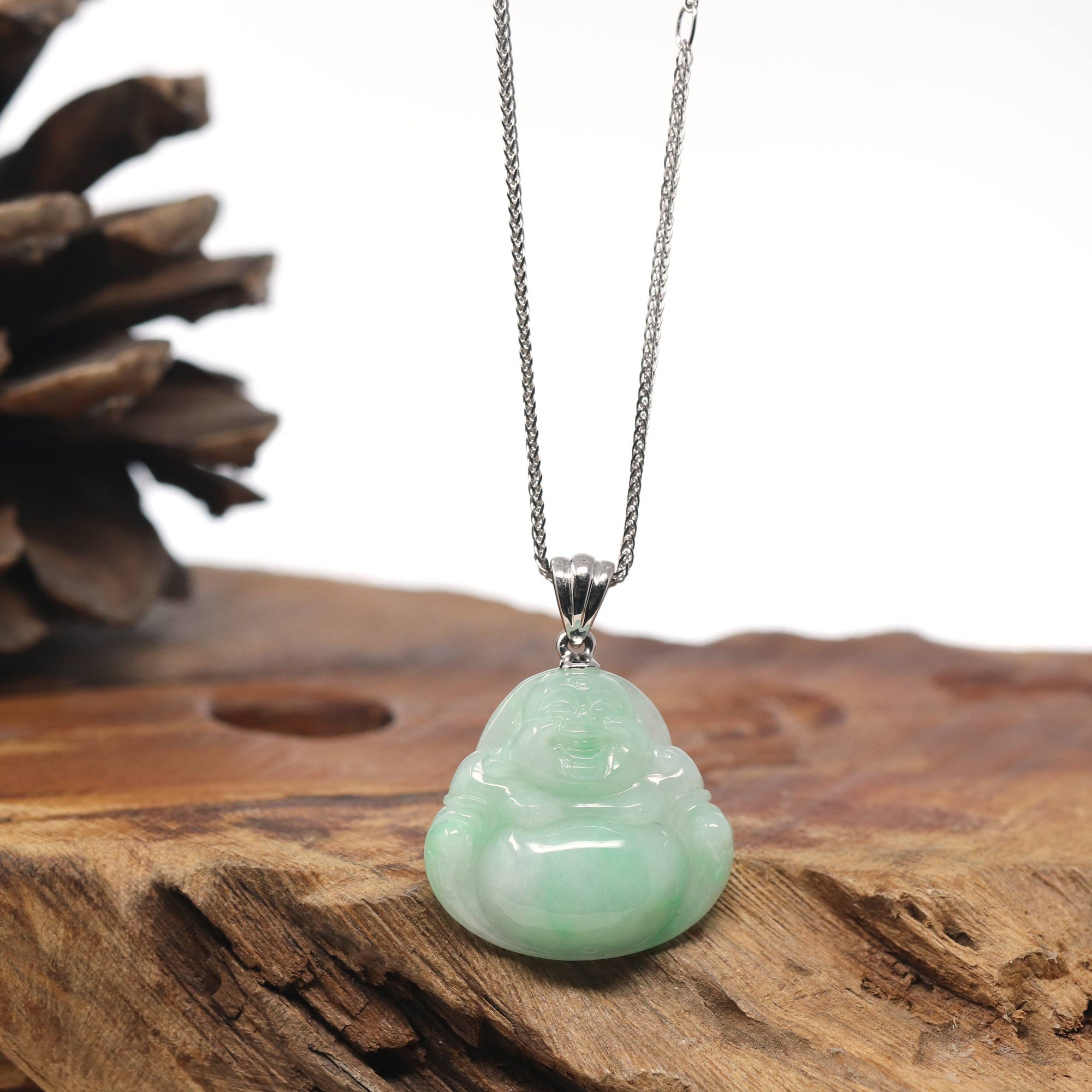 Baikalla Ice Blue Green Flower Jadeite Jade "Happy Buddha" Necklace With 18K Gold Bail