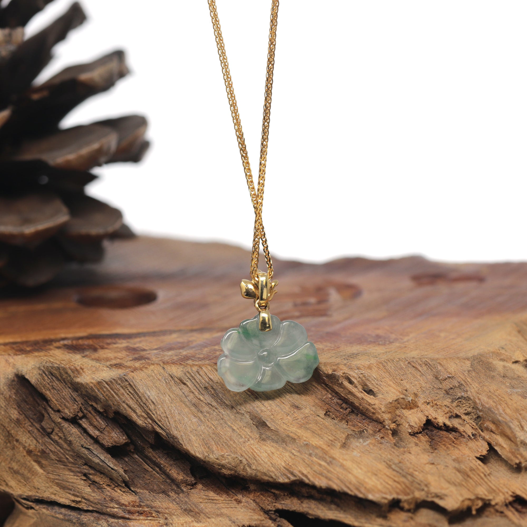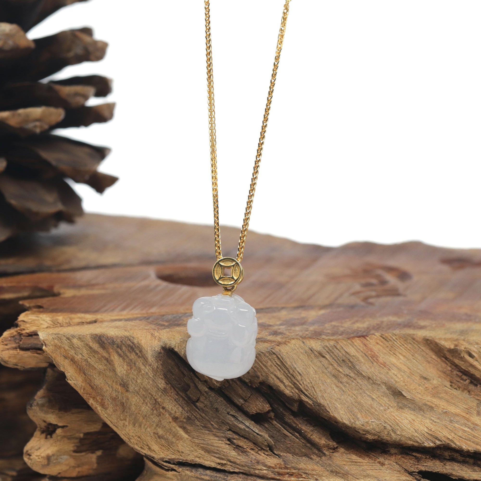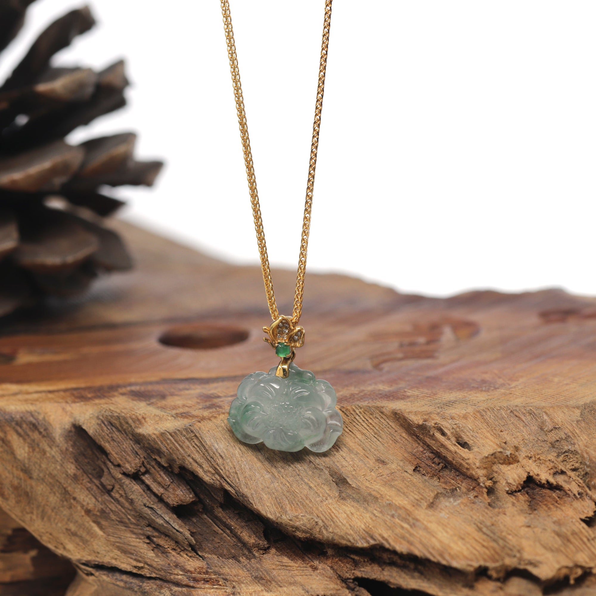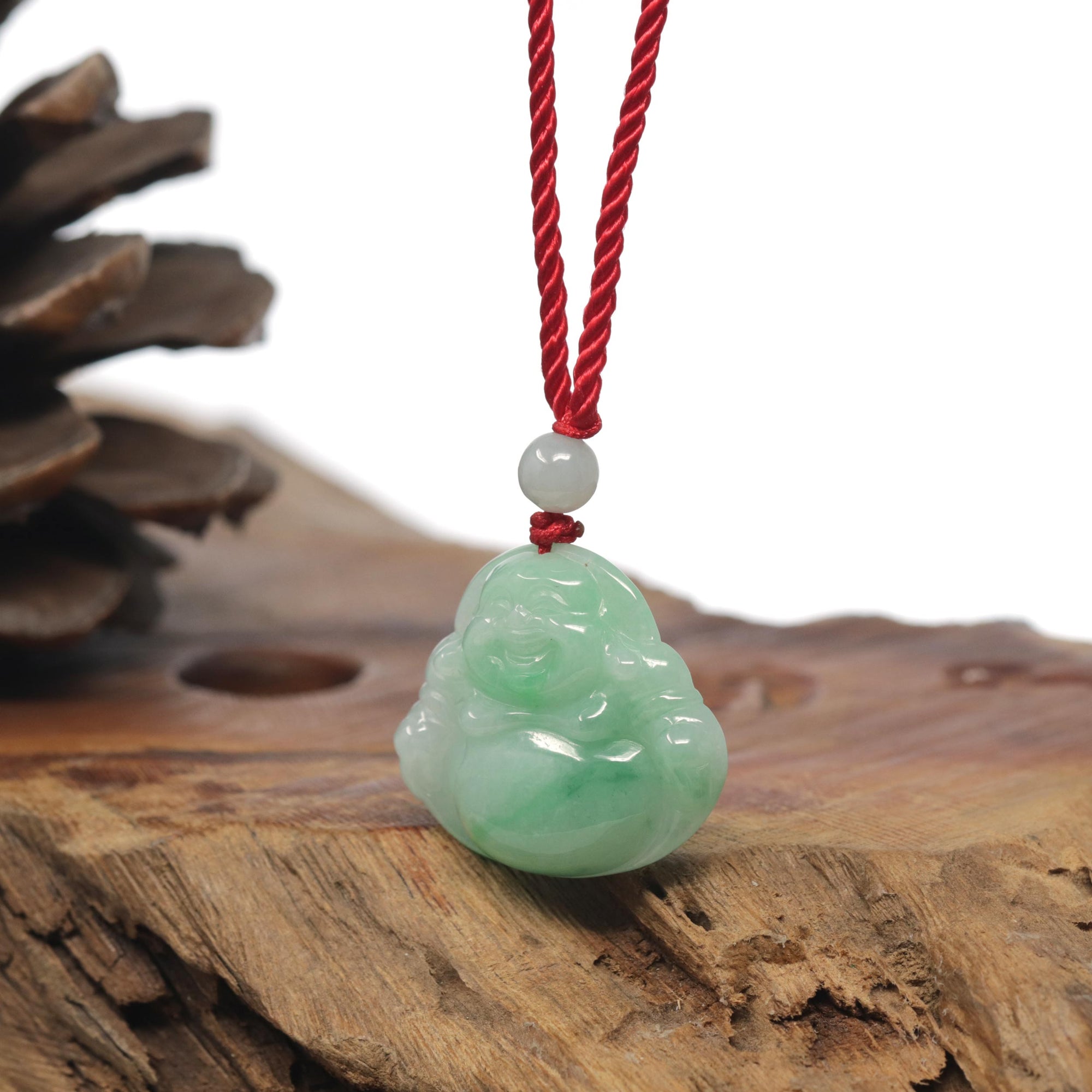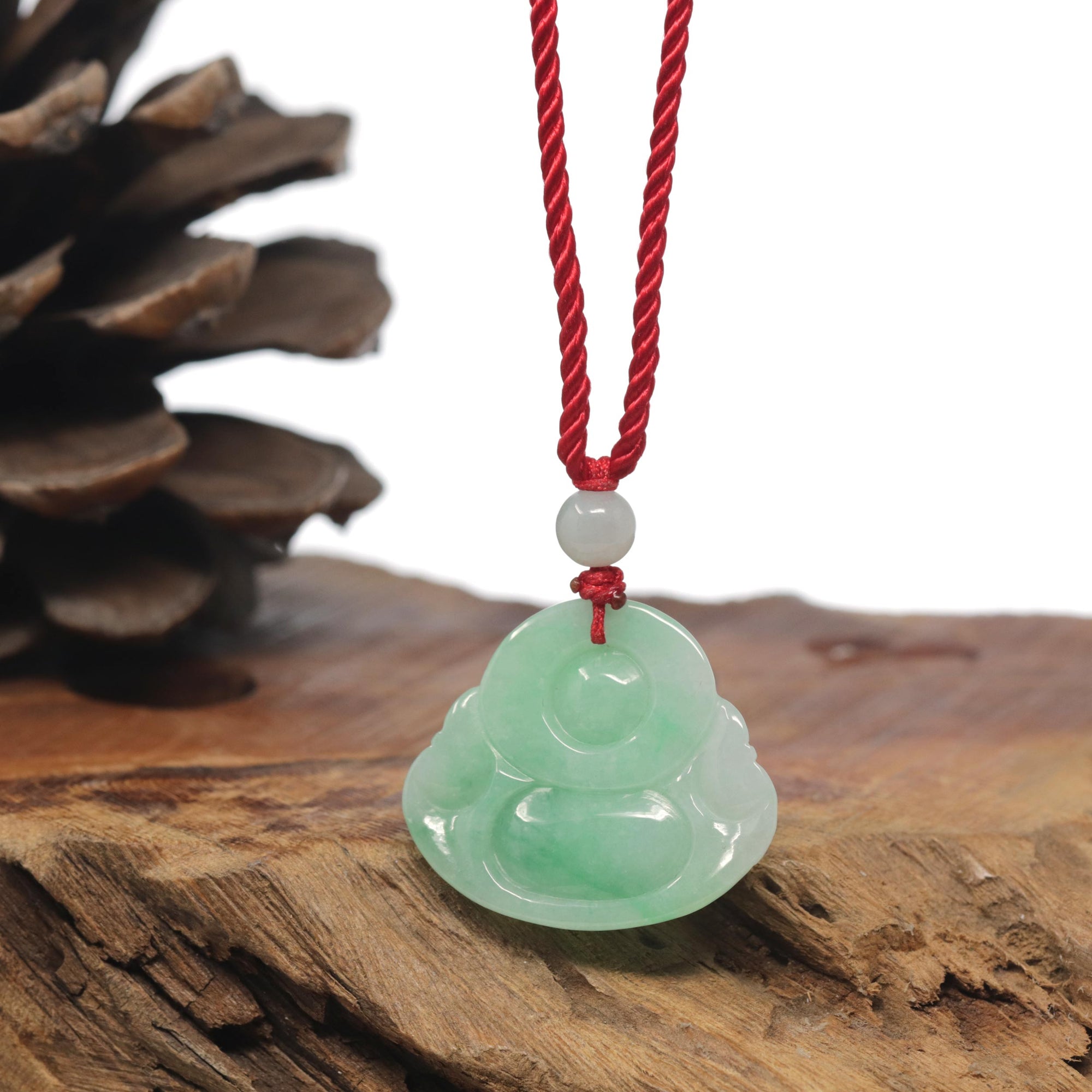 Baikalla Ice Blue Green Flower Jadeite Jade "Happy Buddha" Necklace With 18K Gold Bail