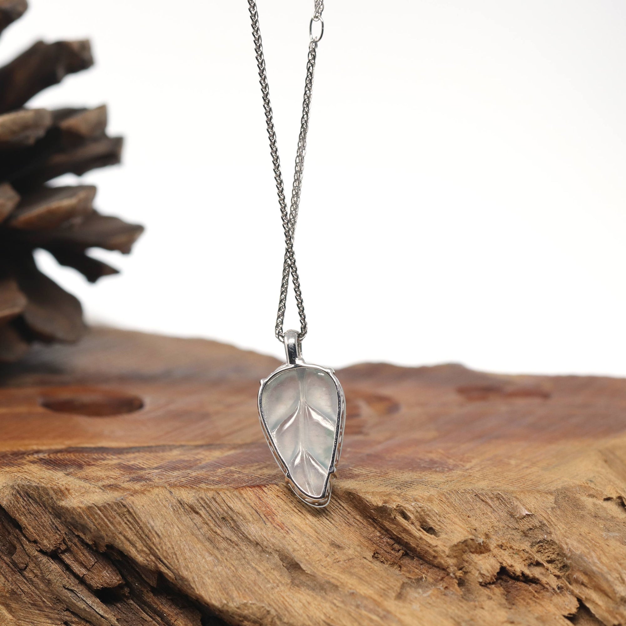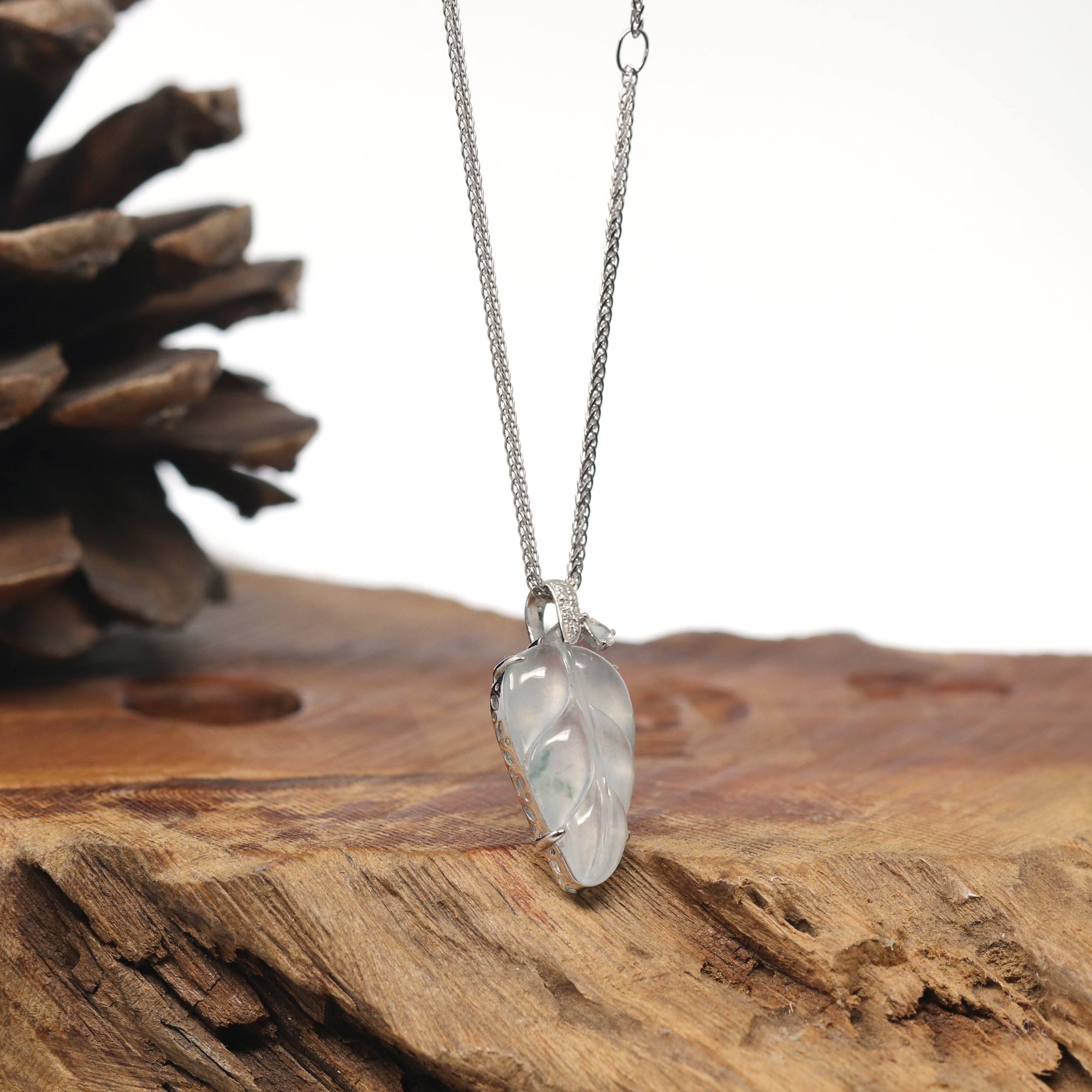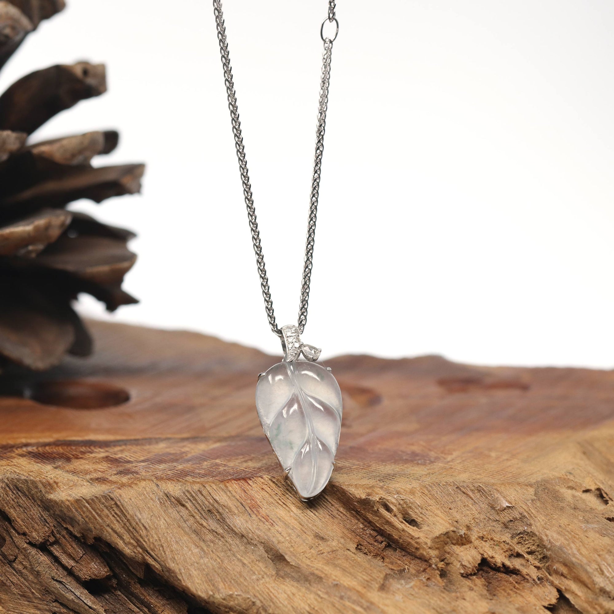 18K White Gold Necklace Ice Leaf Jadeite Jade Pendant Necklace W/ Natural Diamonds