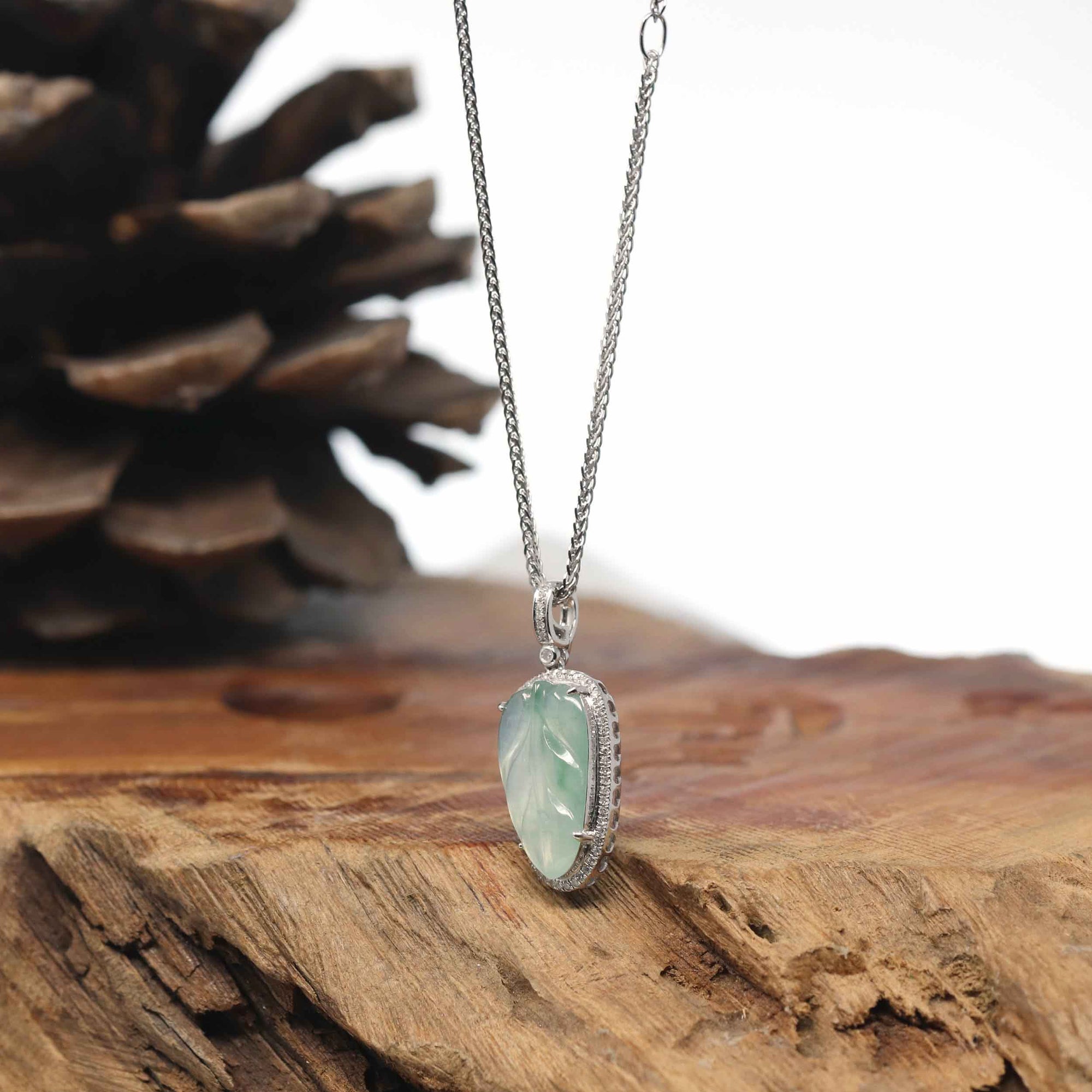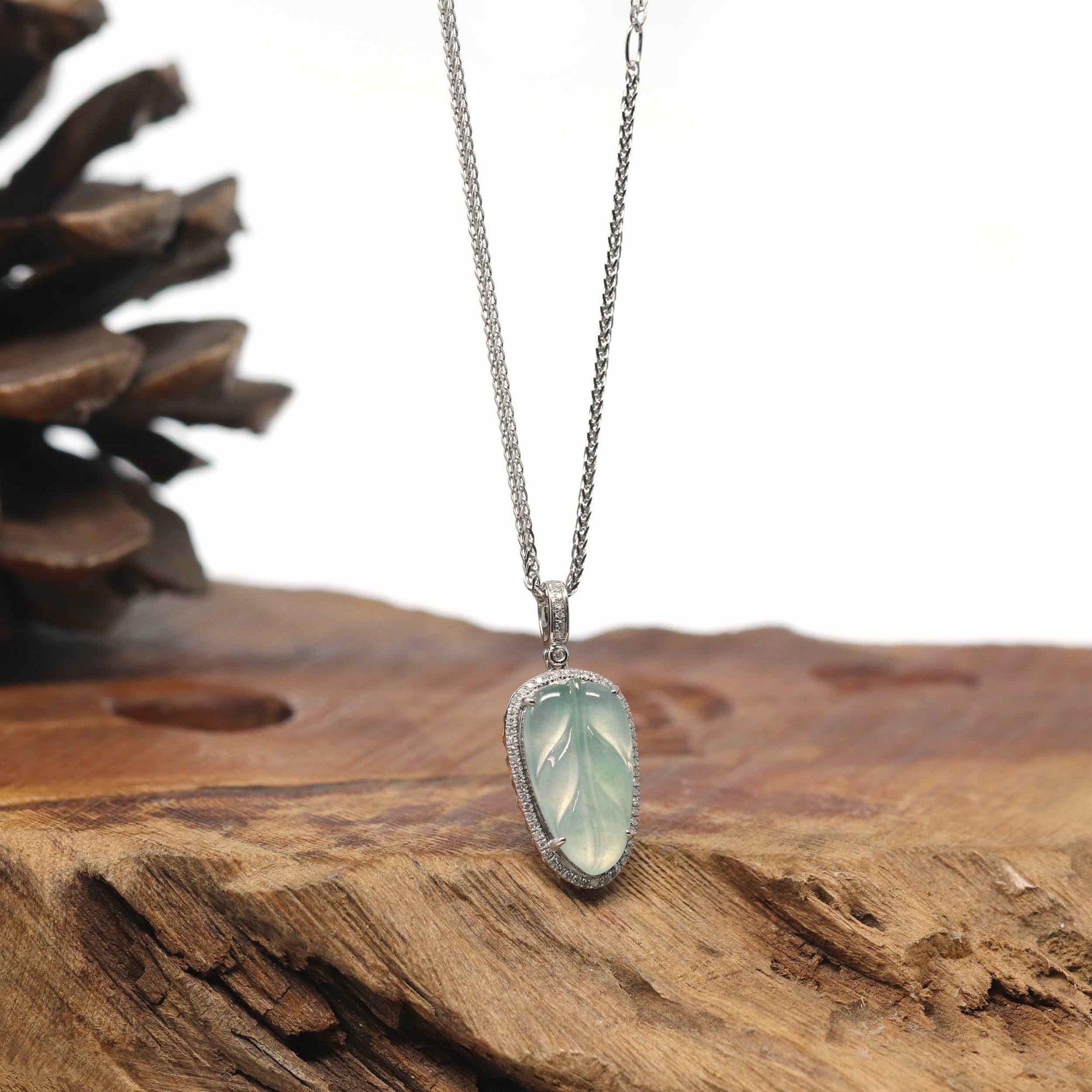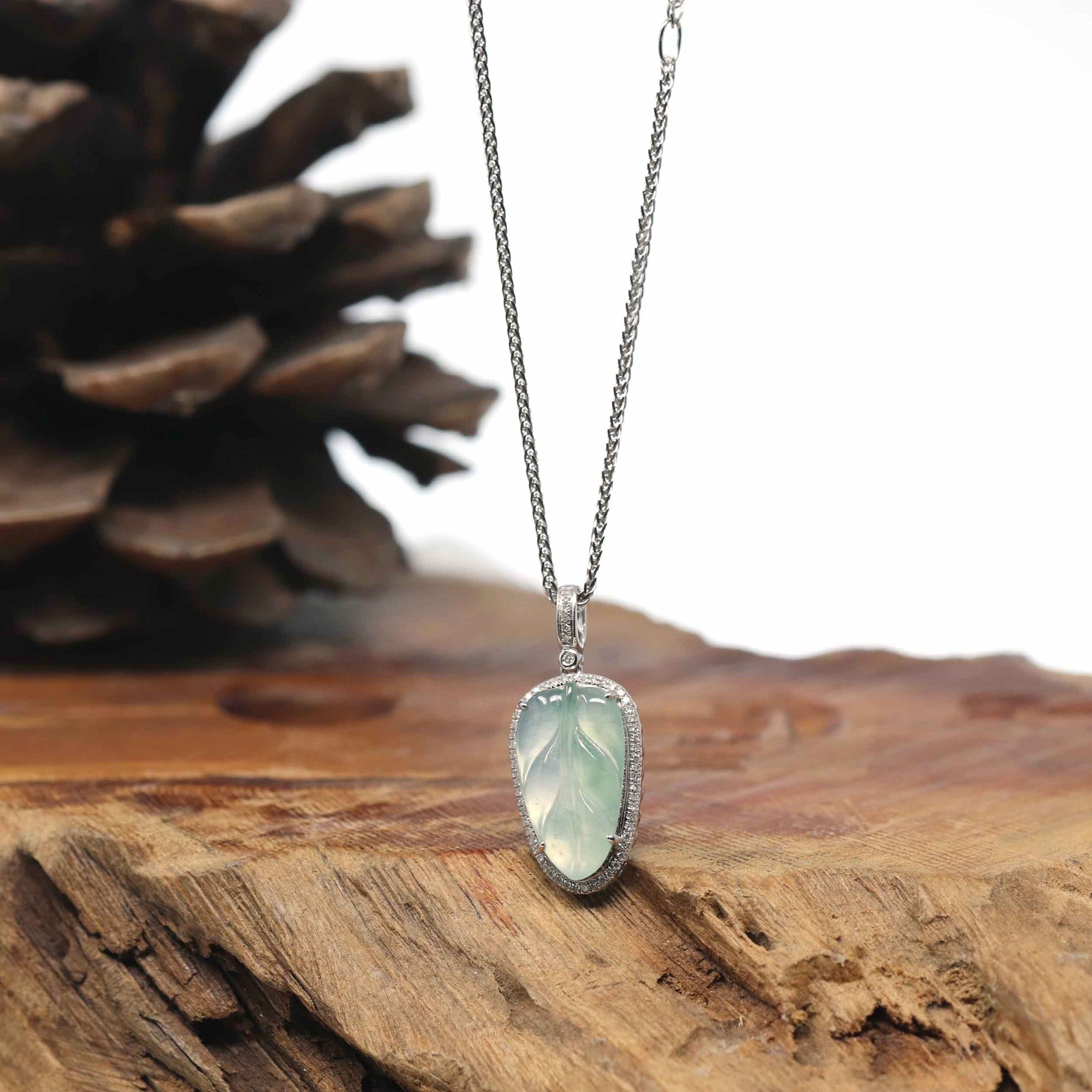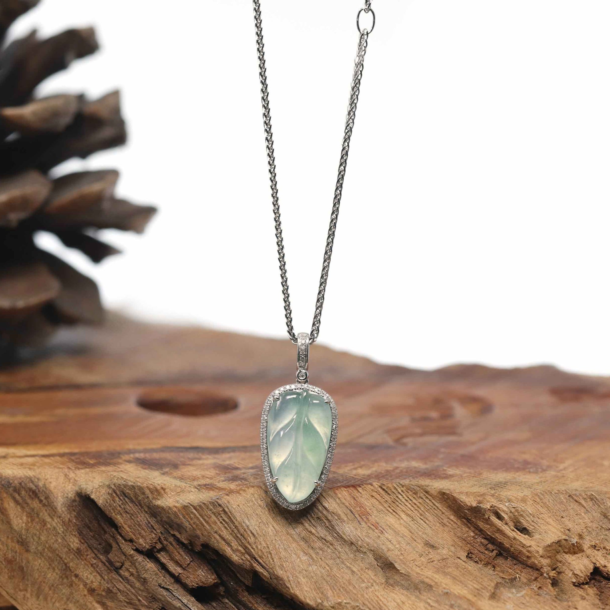 18K White Gold "Leaf" Necklace Ice Light Green Jadeite Jade Pendant w/ Natural Diamonds