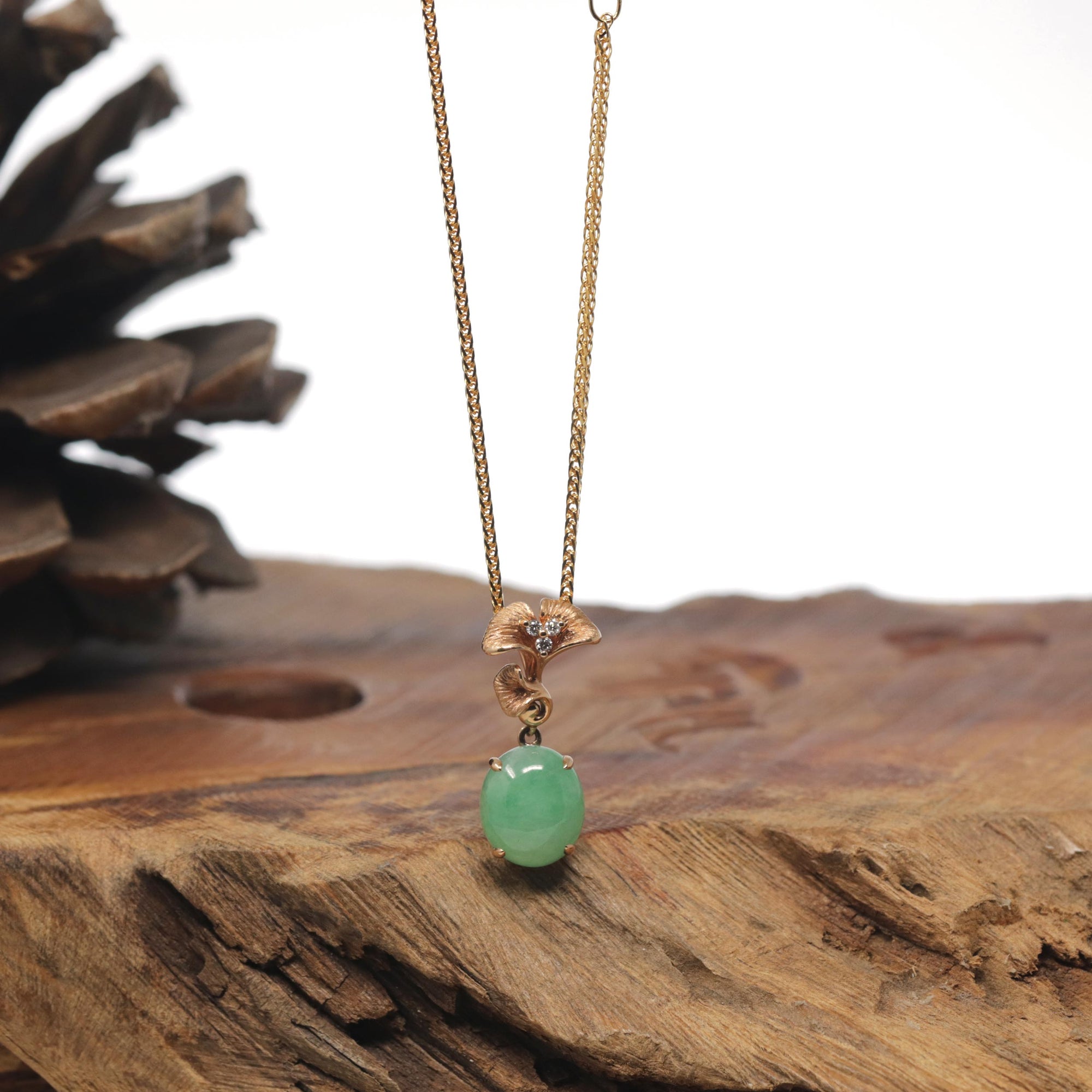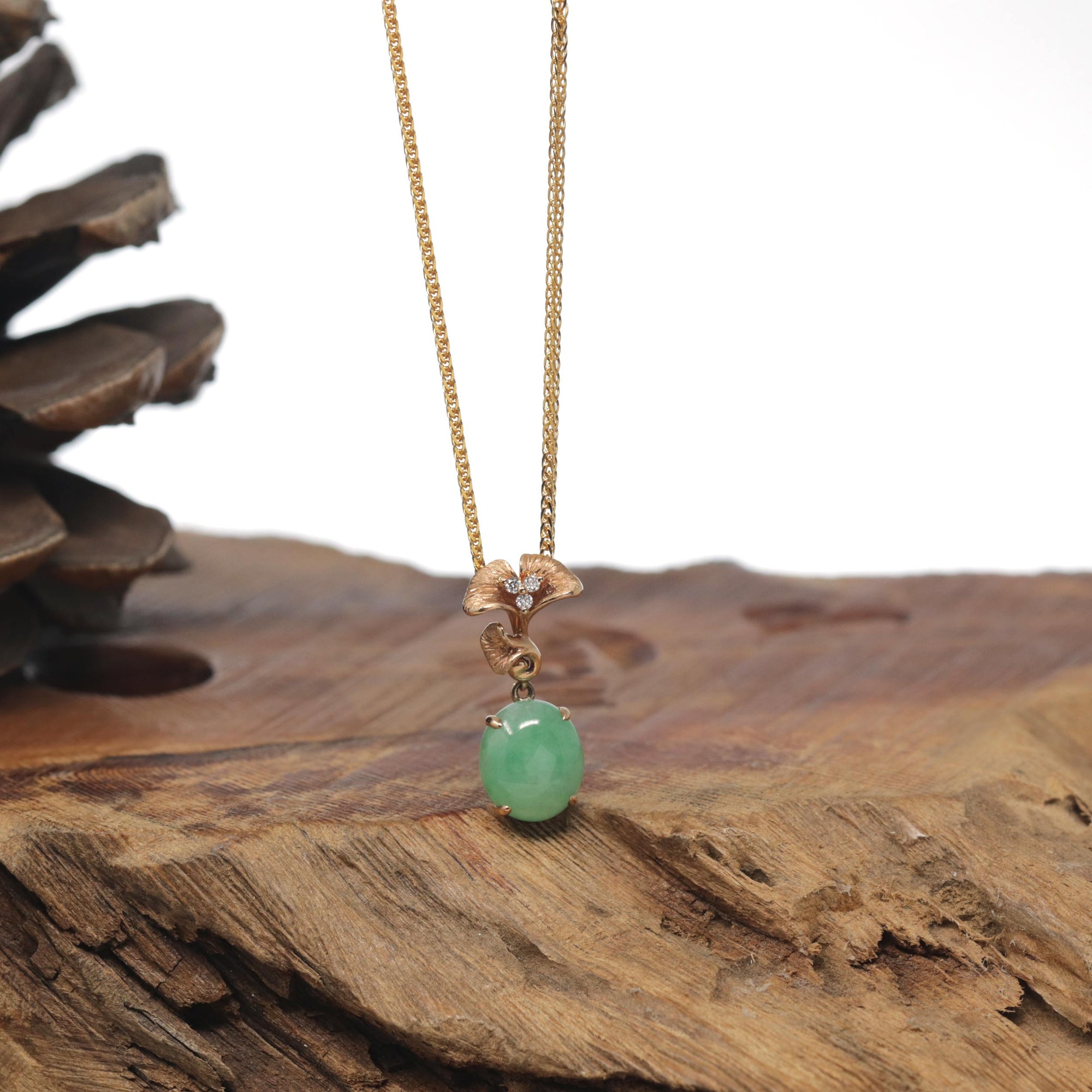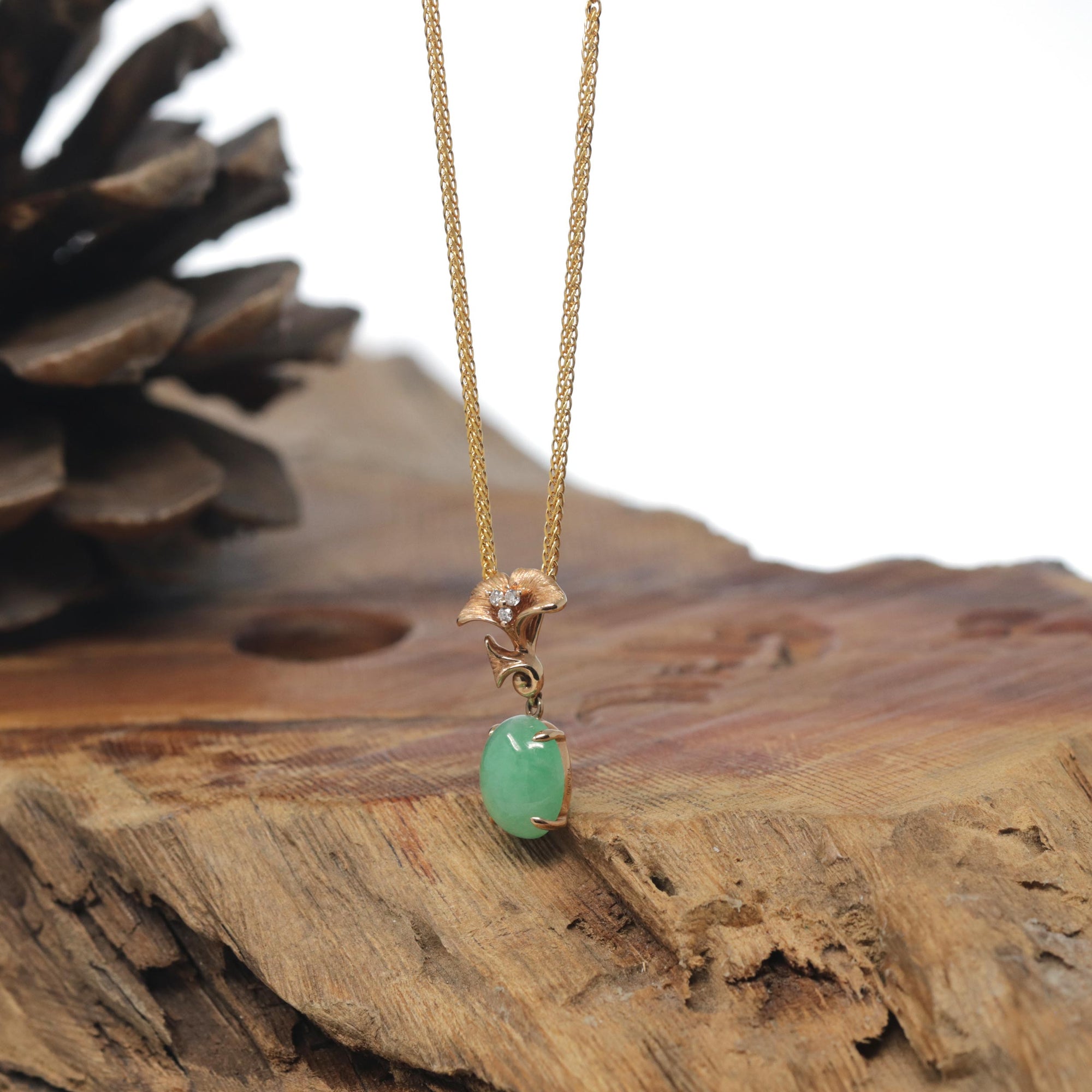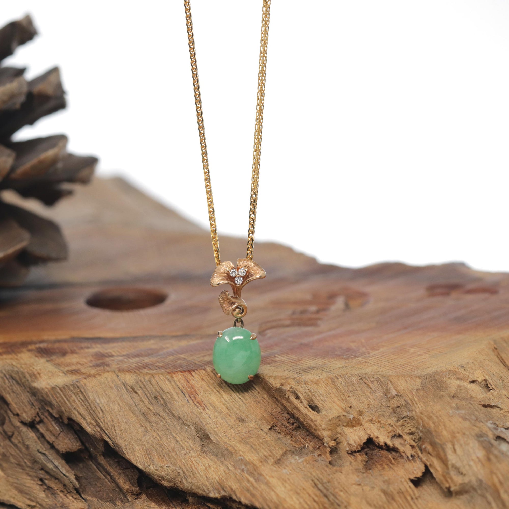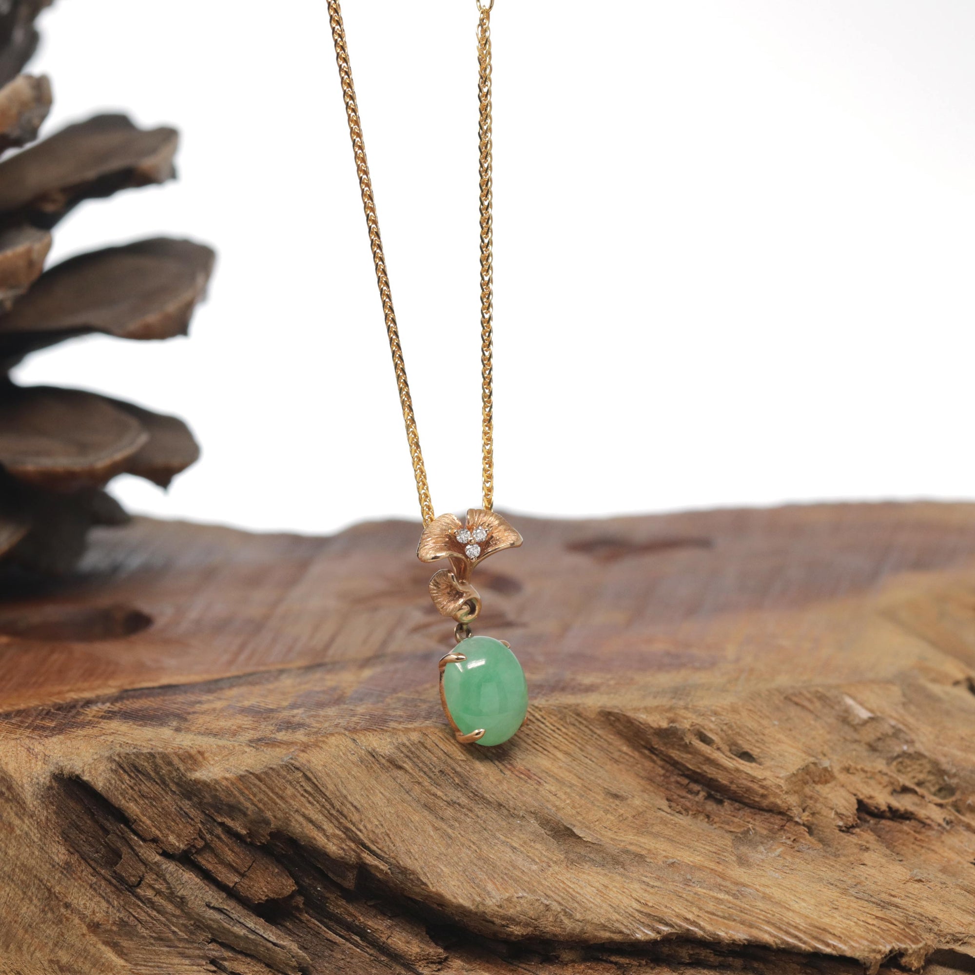 18K White Gold "Leaf" Necklace Ice Light Green Jadeite Jade Pendant w/ Natural Diamonds