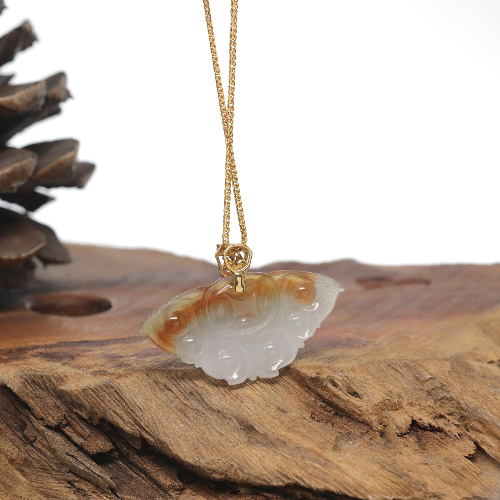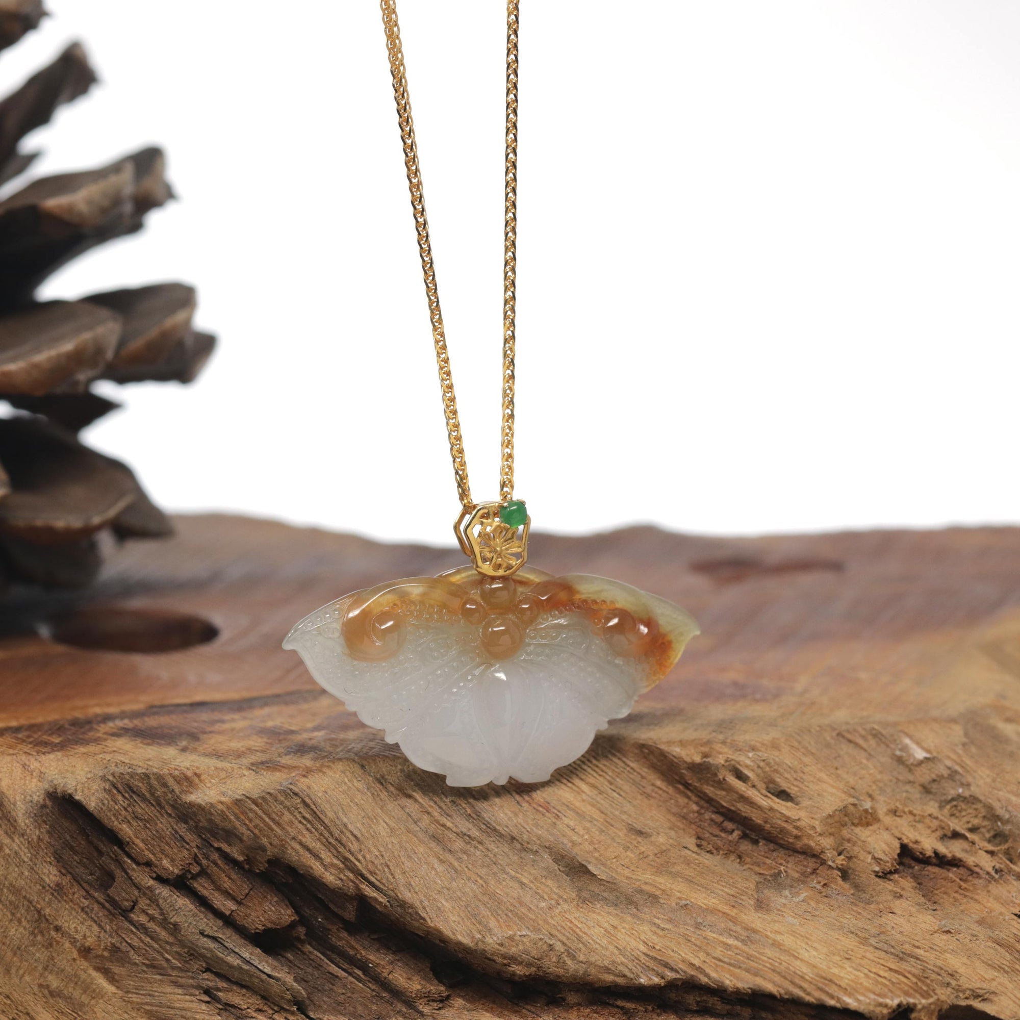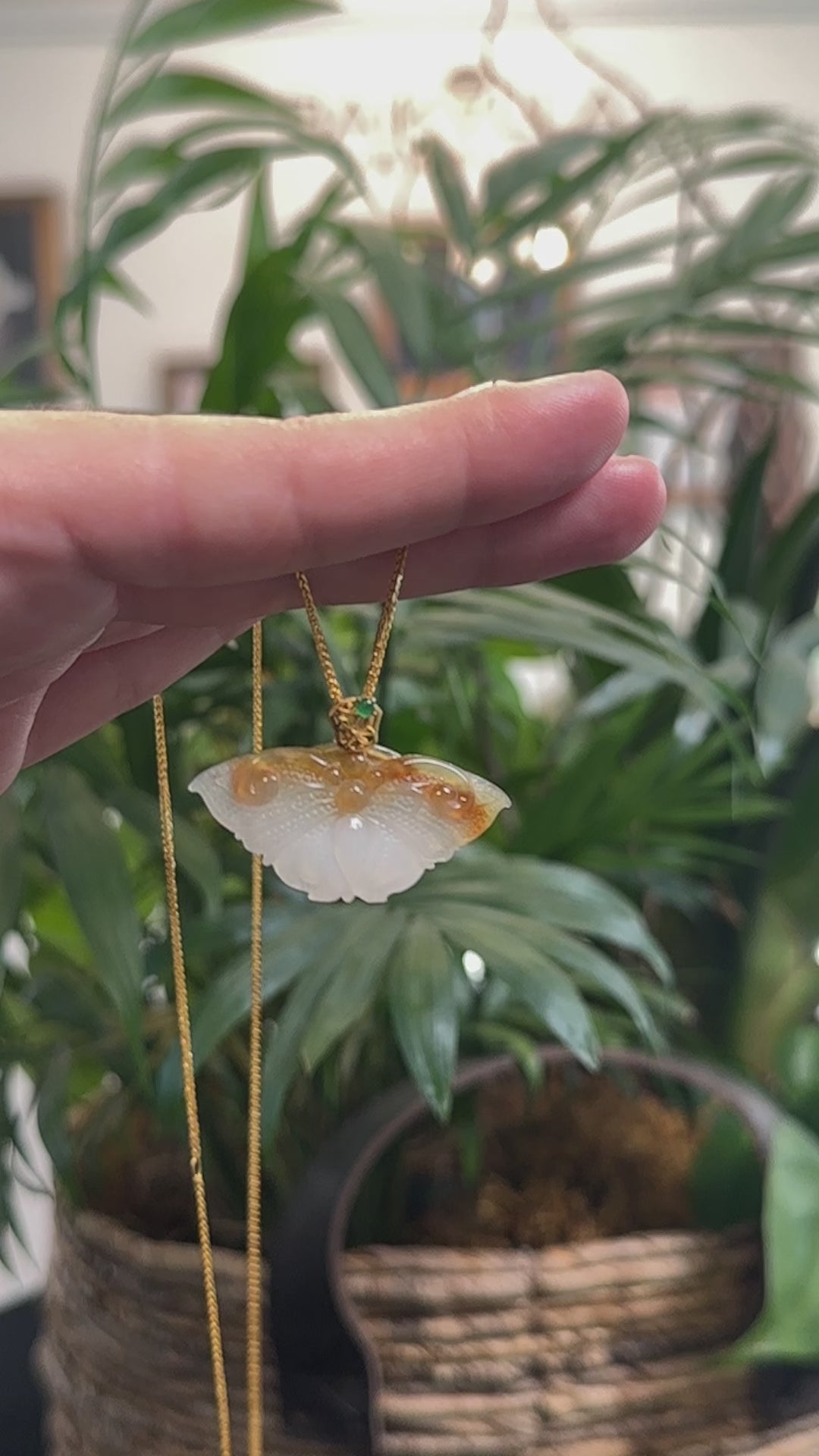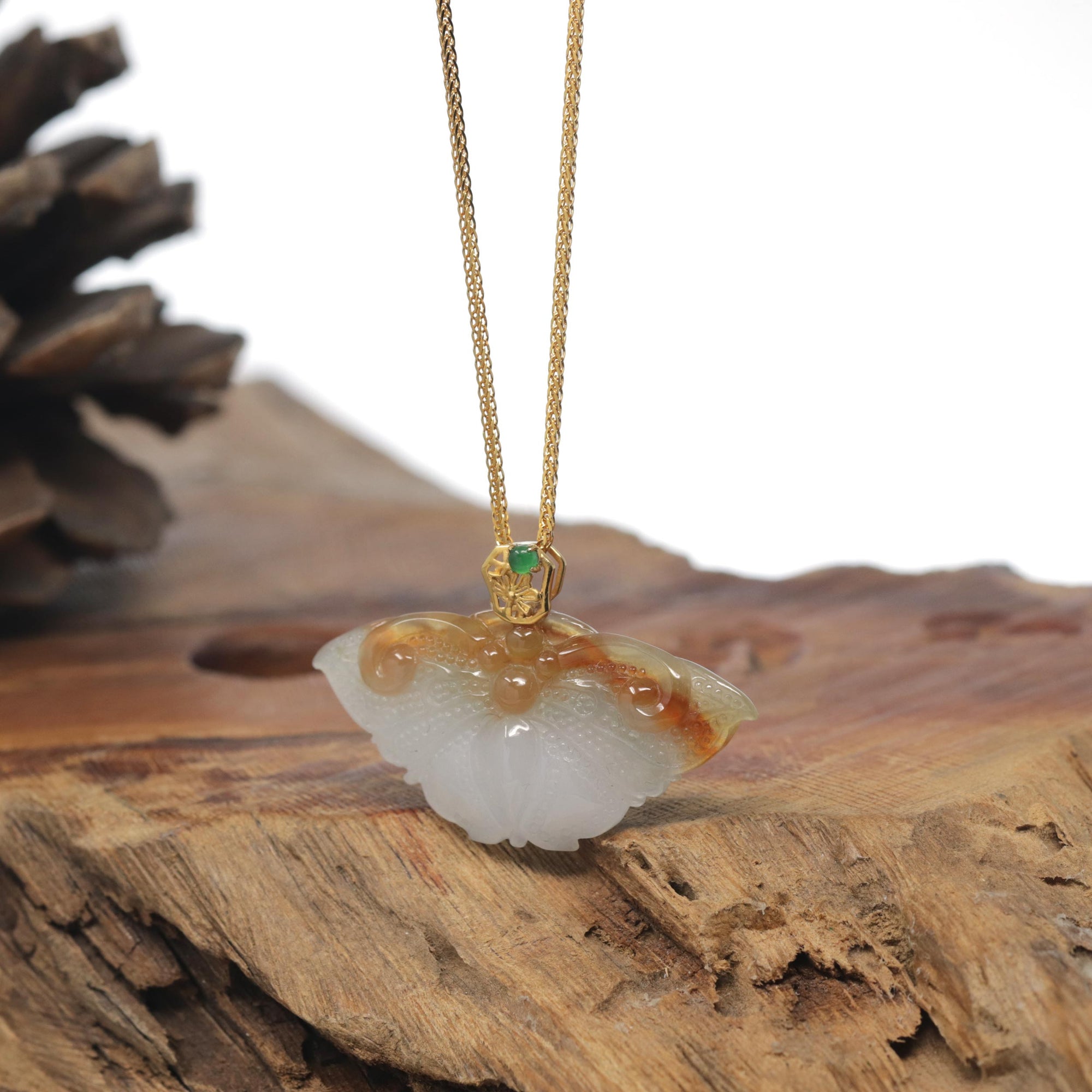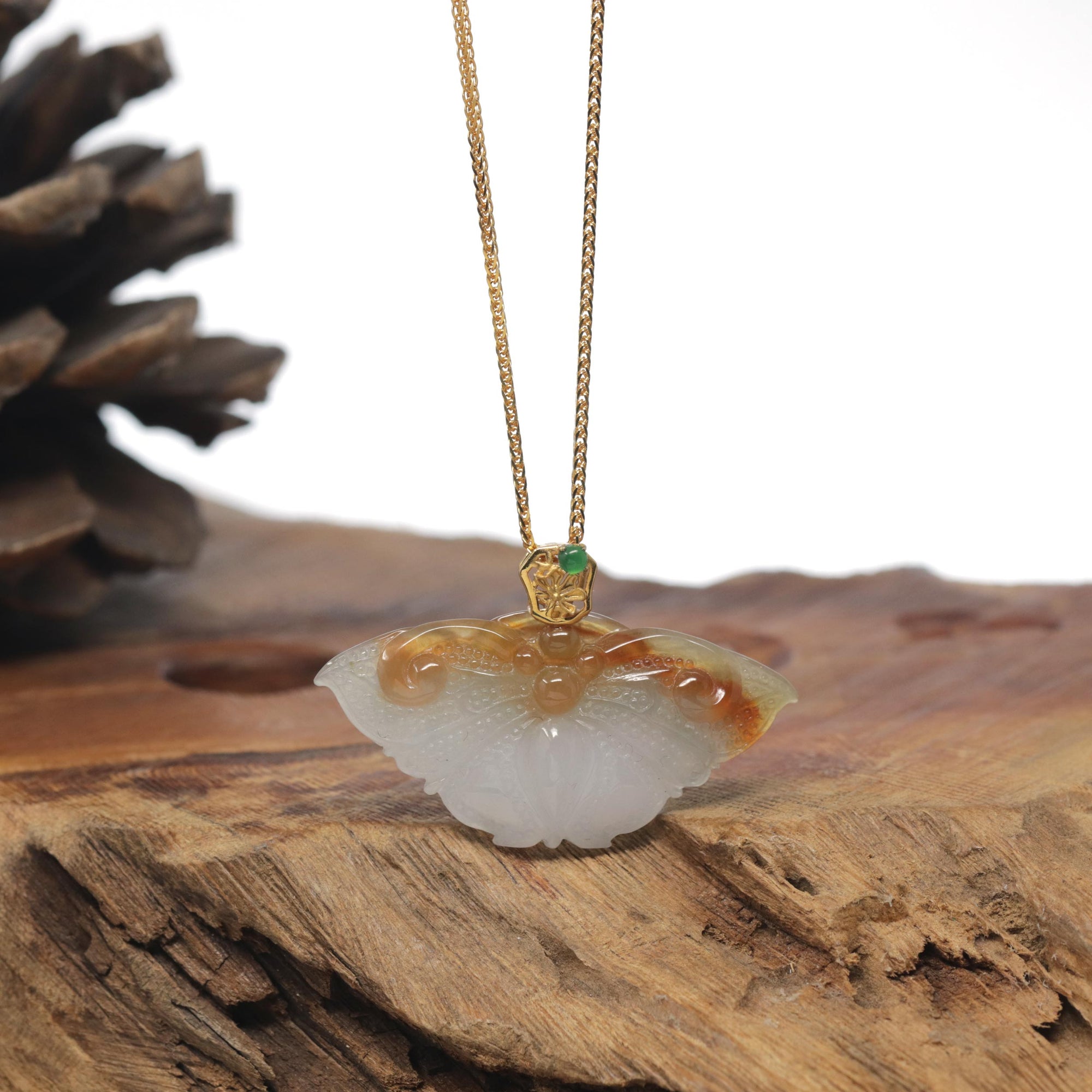 Baikalla Icy White & Red-Brown Genuine Burmese Jadeite Jade Butterfly Pendant W/ 18K Yellow Gold Bail