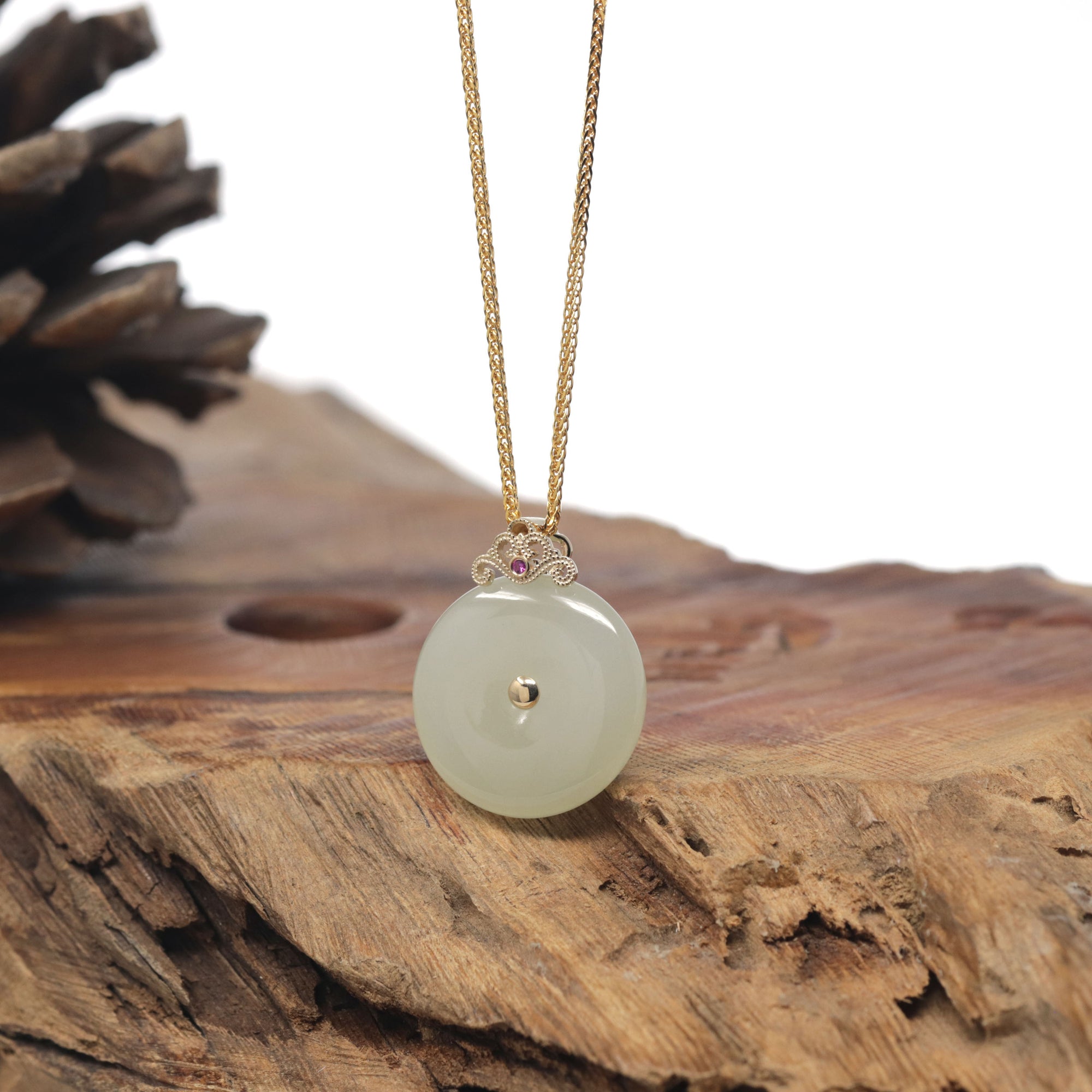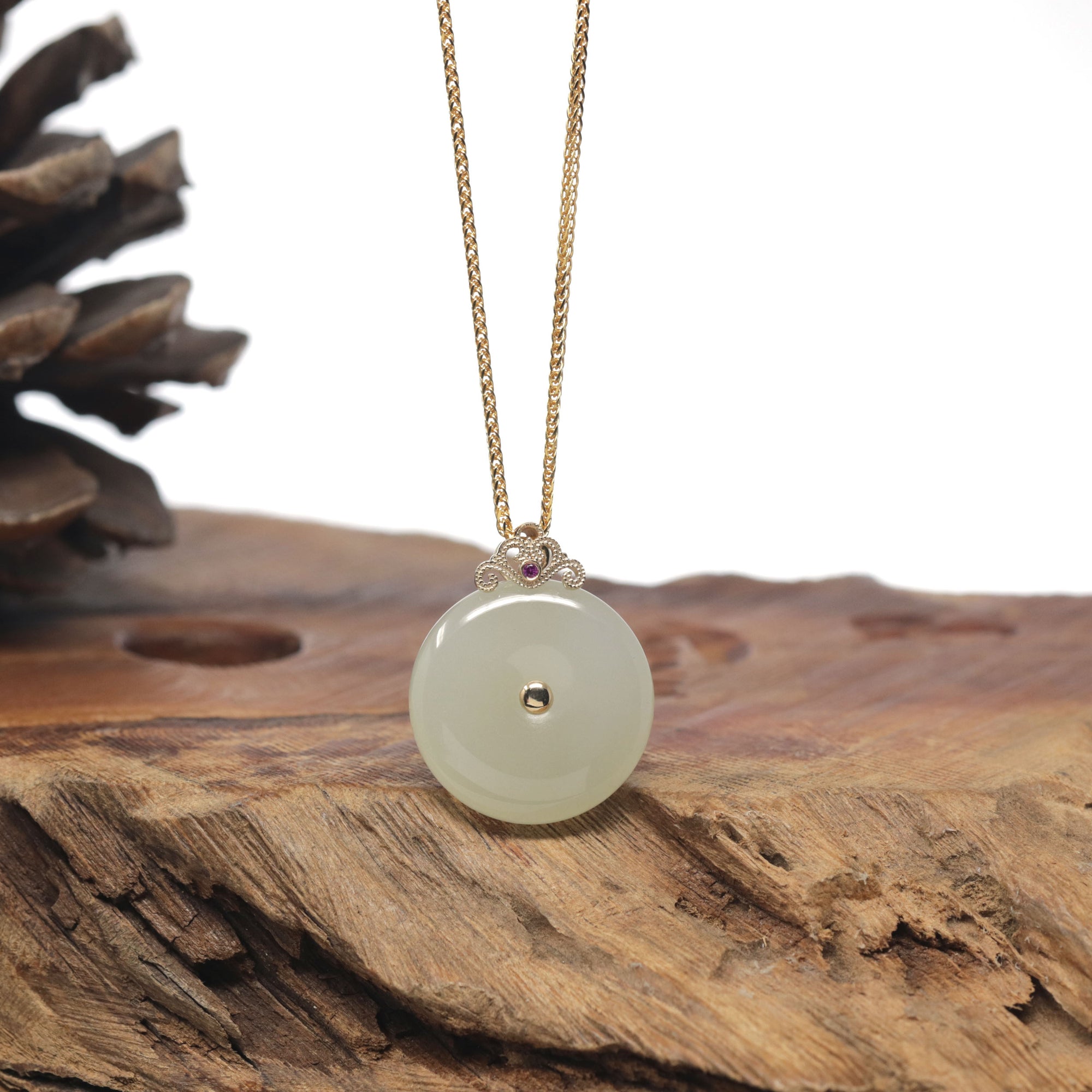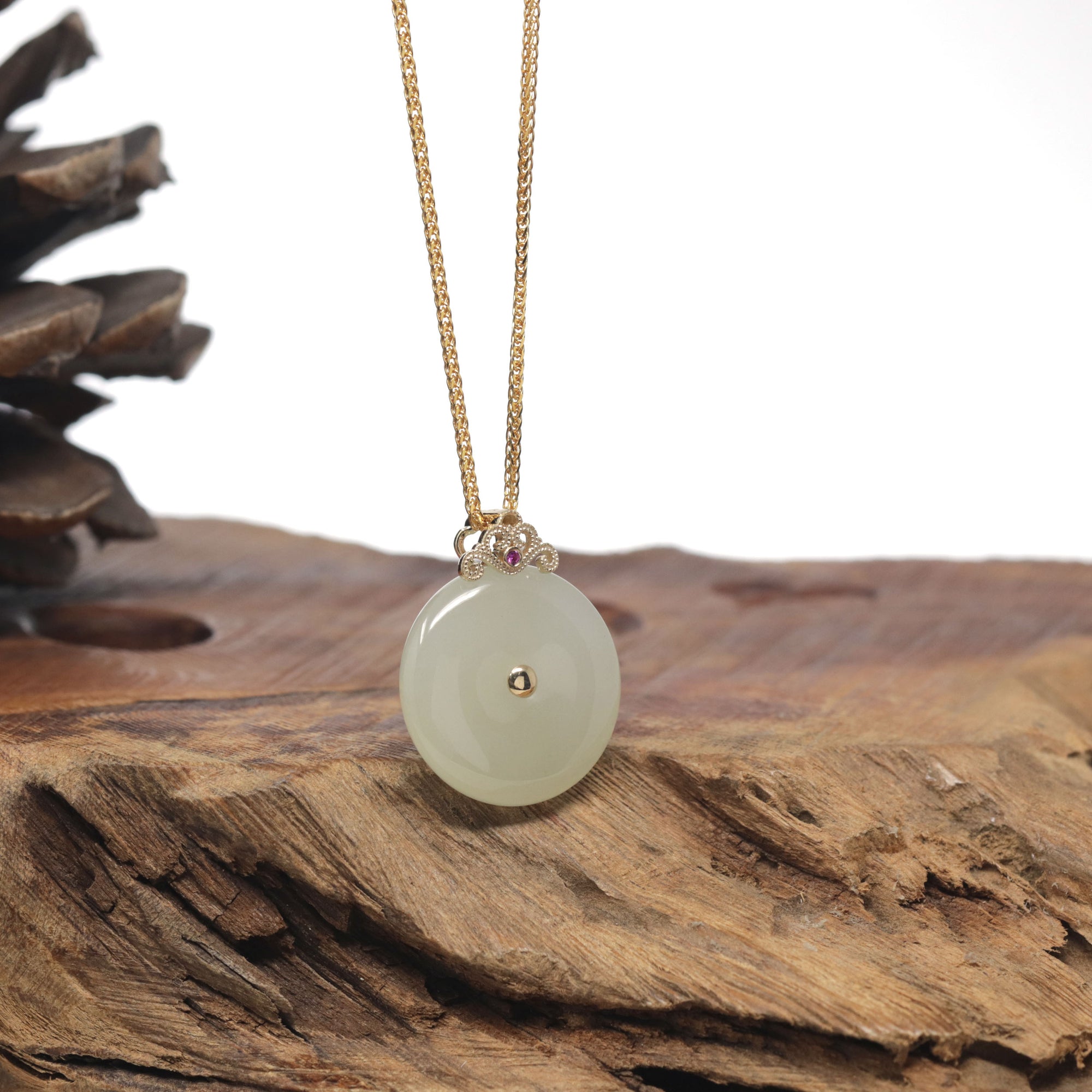 Baikalla "Ping An Kou" (Good Luck Button) Nephrite Jade Pendant W/ 18K Yellow Gold Bail & Tourmaline