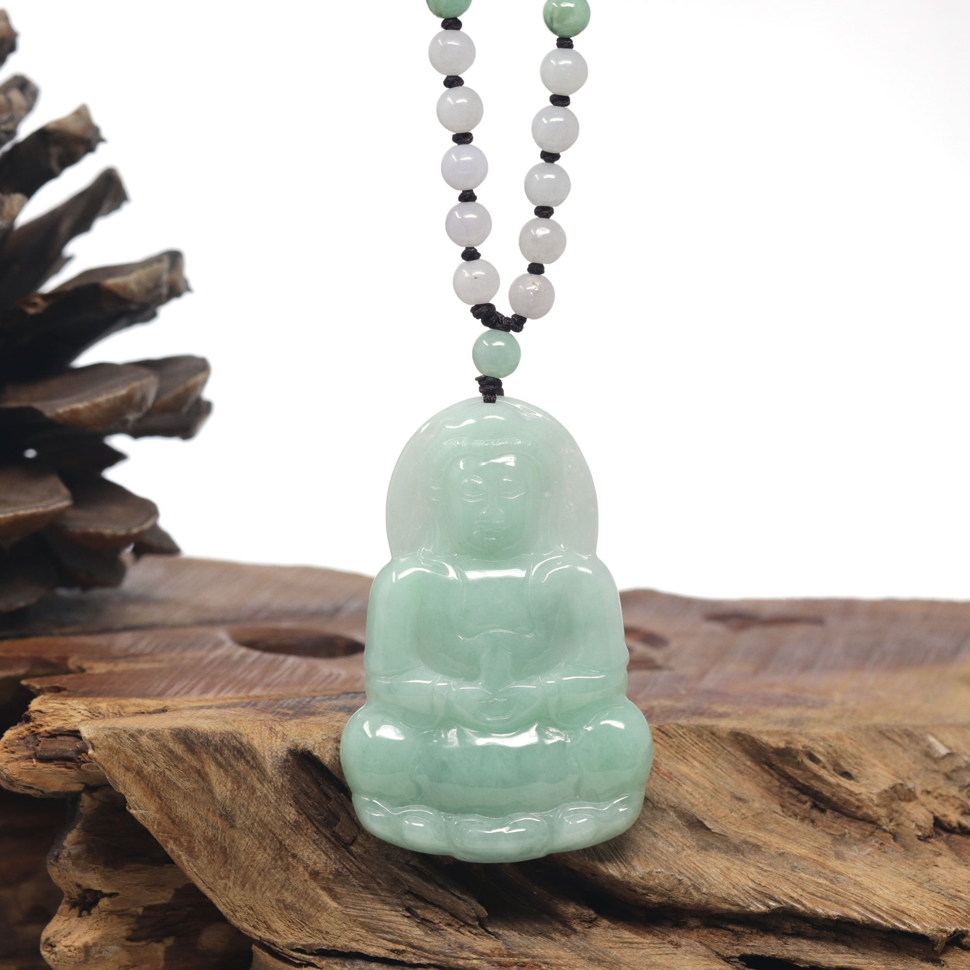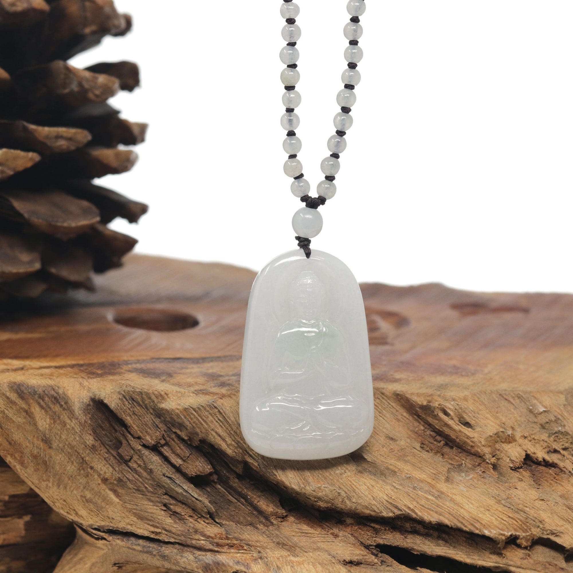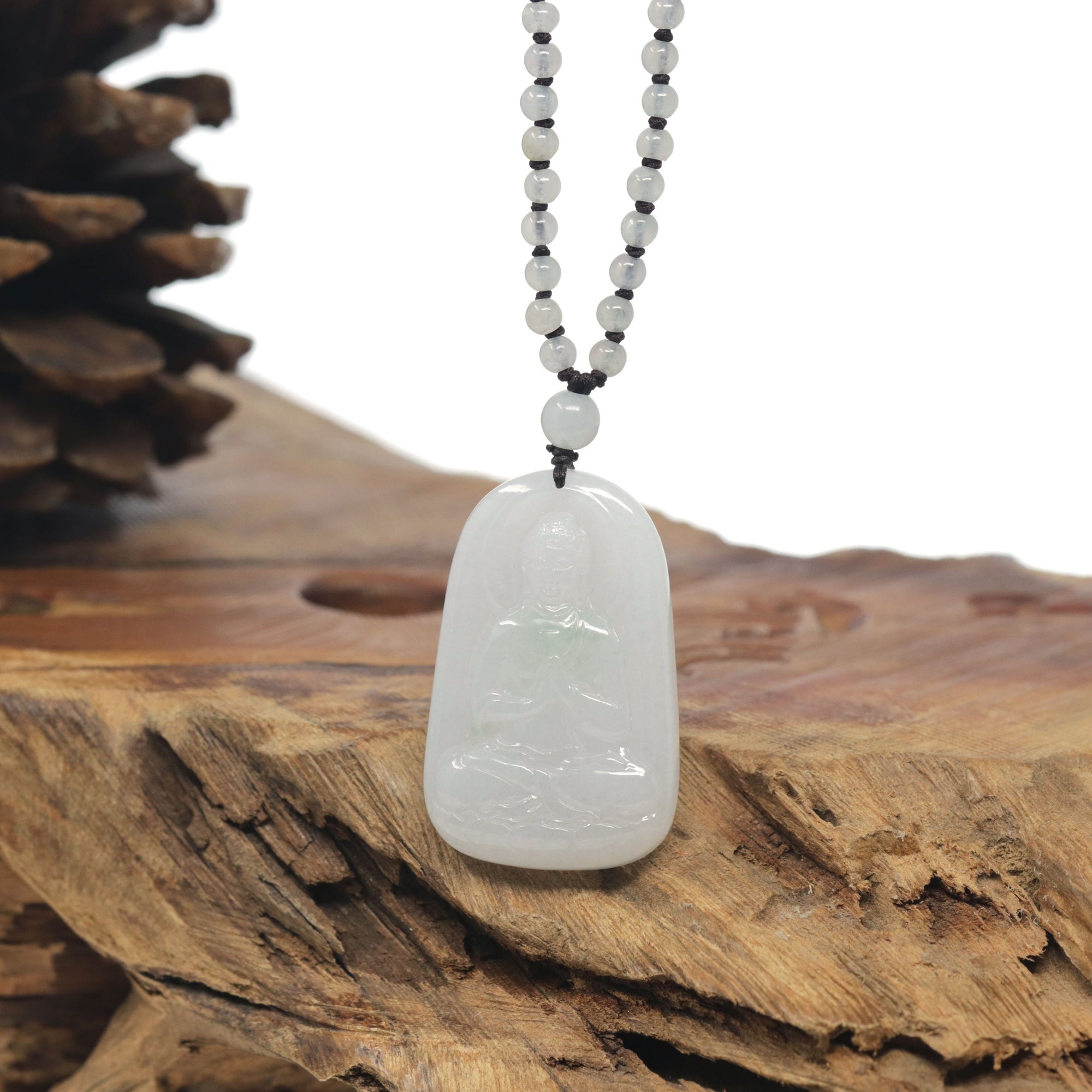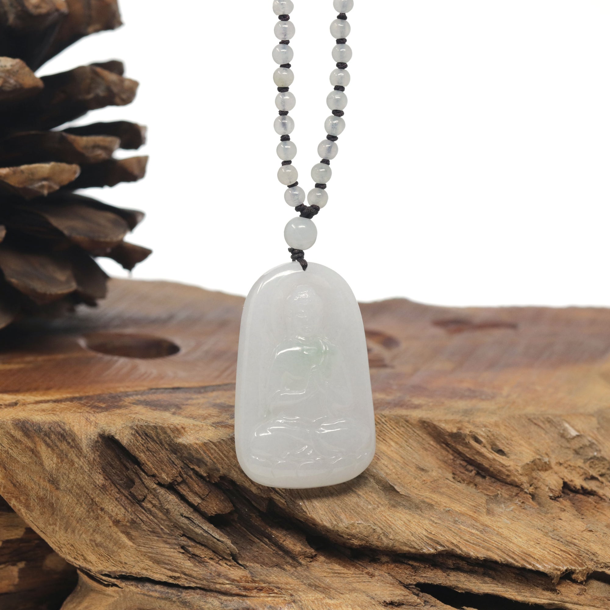 Baikalla Icy White & Green Guan Yin "Goddess of Compassion" Jadeite Jade Pendant W/ Beaded Necklace
