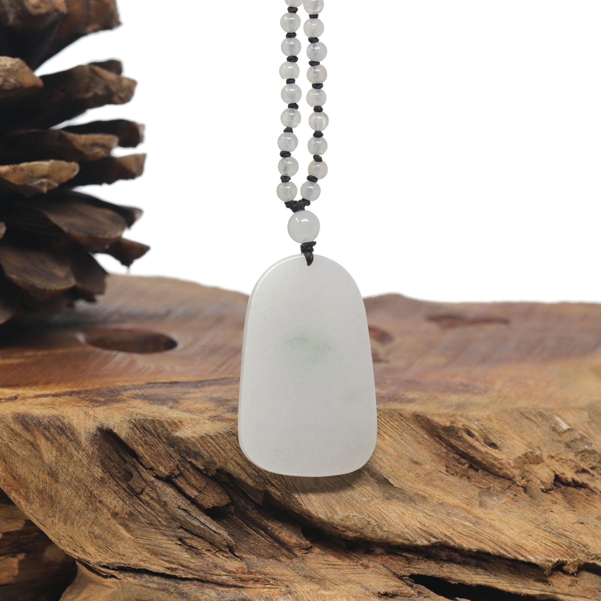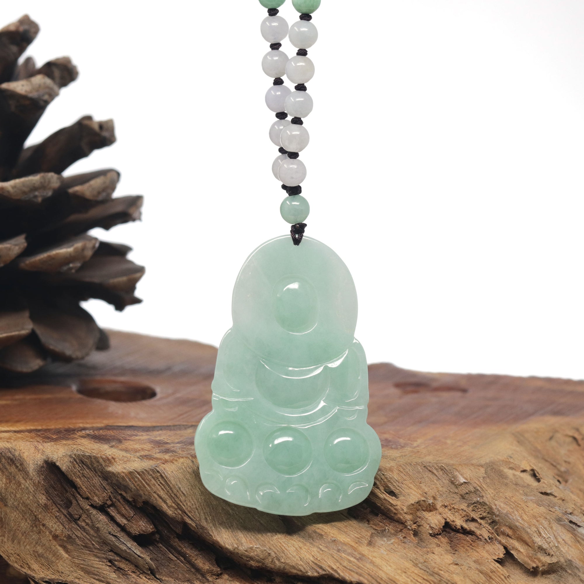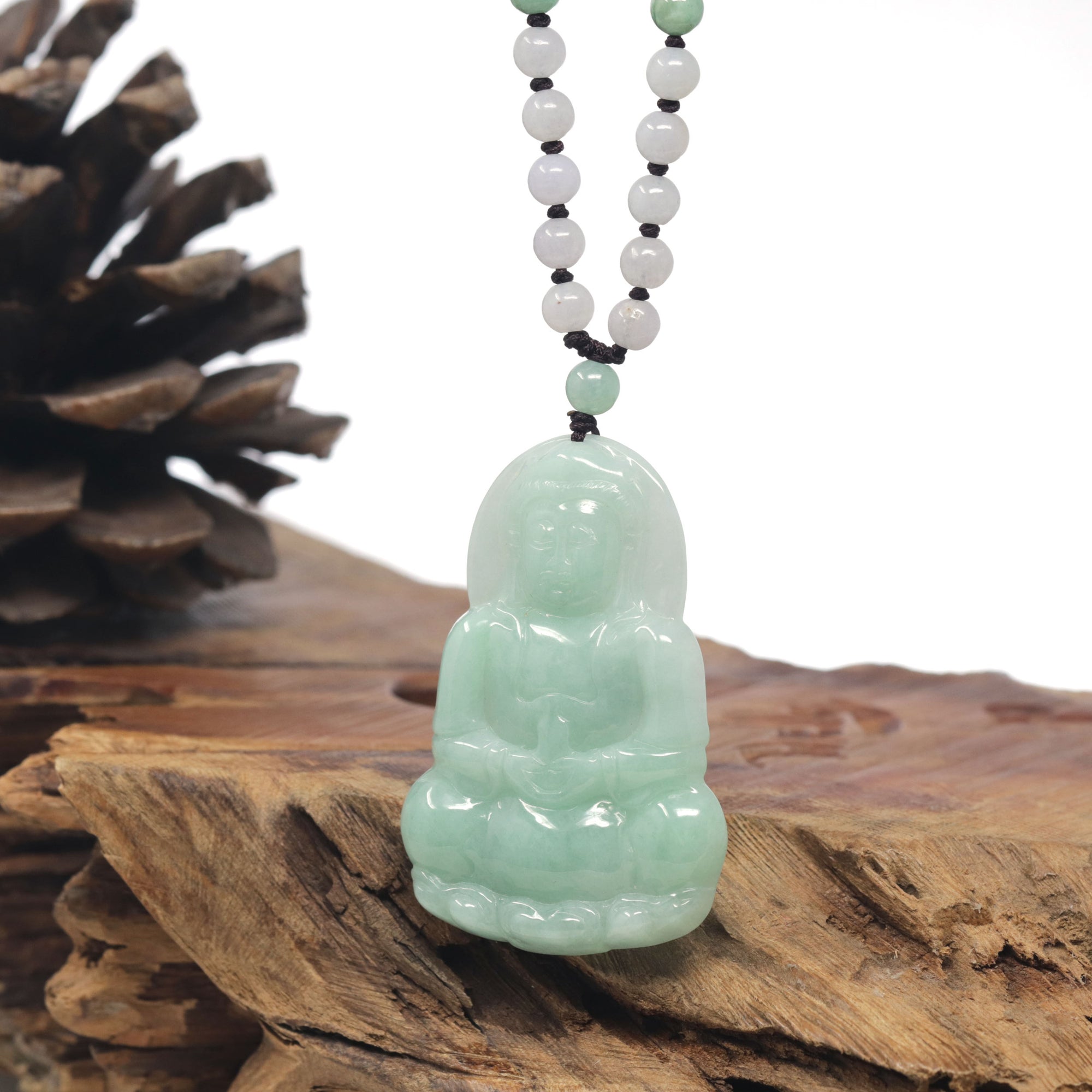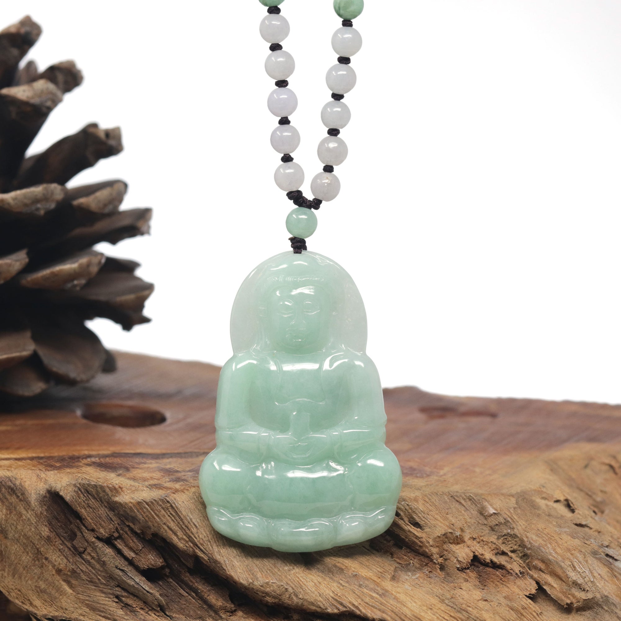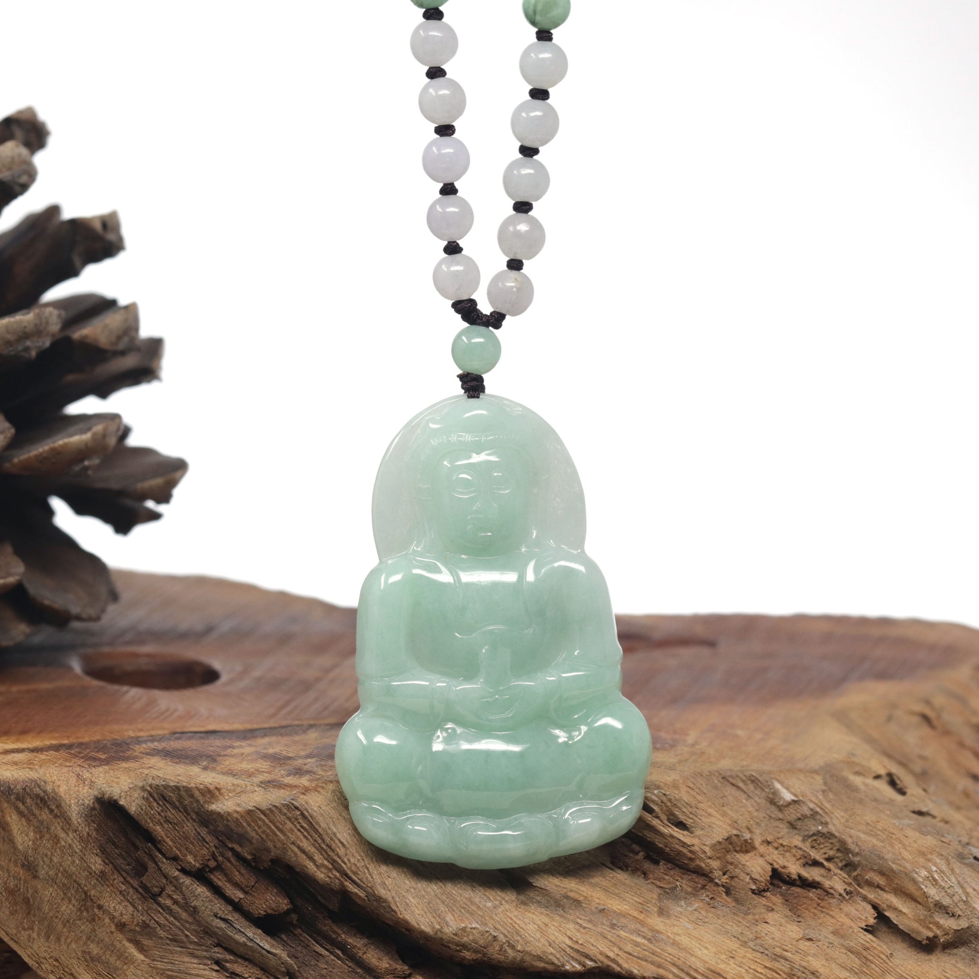 Baikalla Icy White & Green Guan Yin "Goddess of Compassion" Jadeite Jade Pendant W/ Beaded Necklace