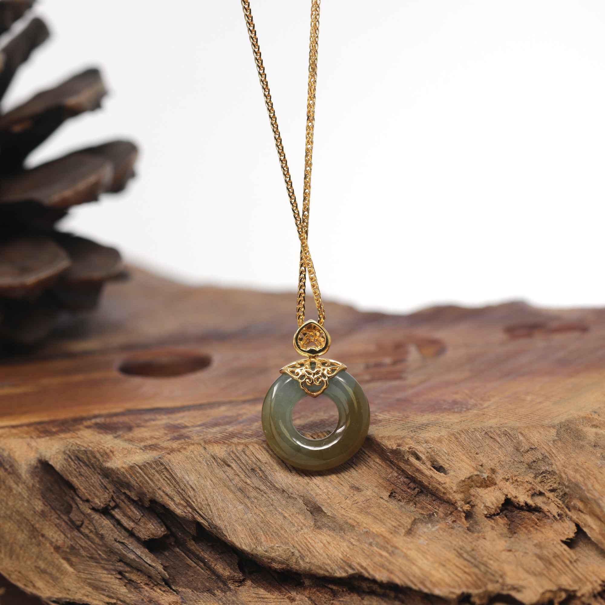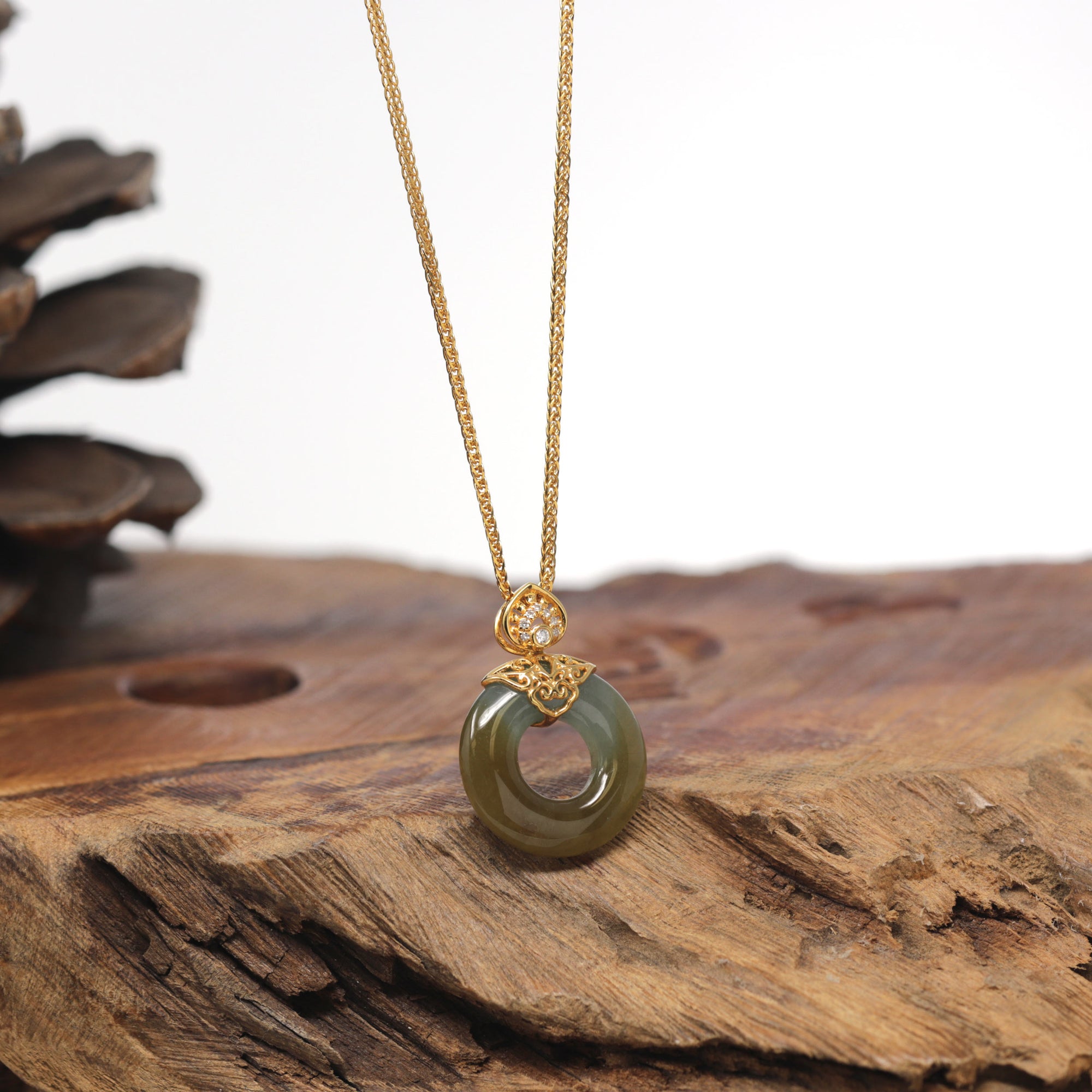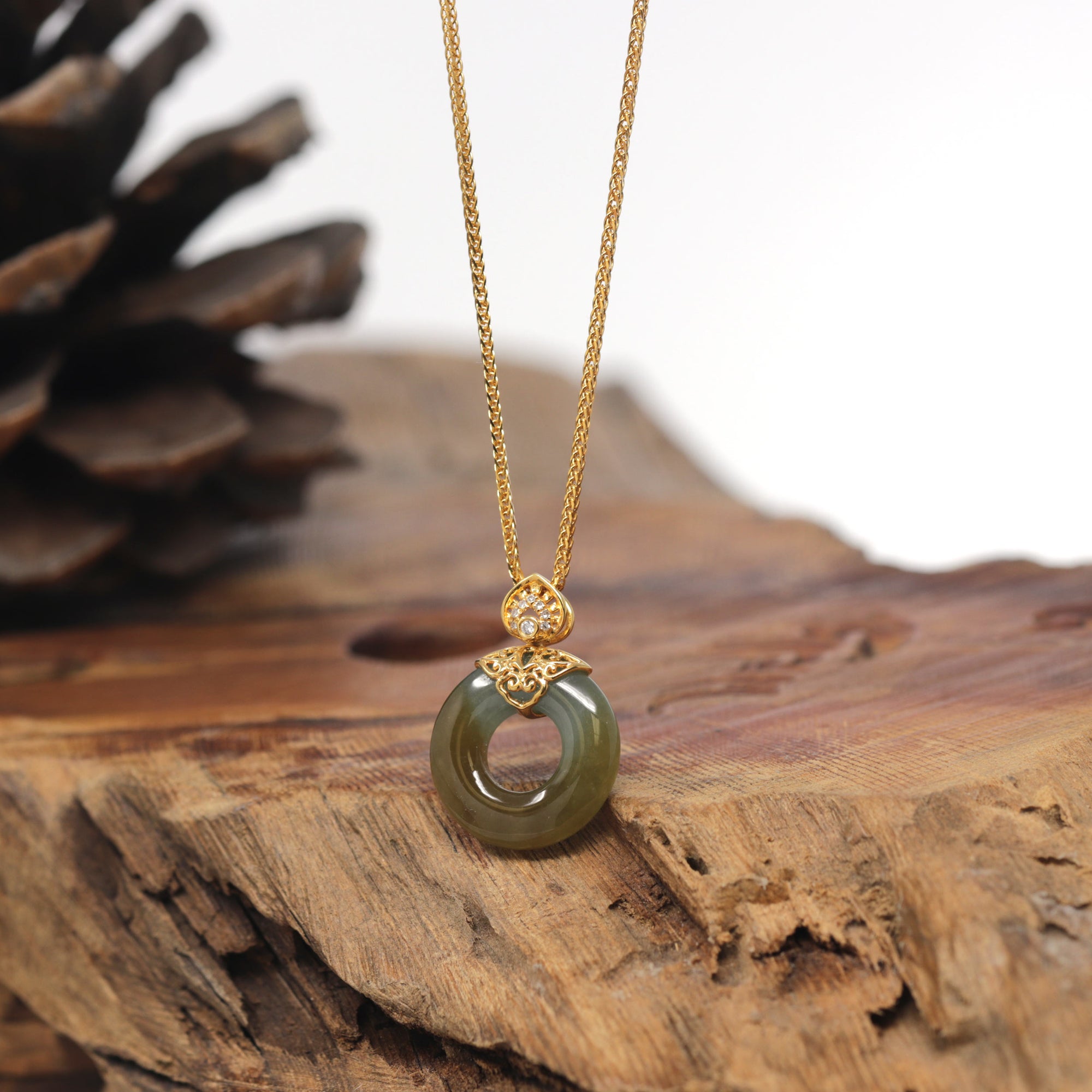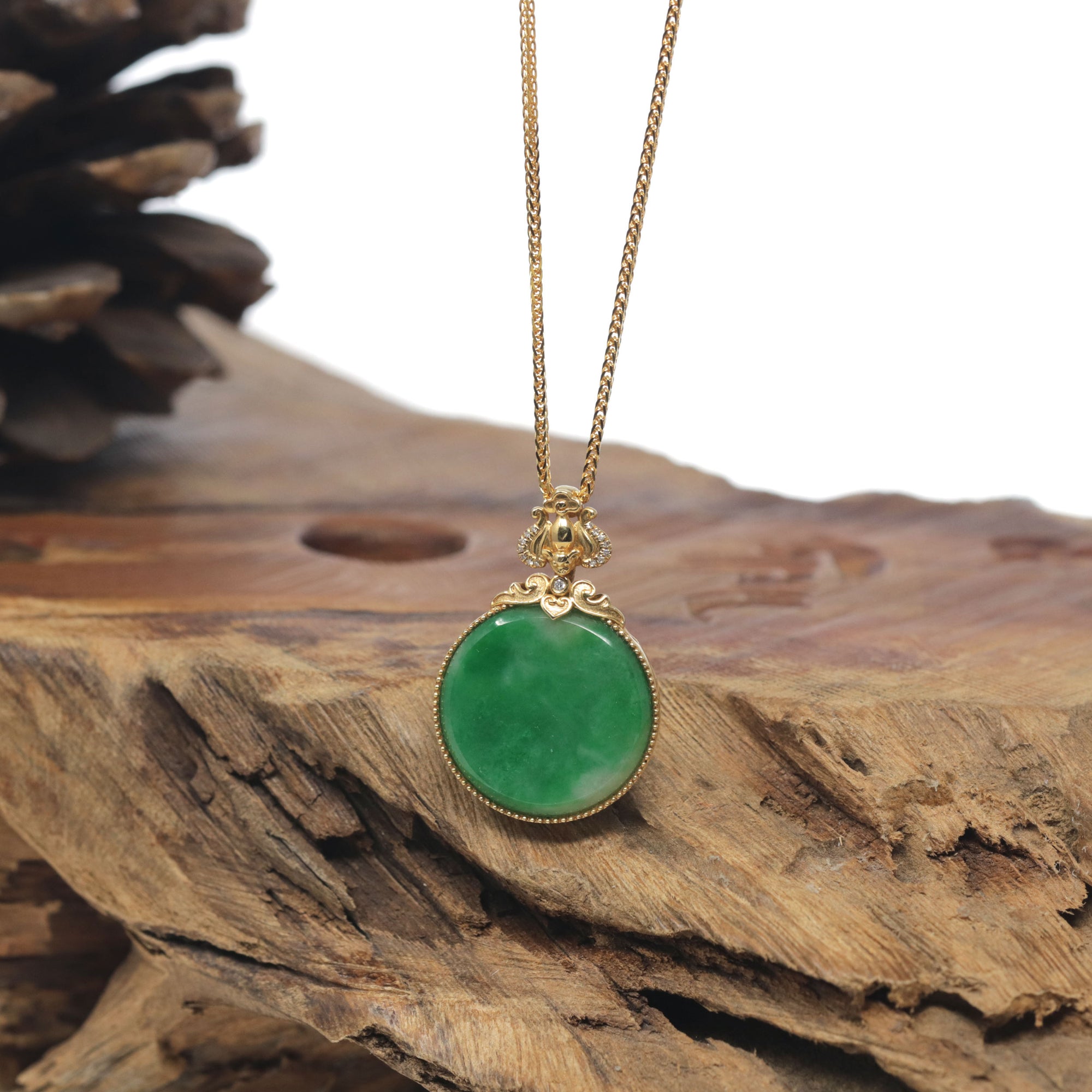 Baikalla 18K Yellow Gold & Forest Green "Ping An Kou" Jadeite Jade Pendant W/ Natural Diamonds