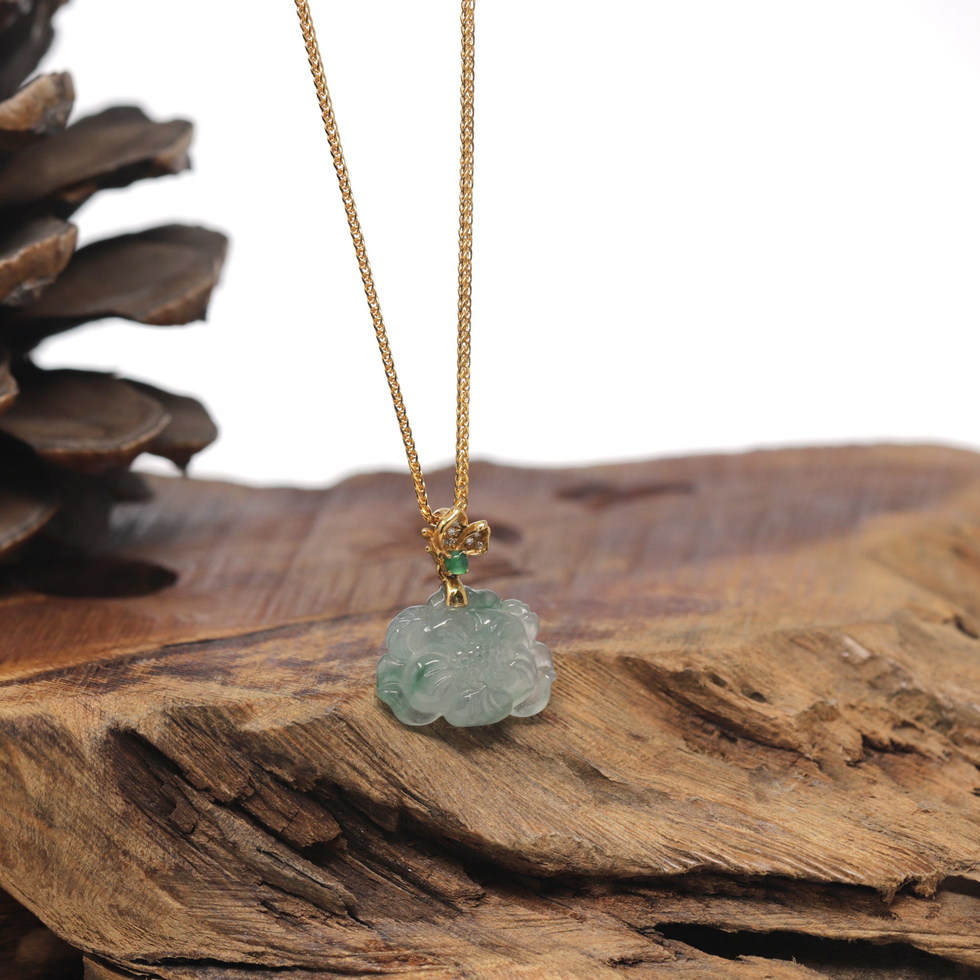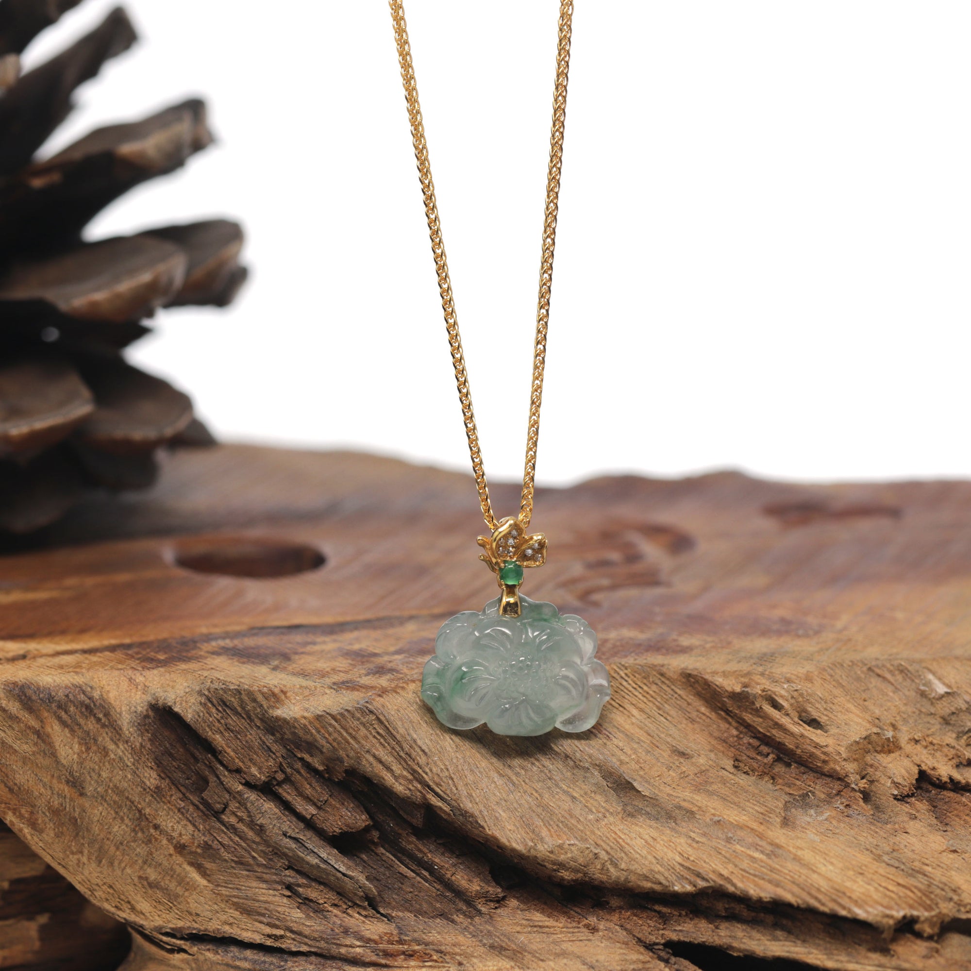Baikalla Icy Green Lotus Jadeite Jade Pendant W/ 18K Yellow Gold Butterfly Bail & Diamonds