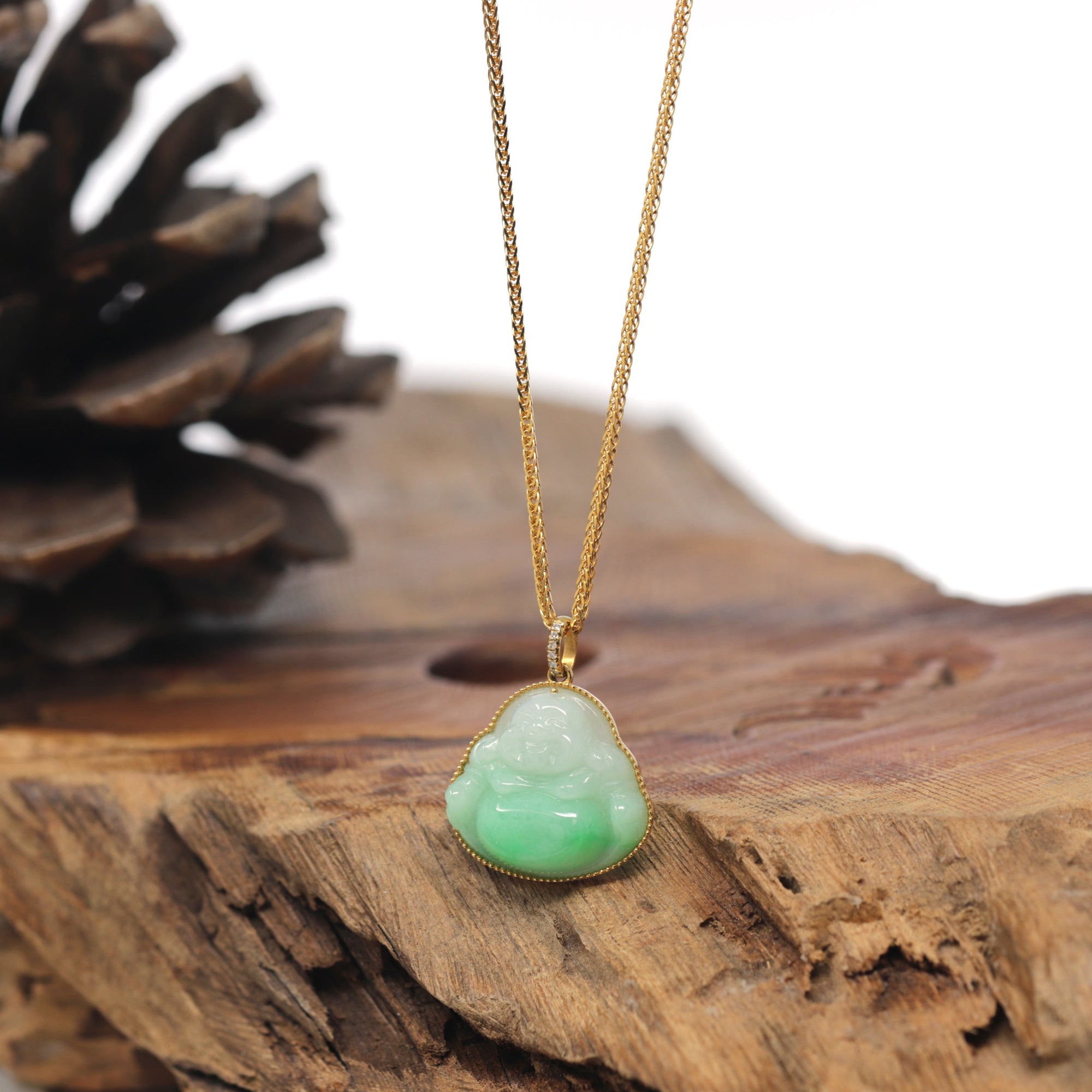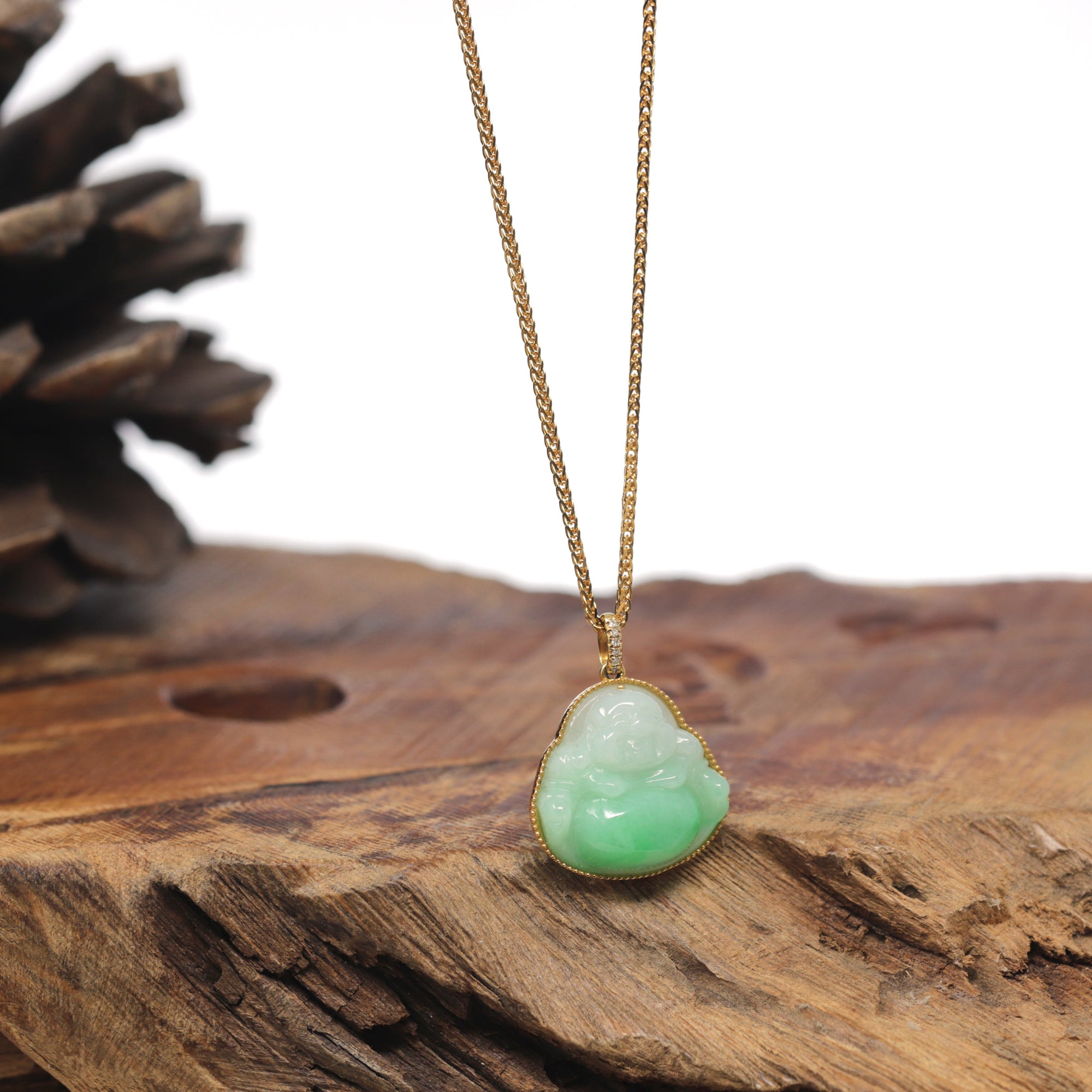 Baikalla Apple-Green & White "Happy Buddha" Jadeite Jade Pendant W/ 18K Yellow Gold Bail & Diamonds