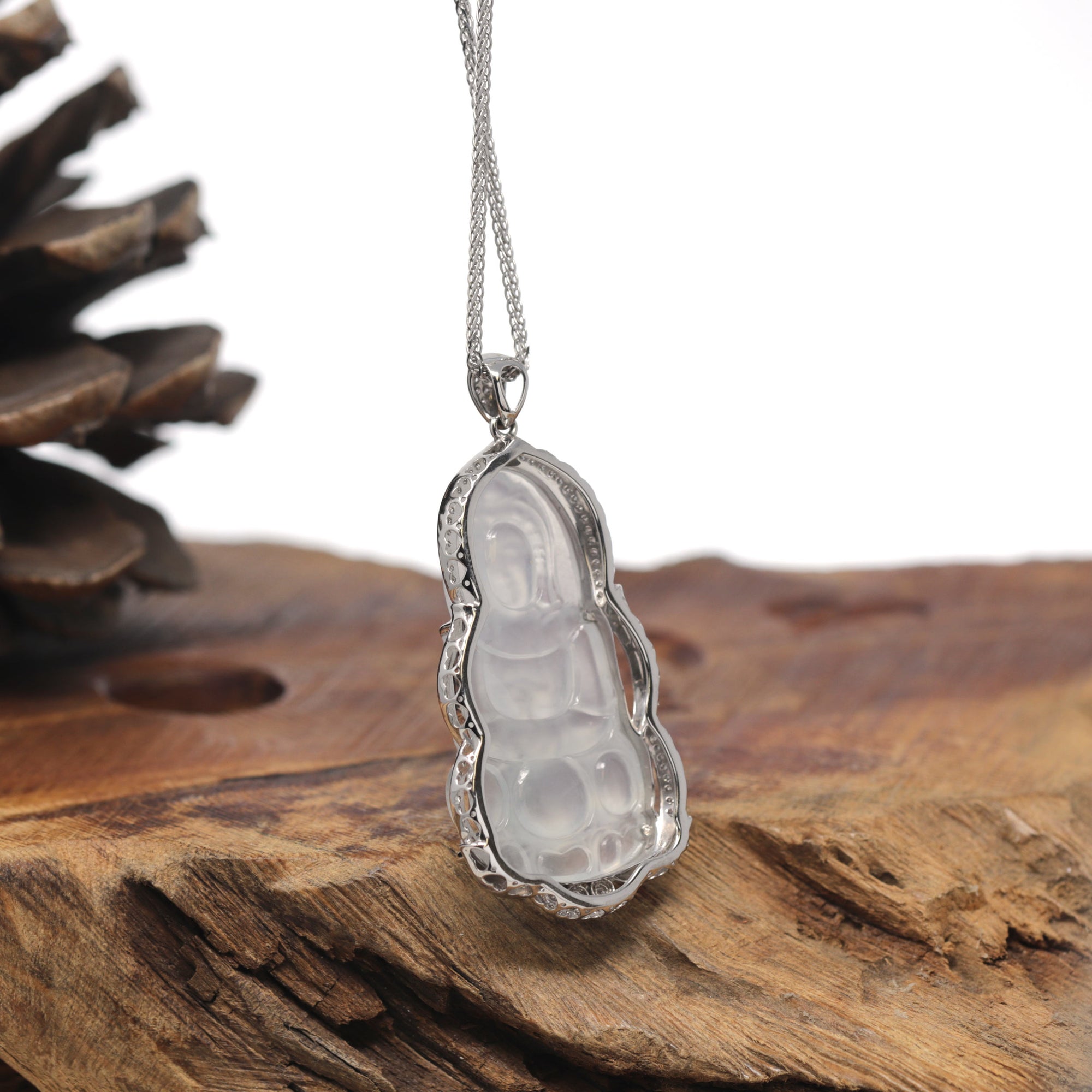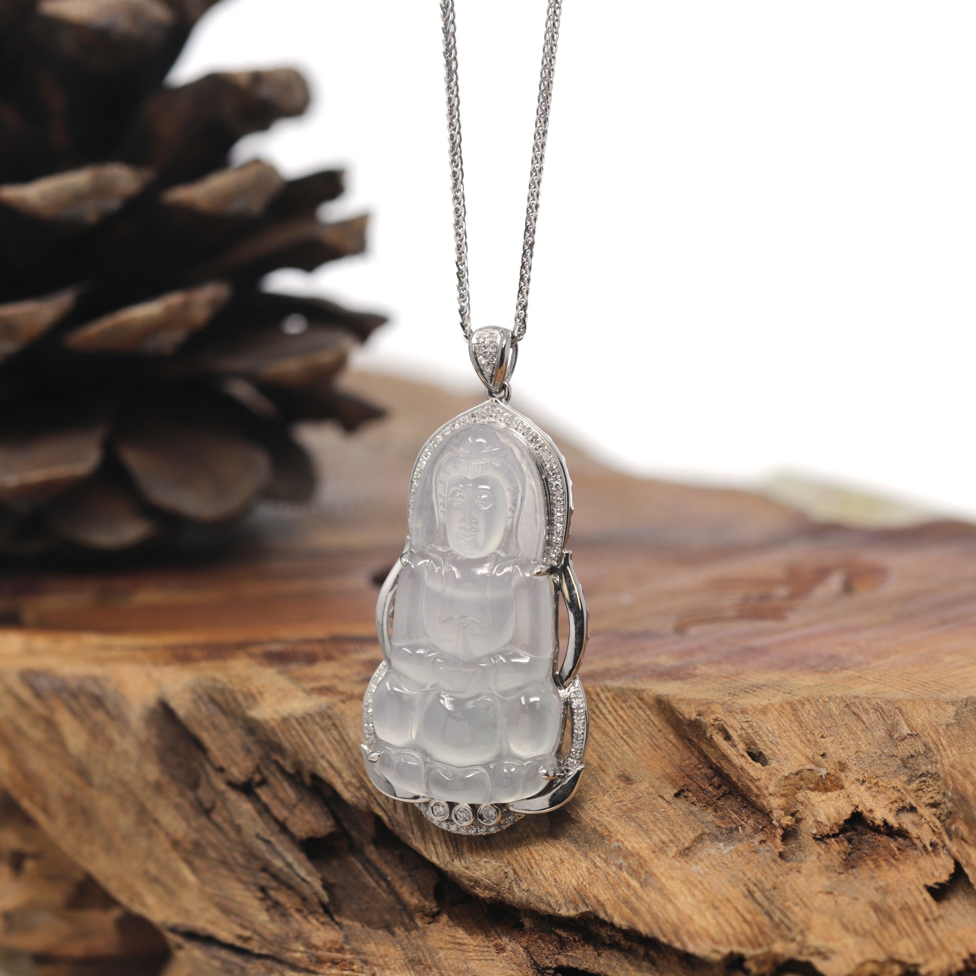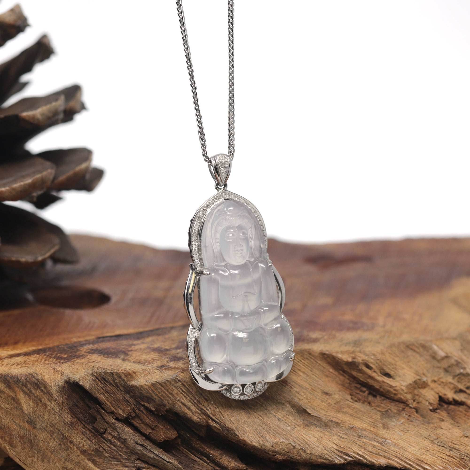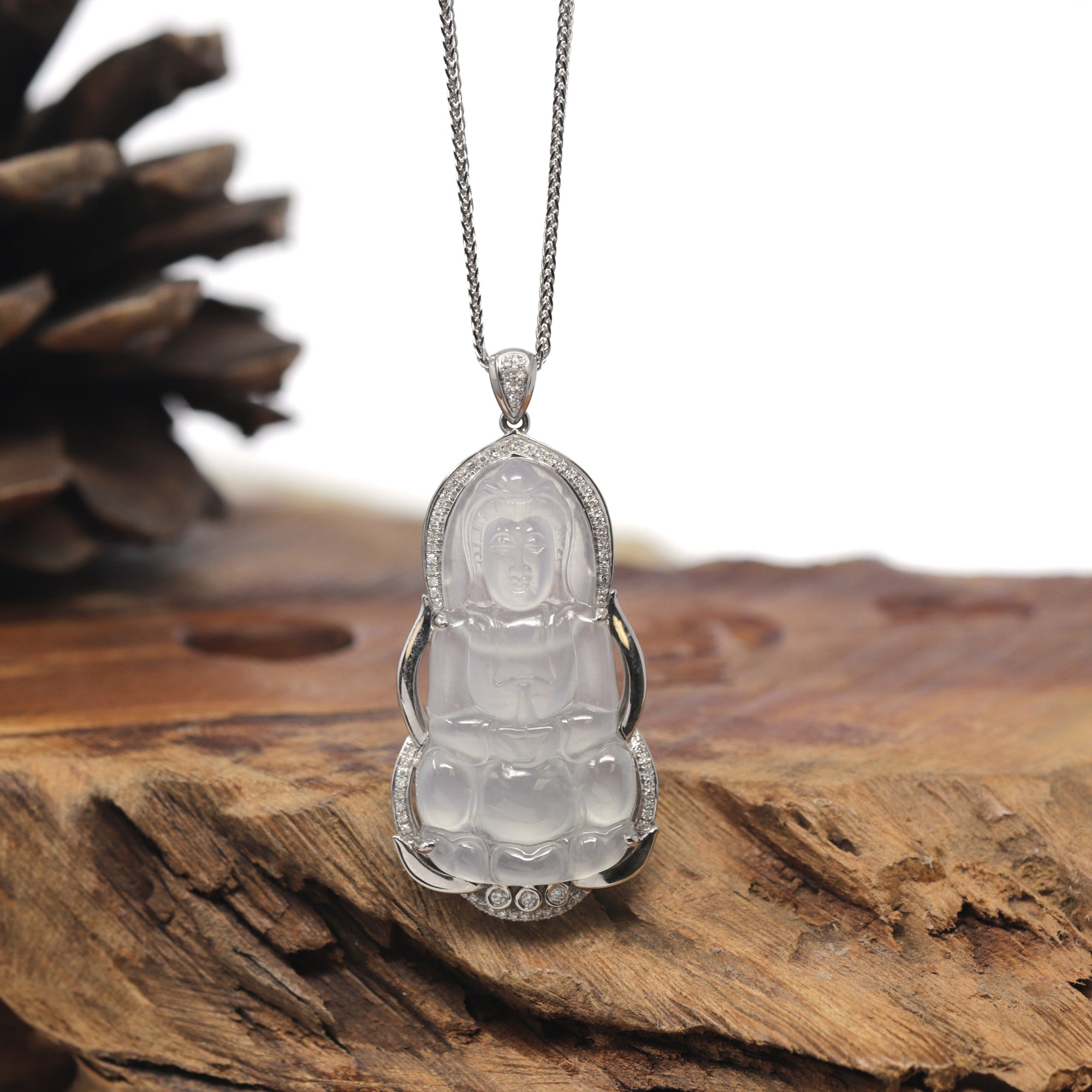 Baikalla Icy White Guan Yin "Goddess of Compassion" Jadeite Jade Pendant W/ 18K White Gold Bail & Diamonds