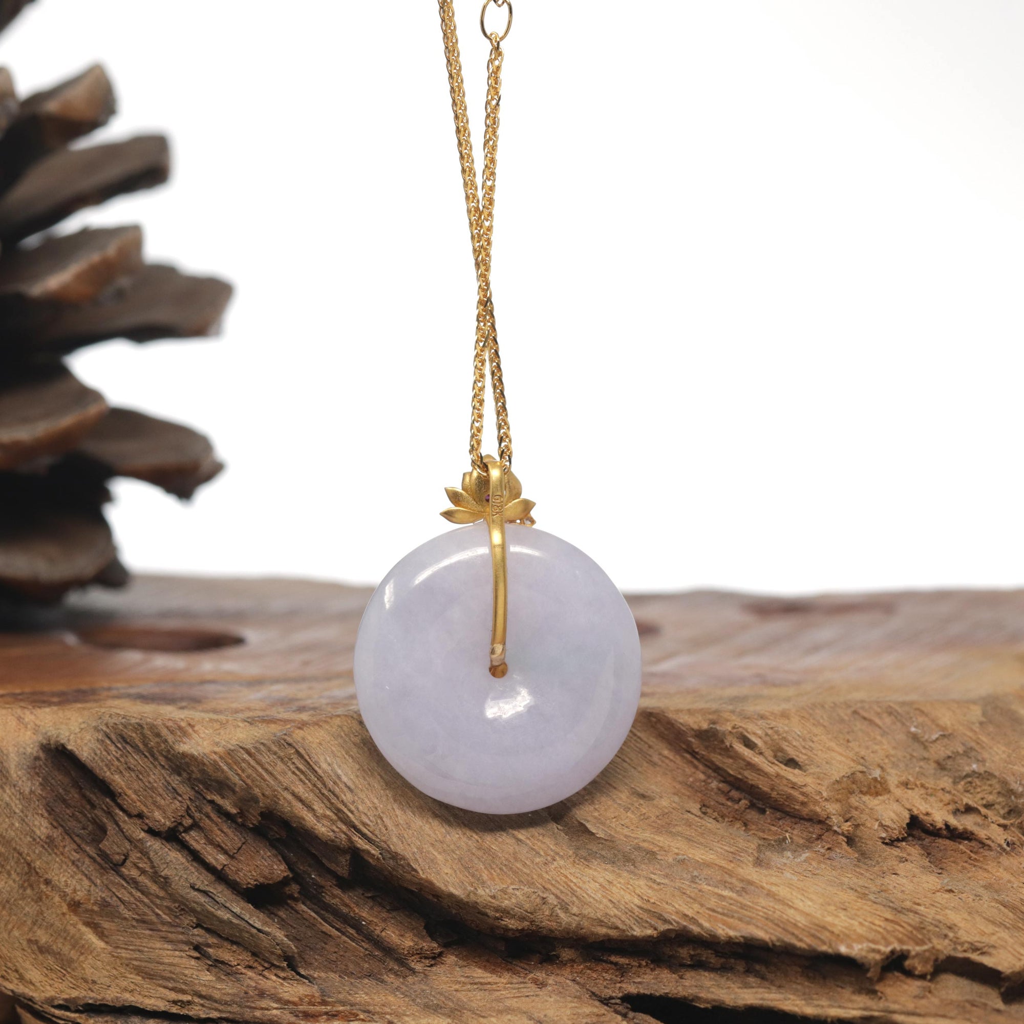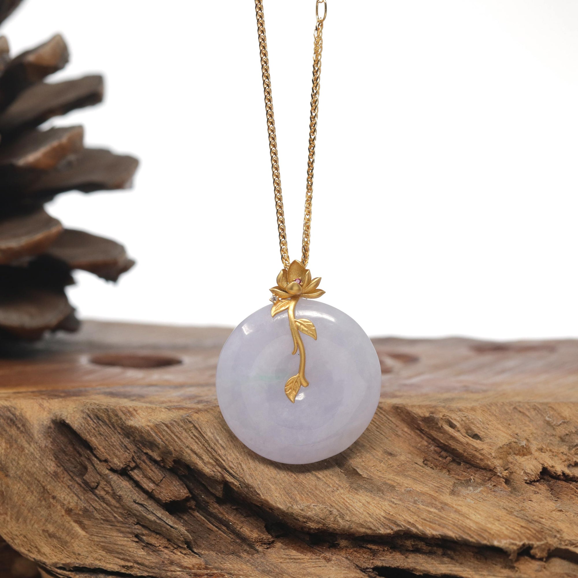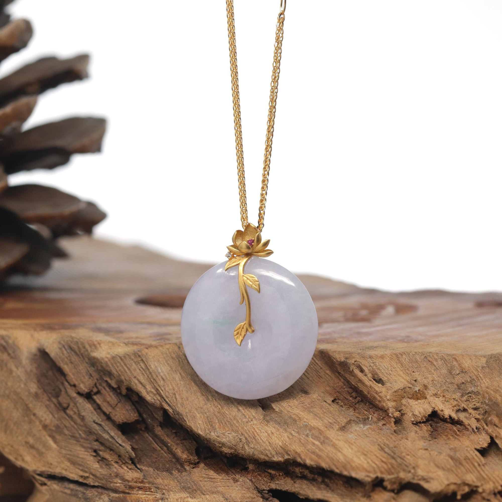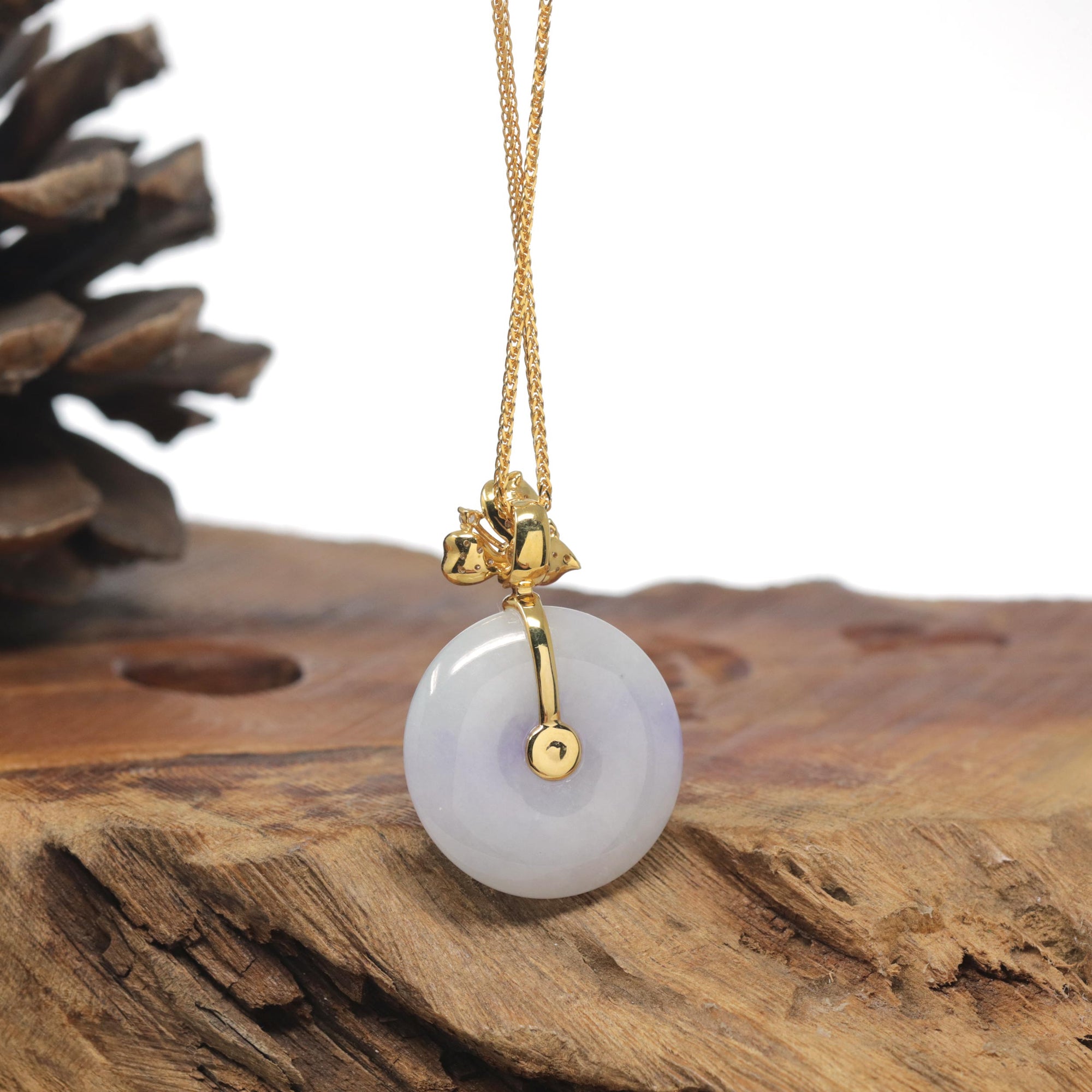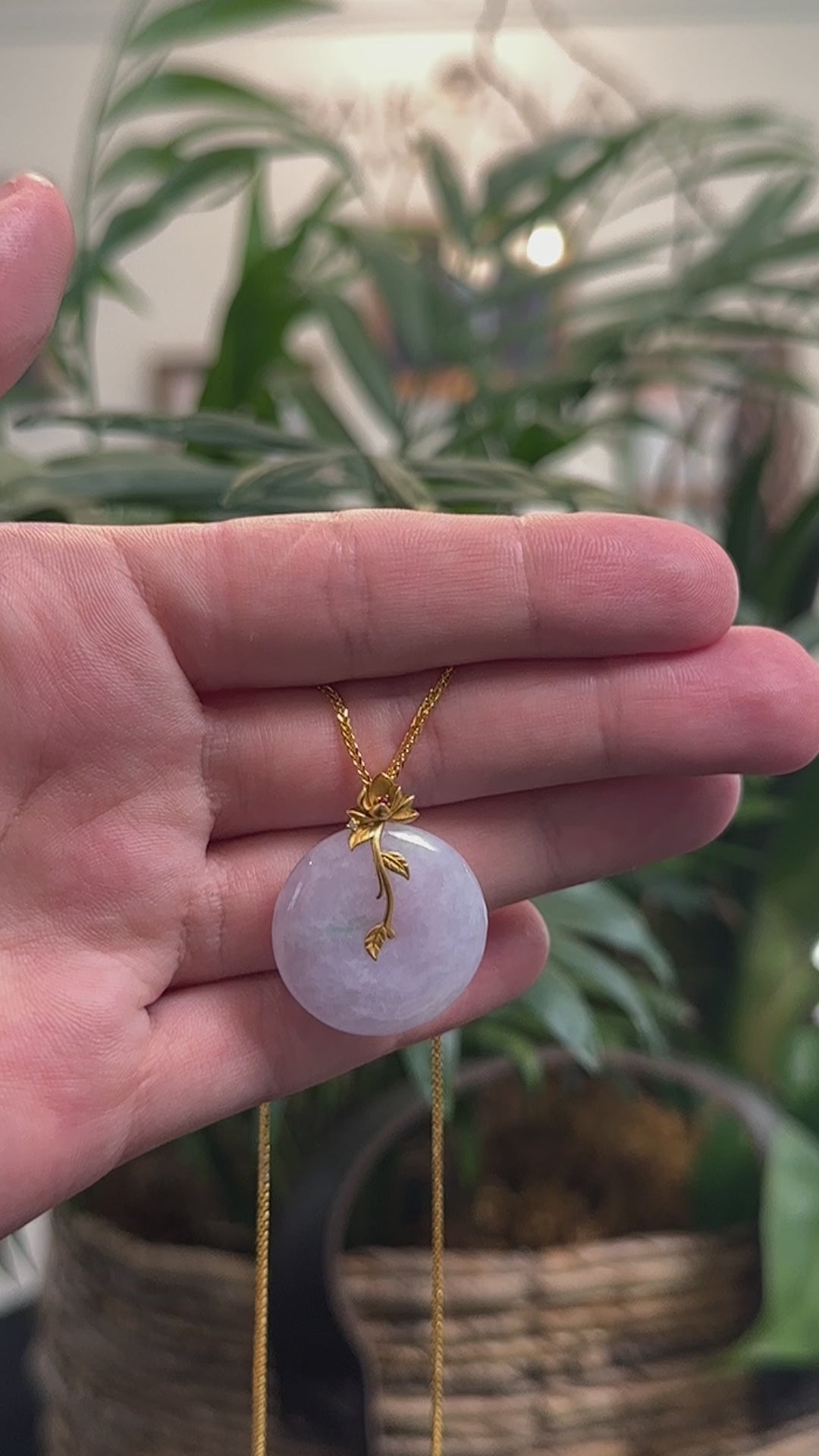 18K Yellow Gold "Good Luck Button" Necklace Lavender Green Jadeite Jade Pendant Necklace