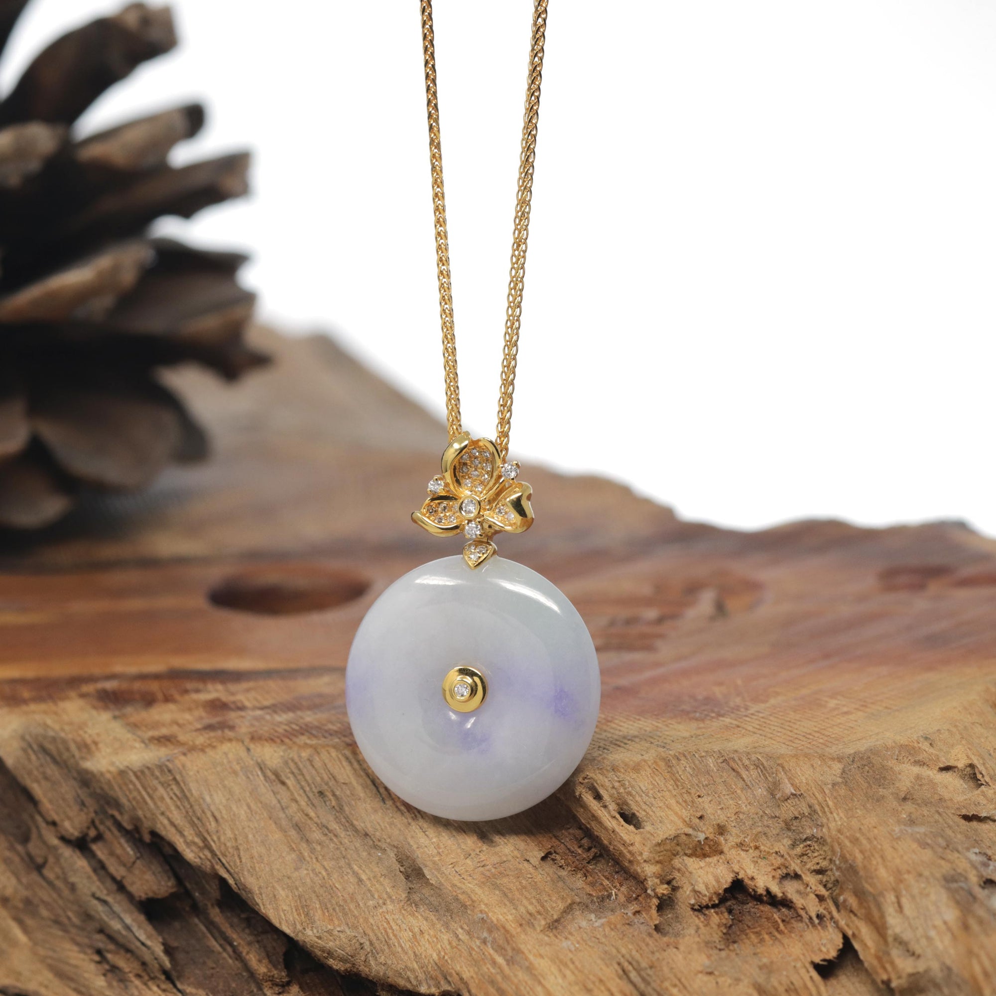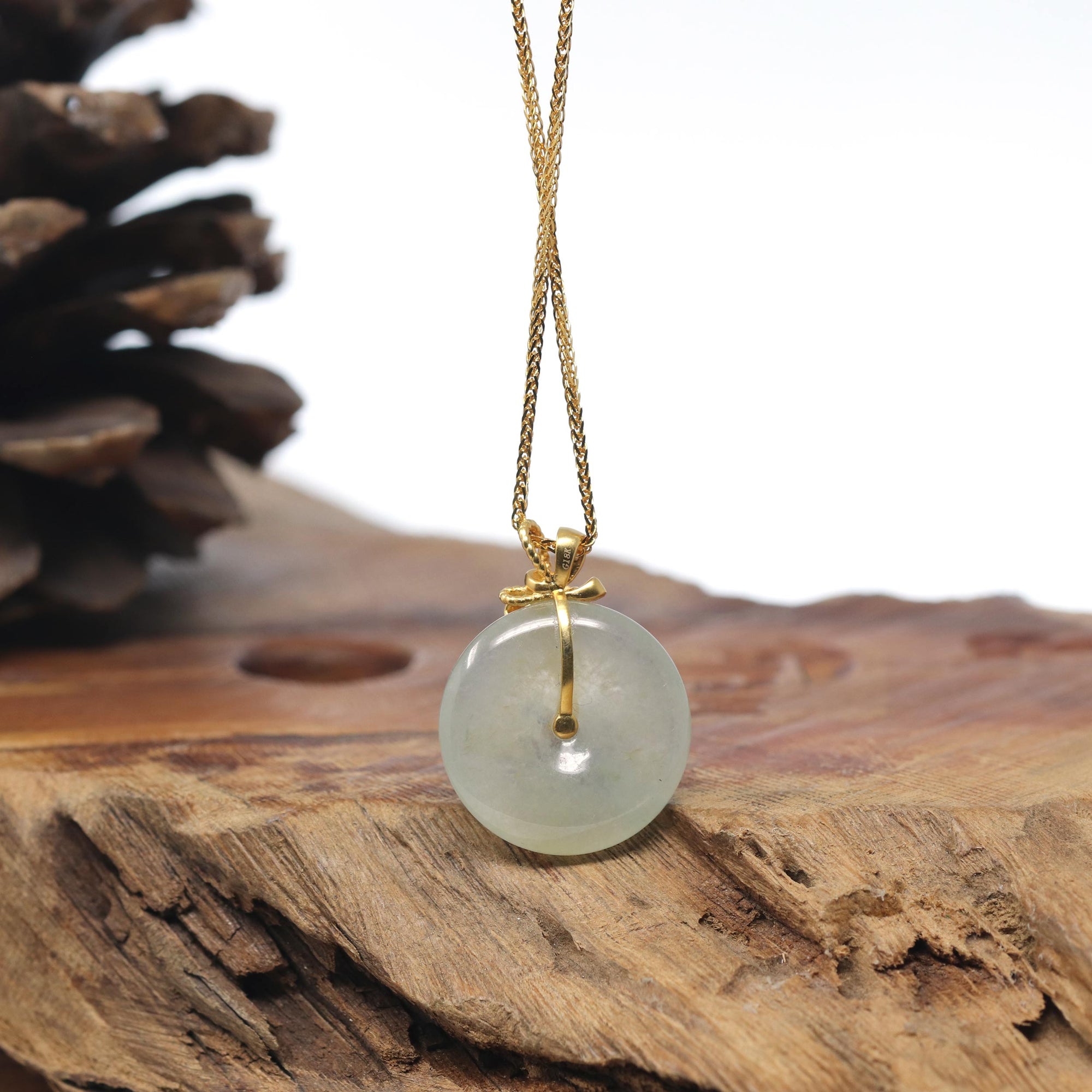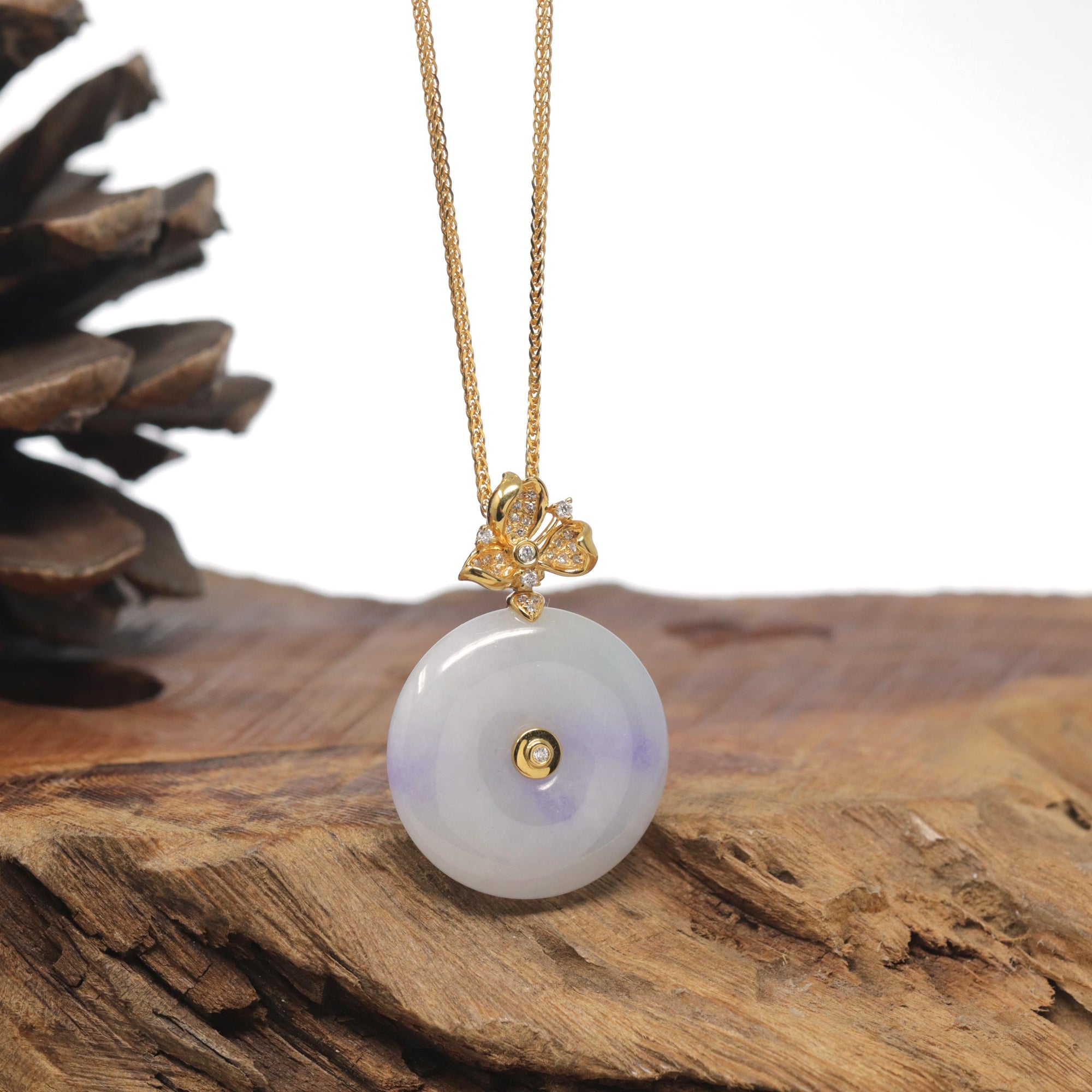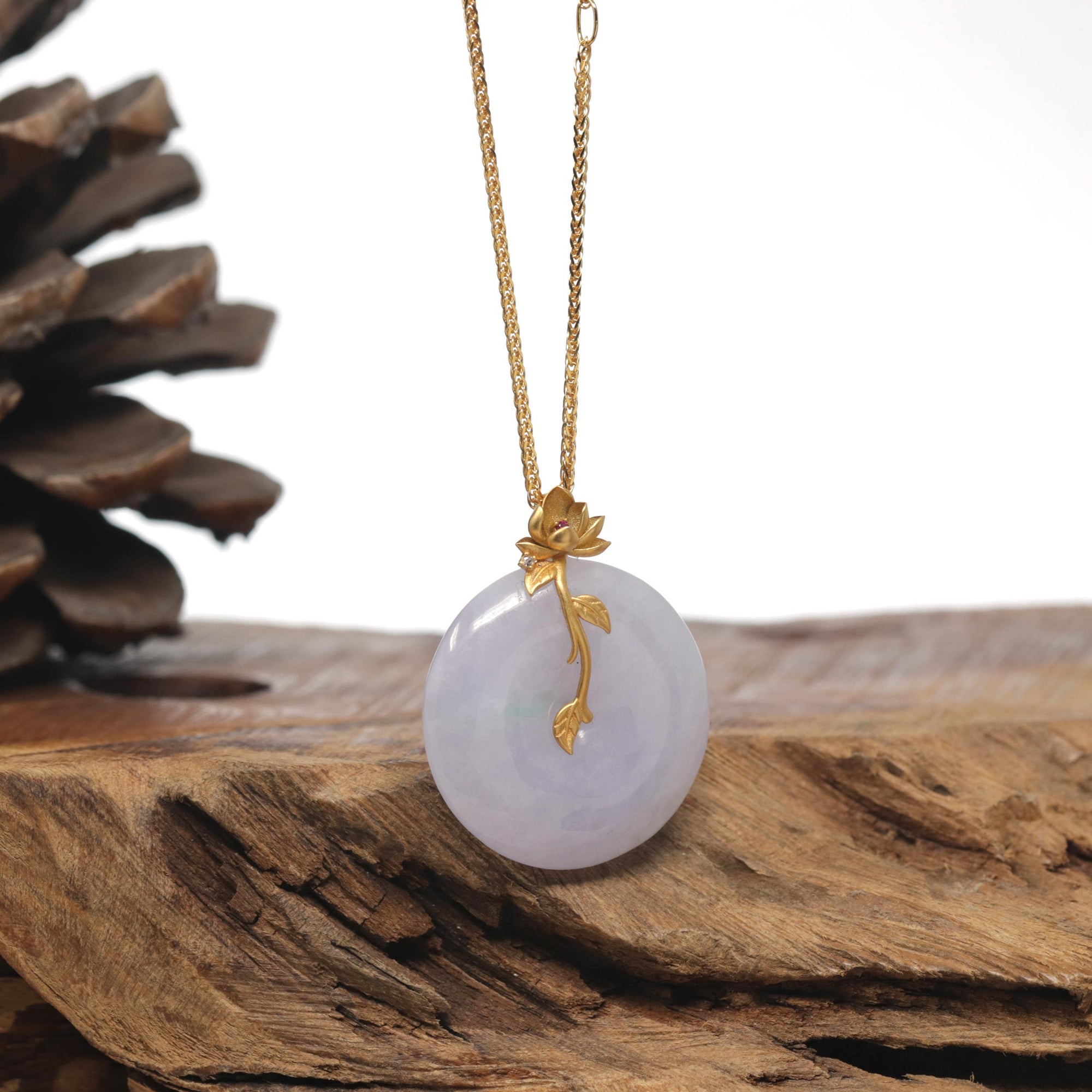 18K Yellow Gold "Good Luck Button" Necklace Lavender Green Jadeite Jade Pendant Necklace