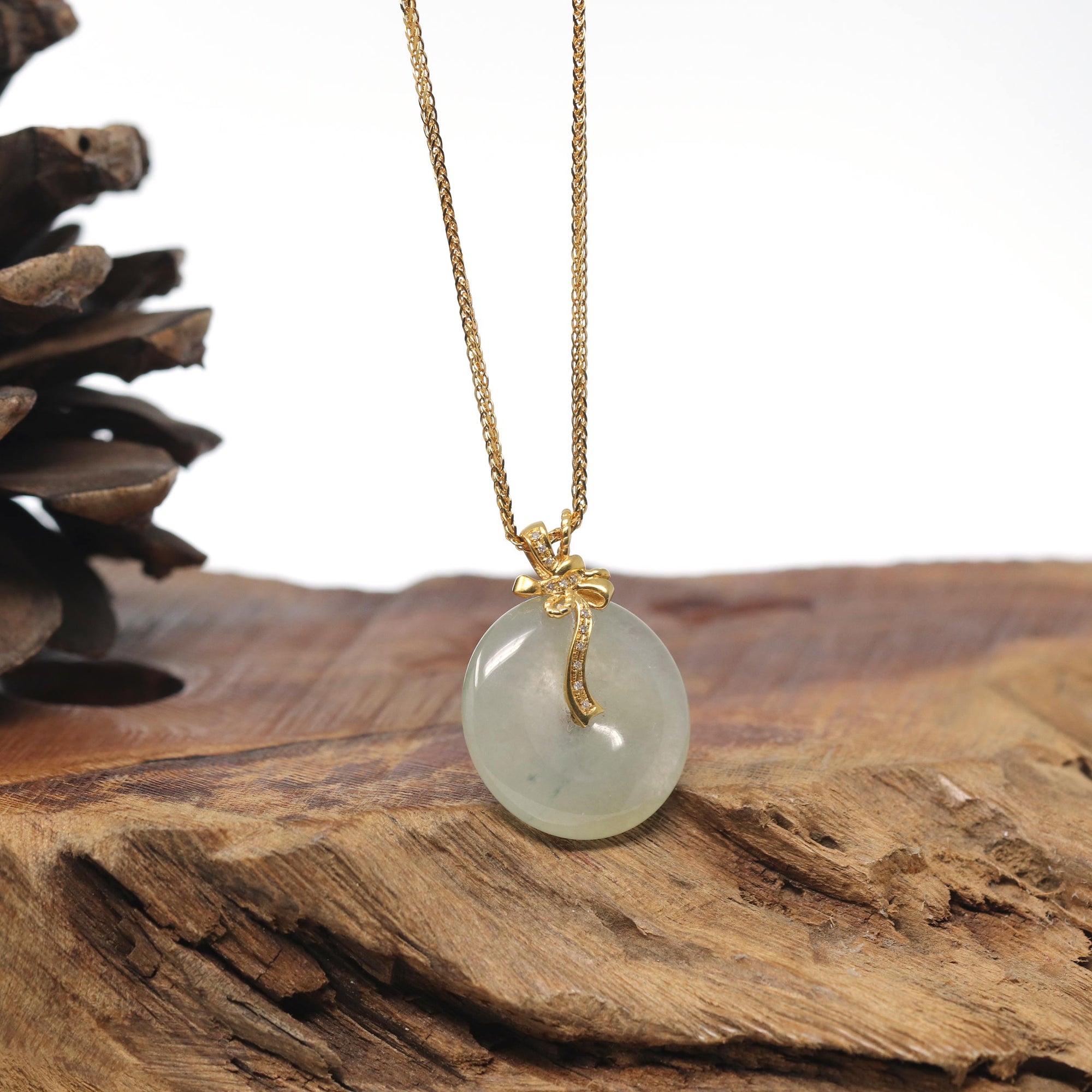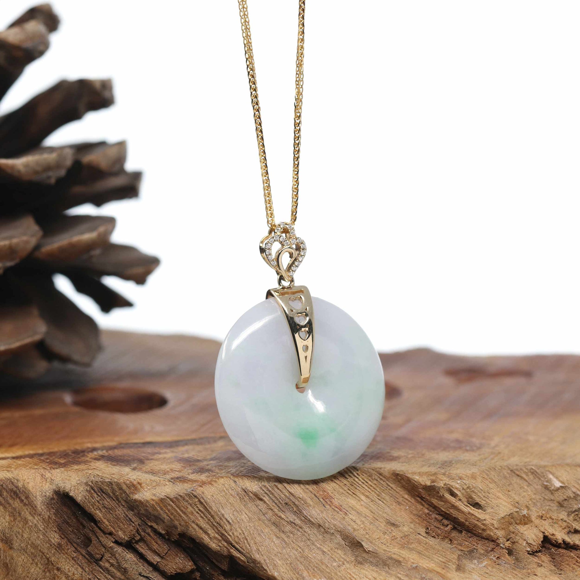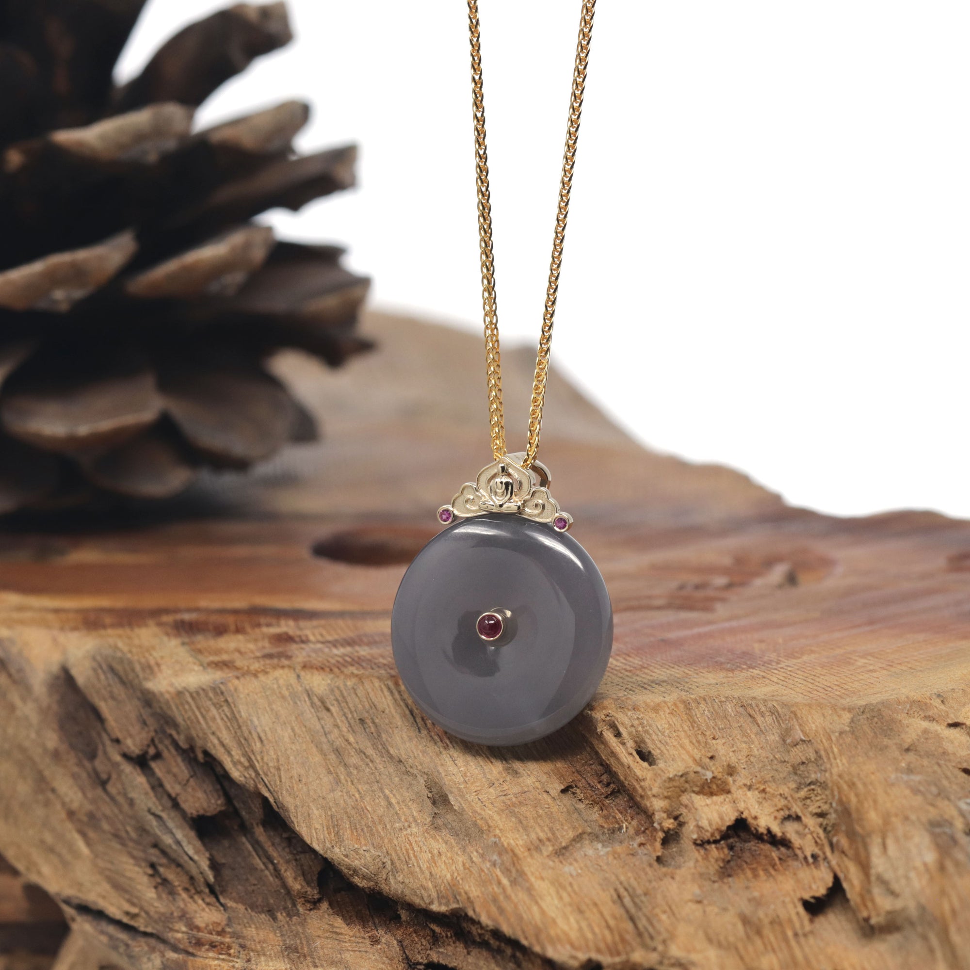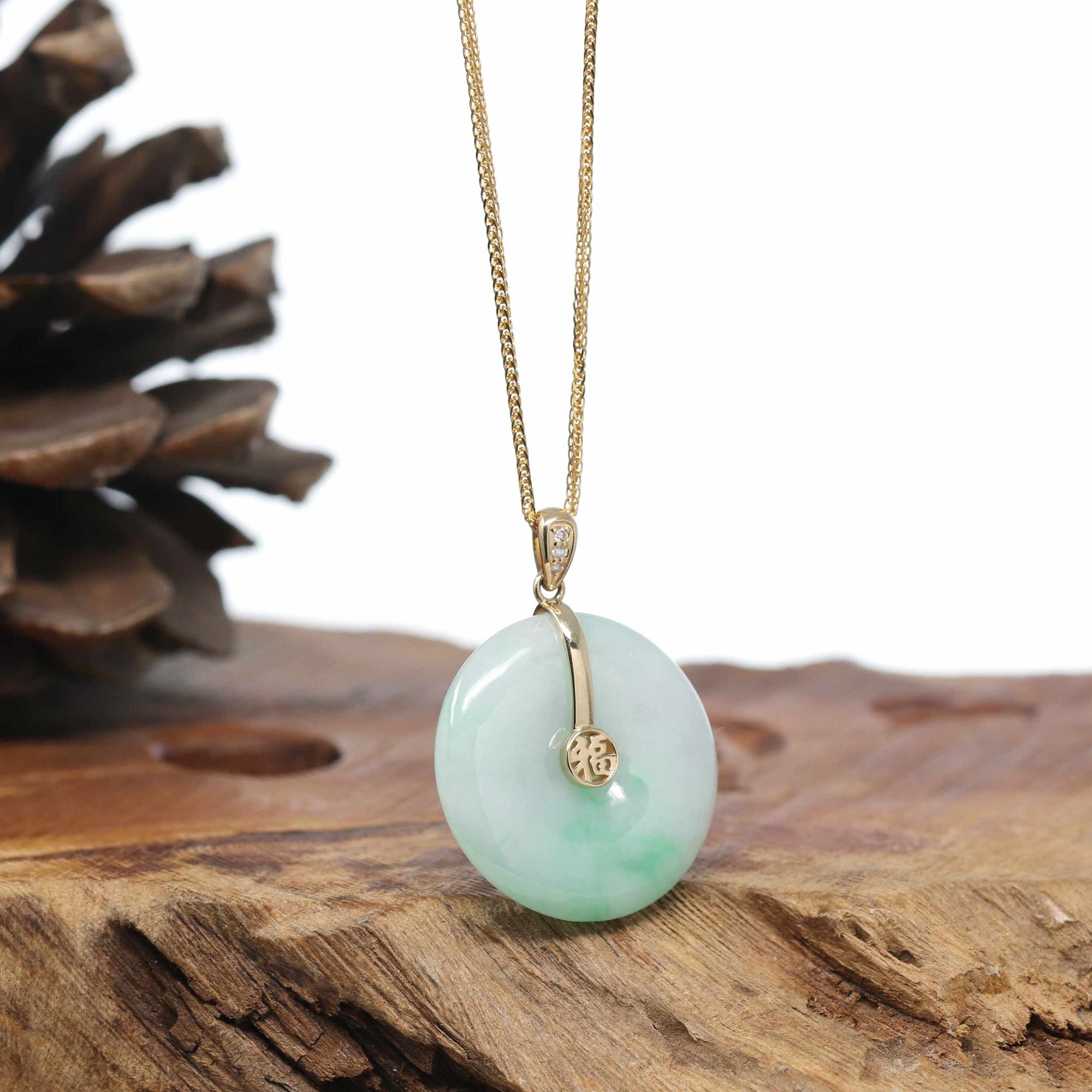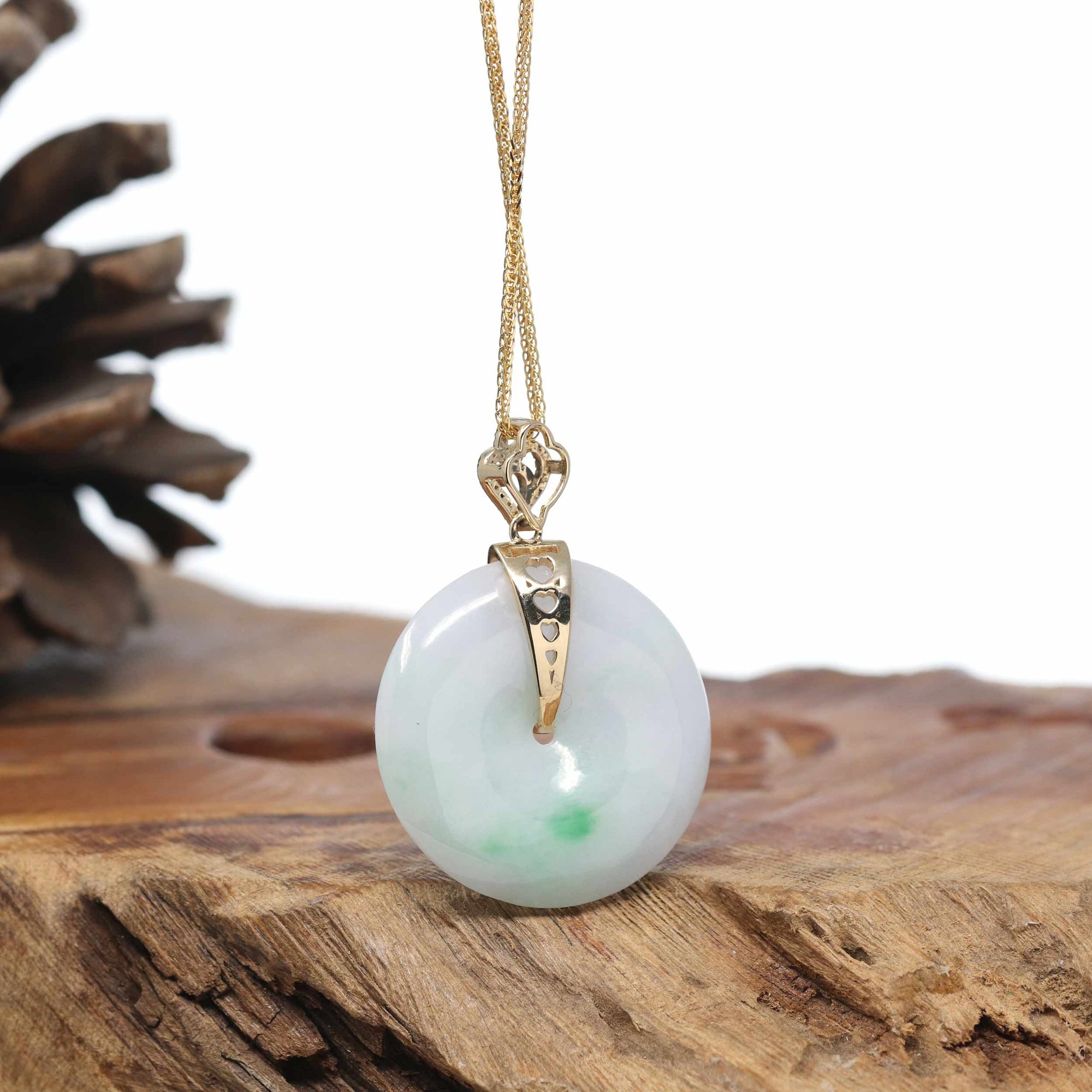 18K Yellow Gold "Good Luck Button" Necklace Lavender Green Jadeite Jade Pendant Necklace