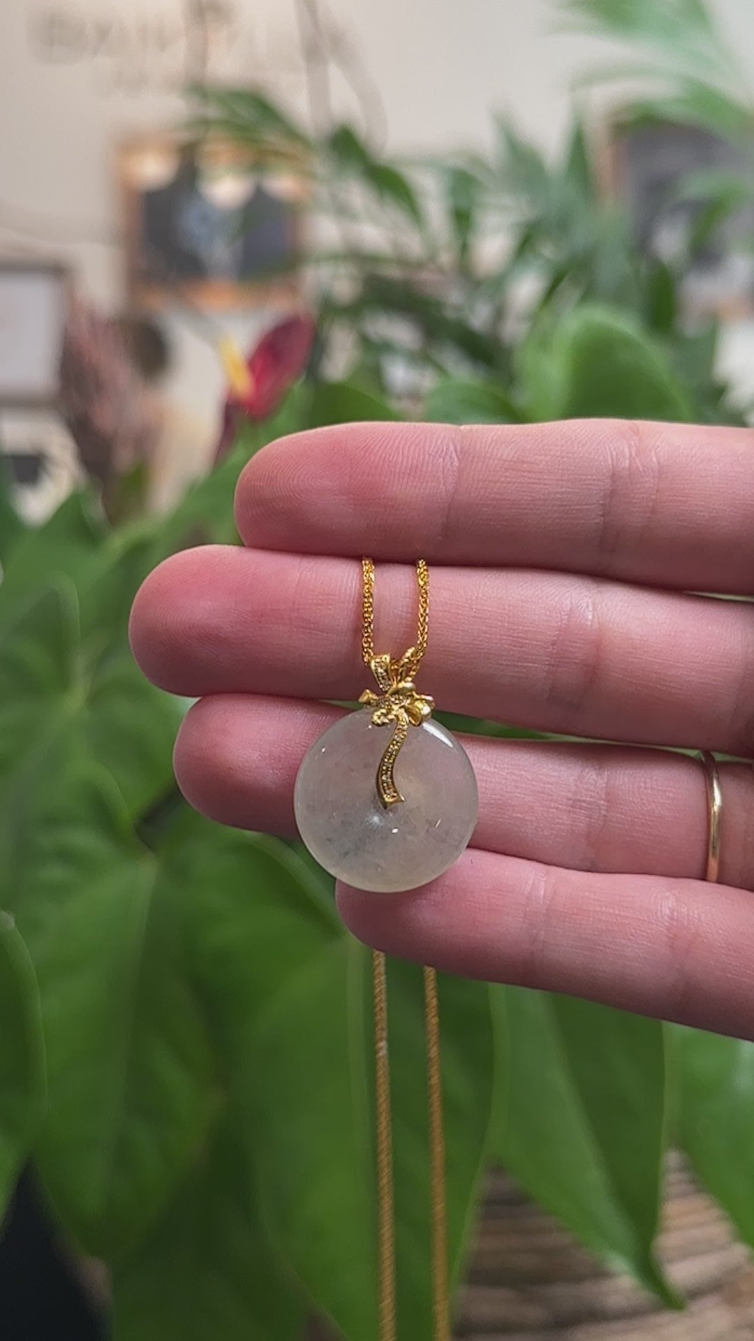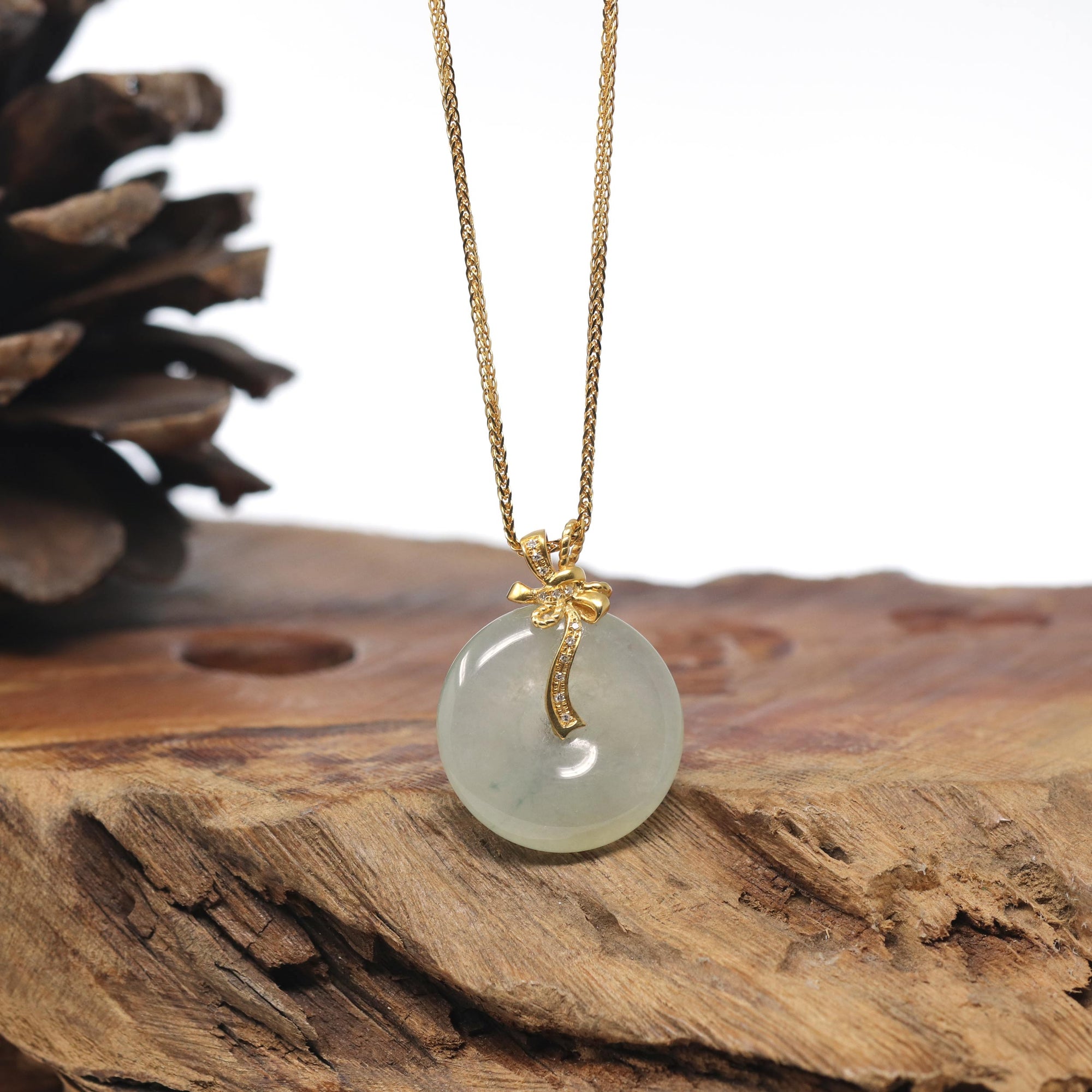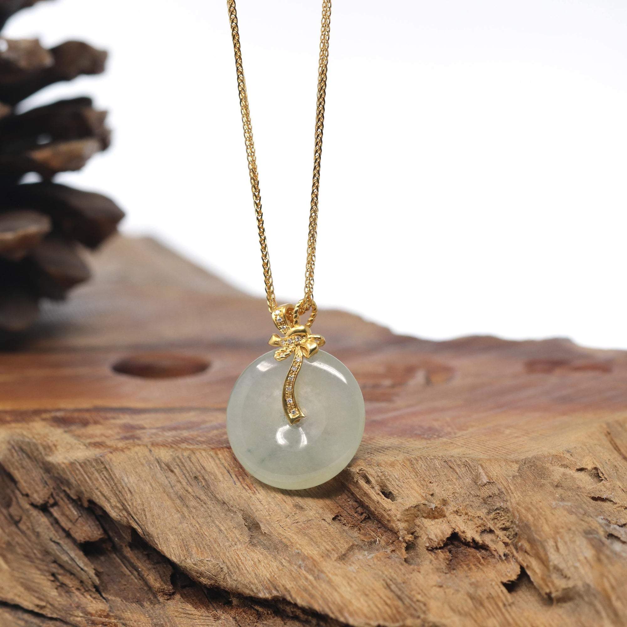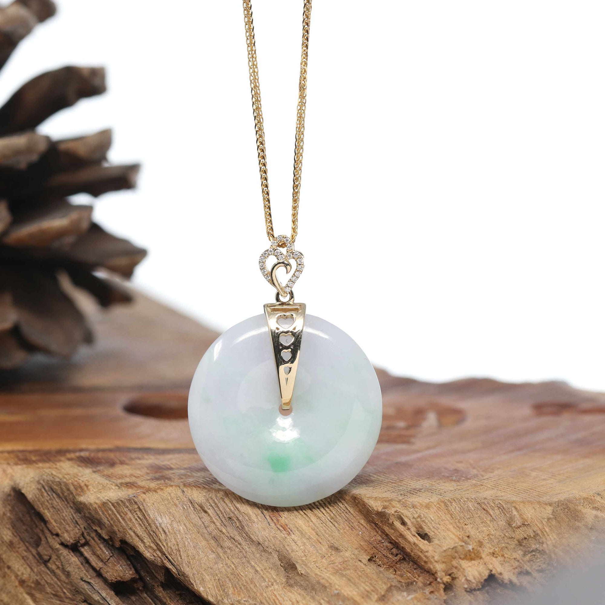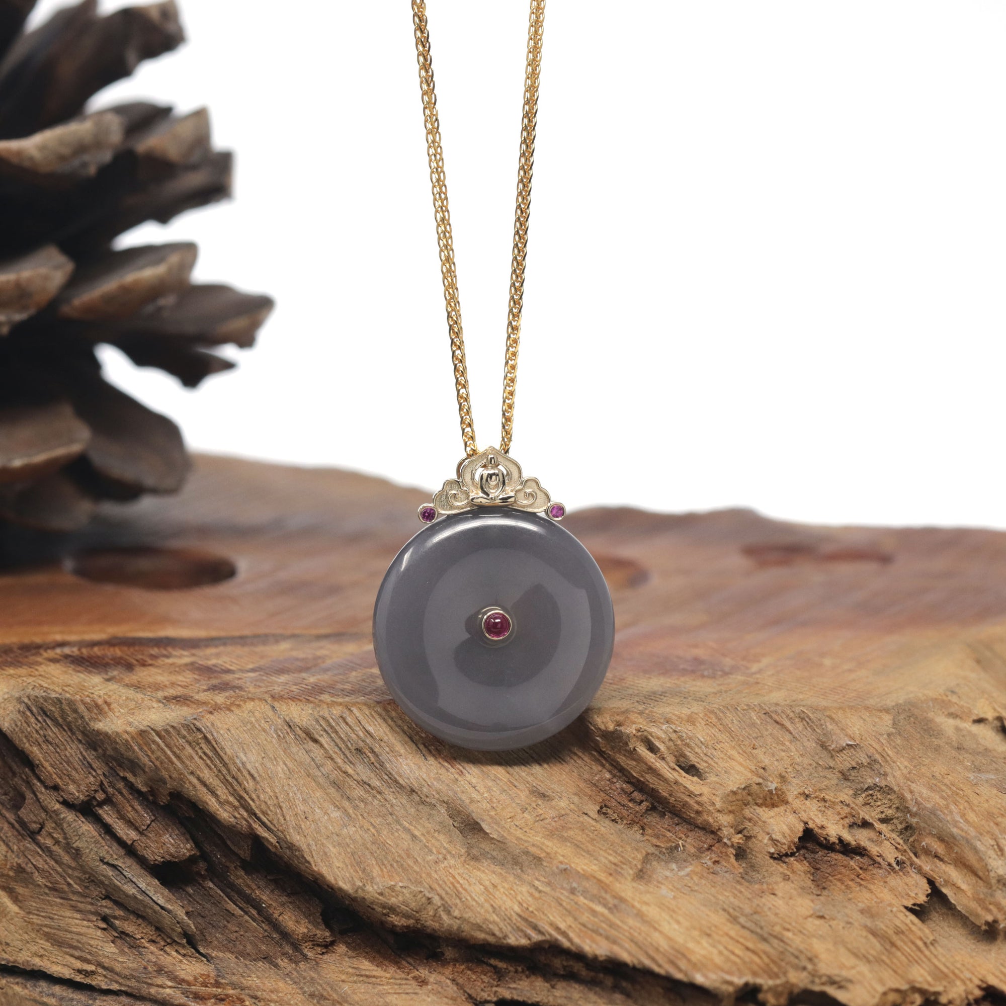 18K Yellow Gold "Good Luck Button" Necklace Lavender Green Jadeite Jade Pendant Necklace
