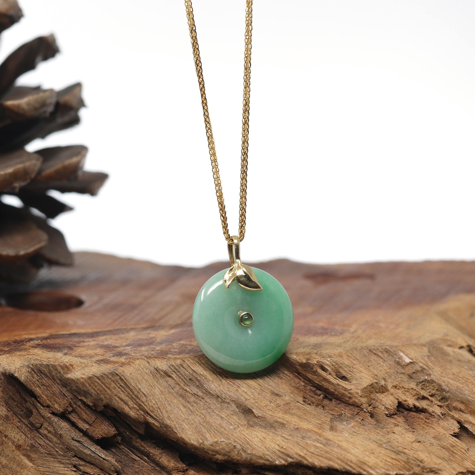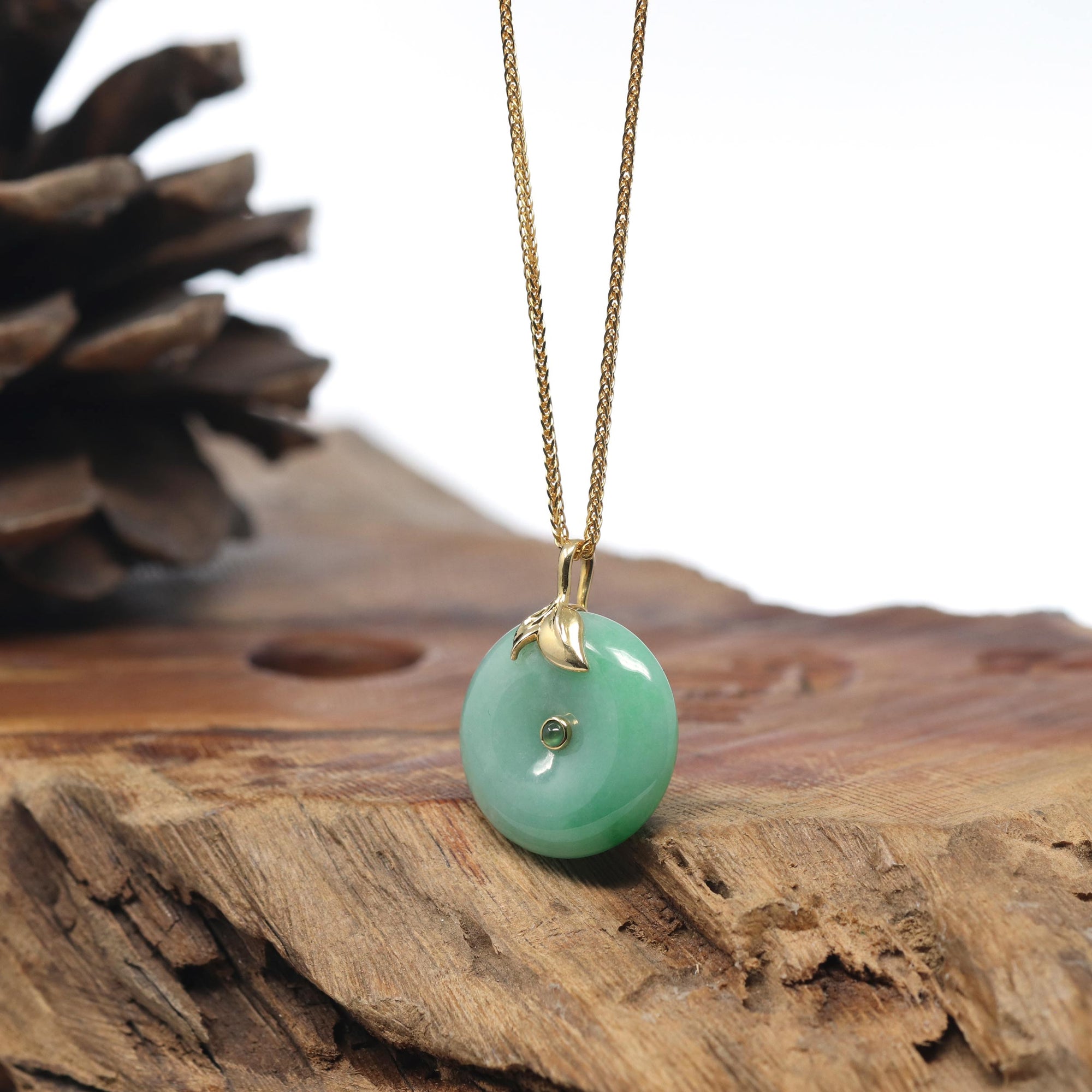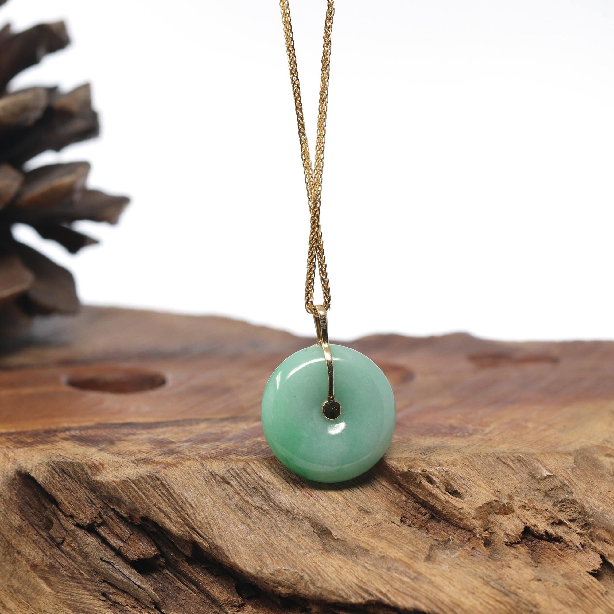 14K Yellow Gold "Good Luck Button" Necklace Ice Green Jadeite Jade Pendant Necklace