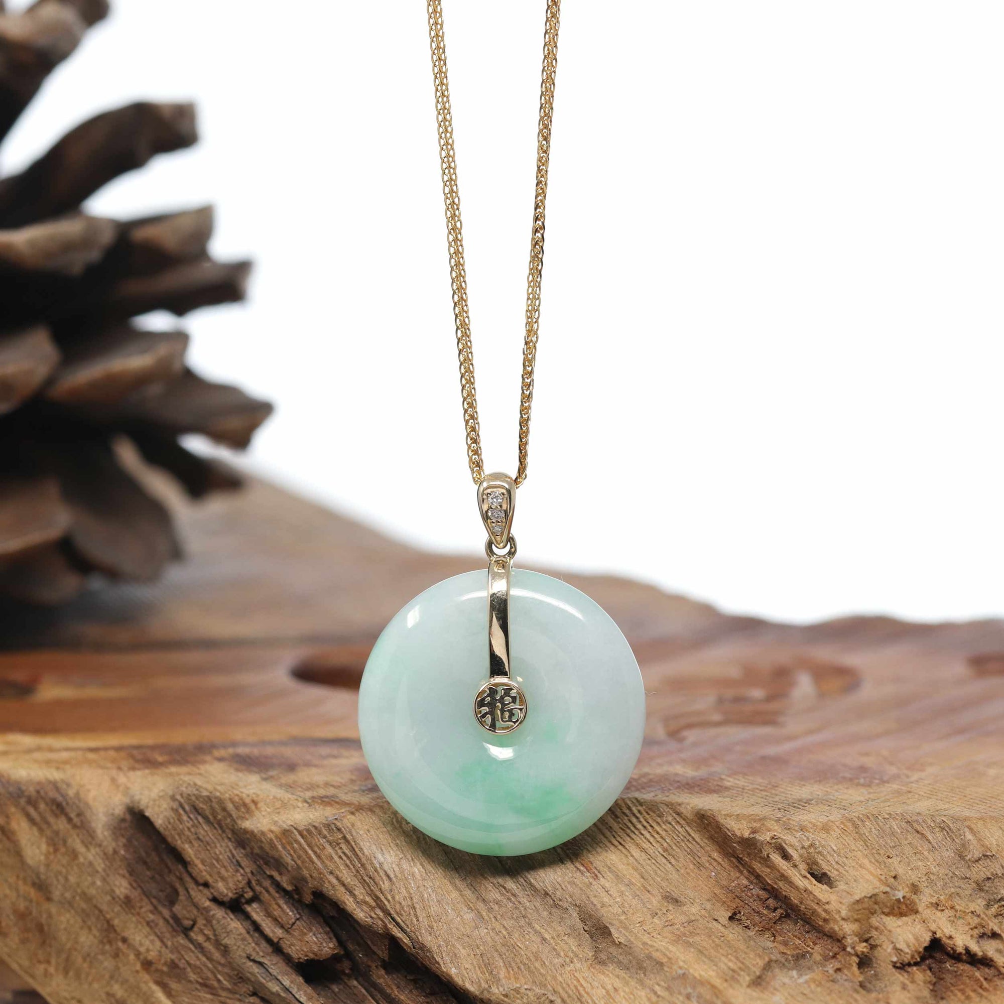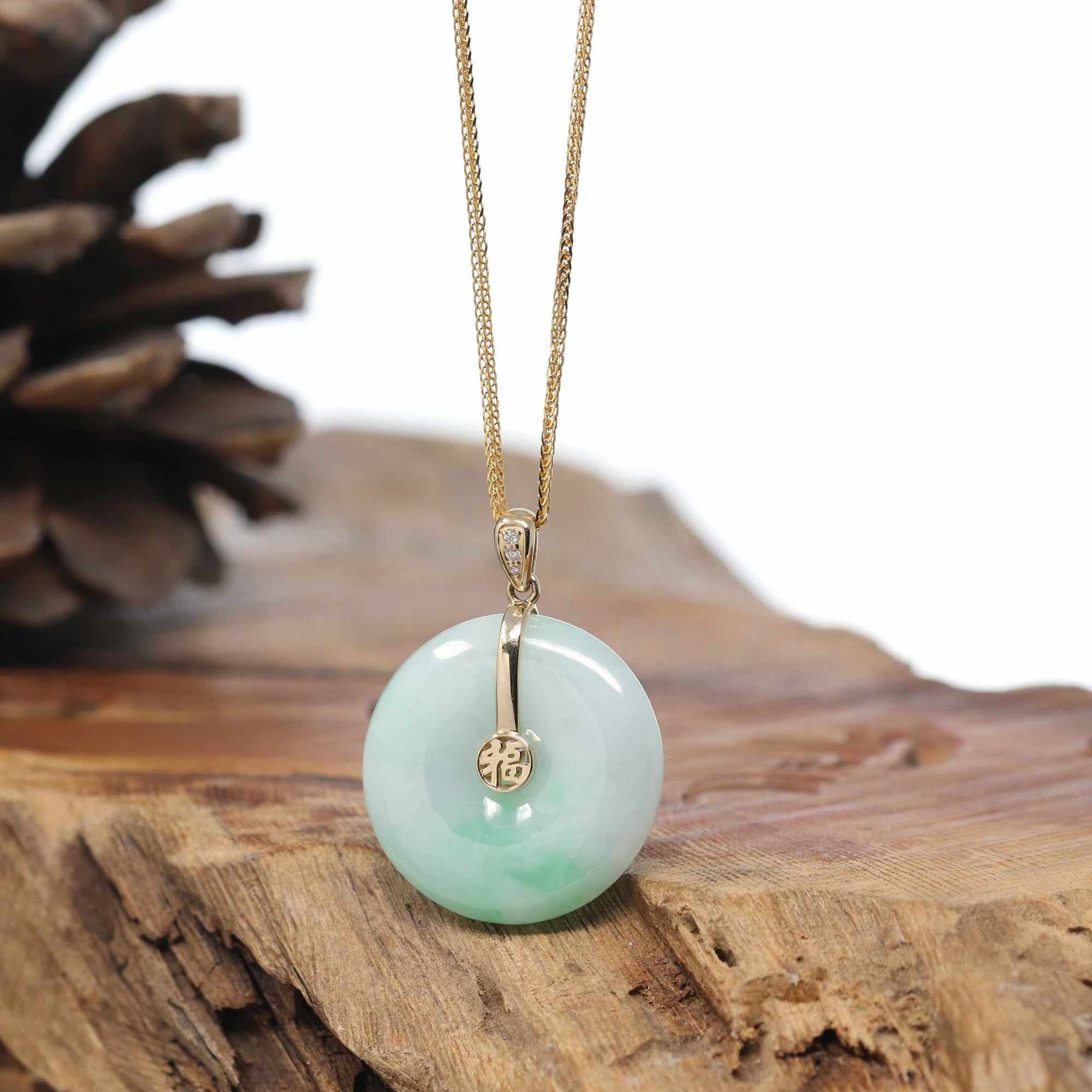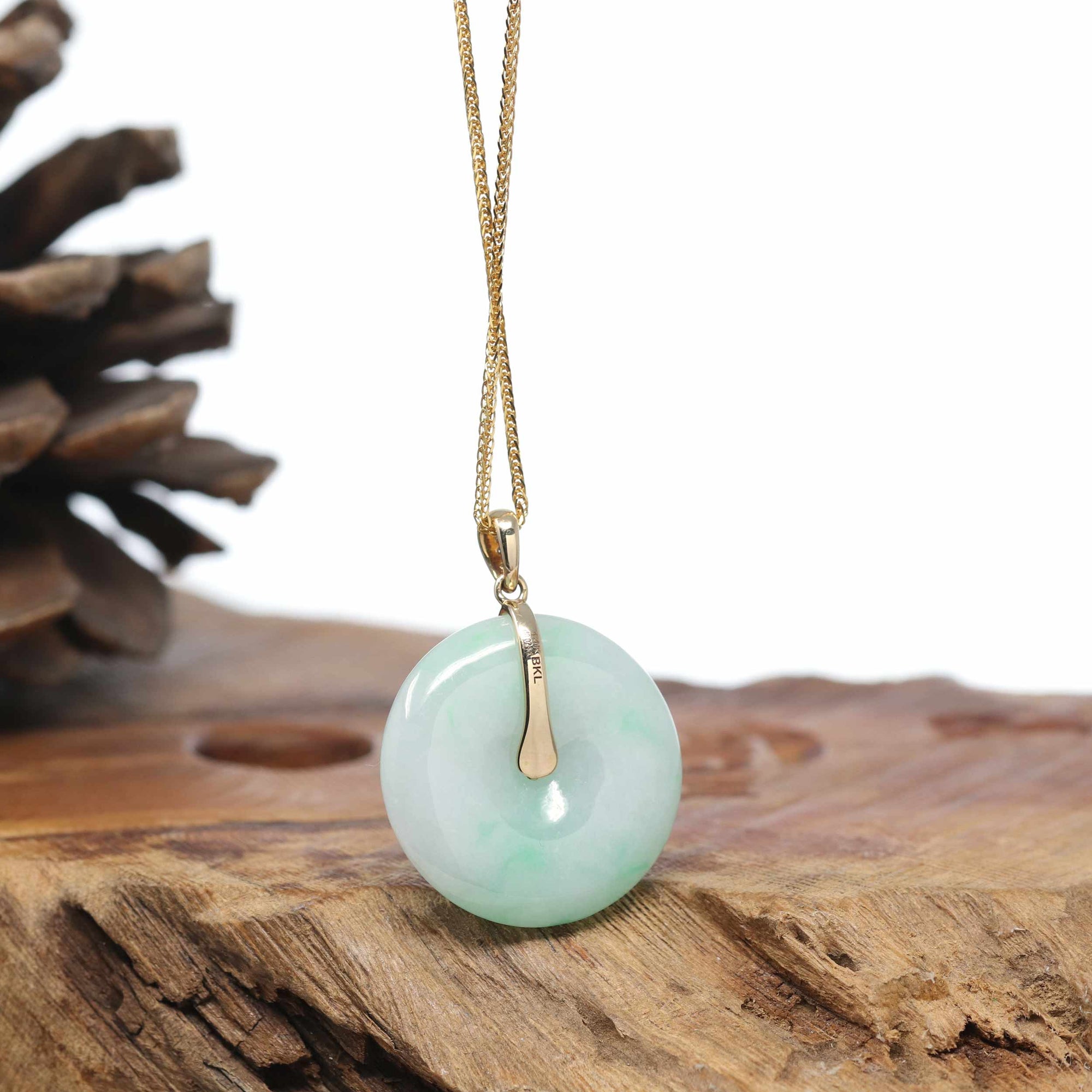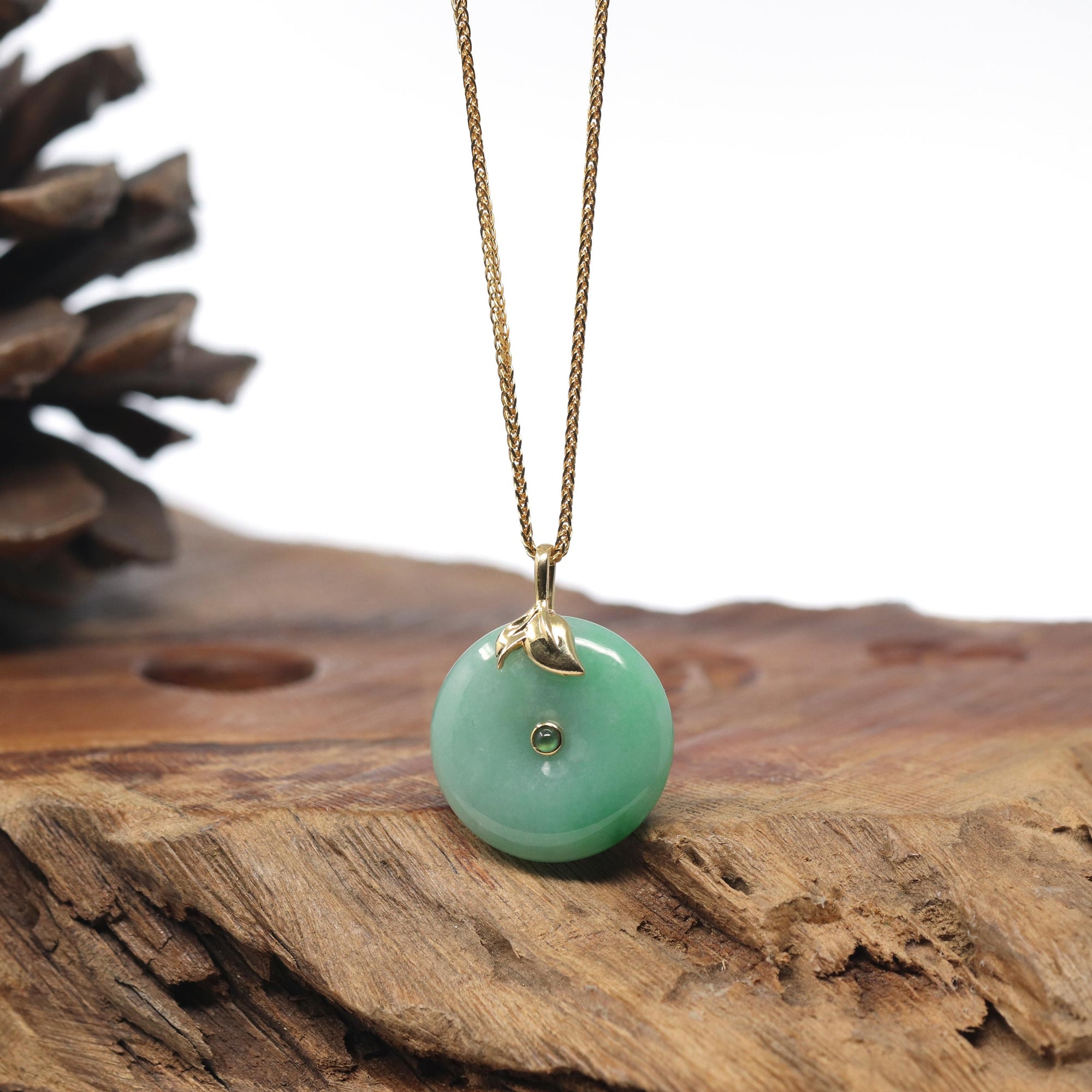 14K Yellow Gold "Good Luck Button" Necklace Ice Green Jadeite Jade Pendant Necklace