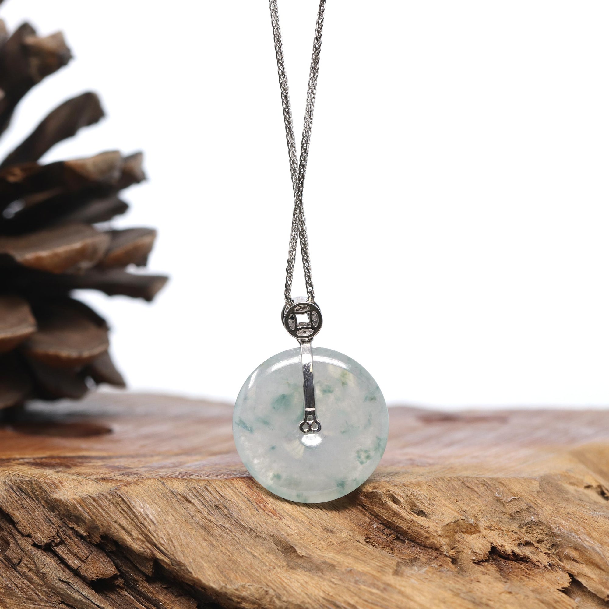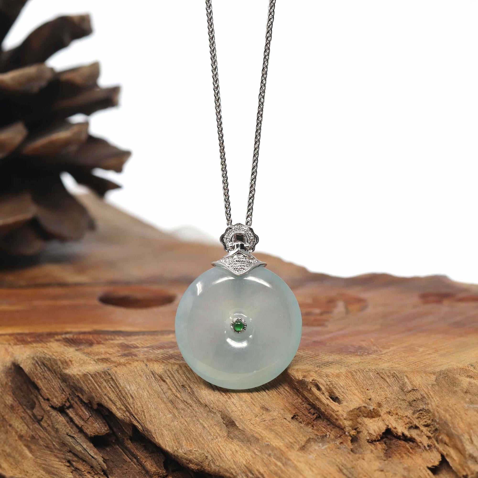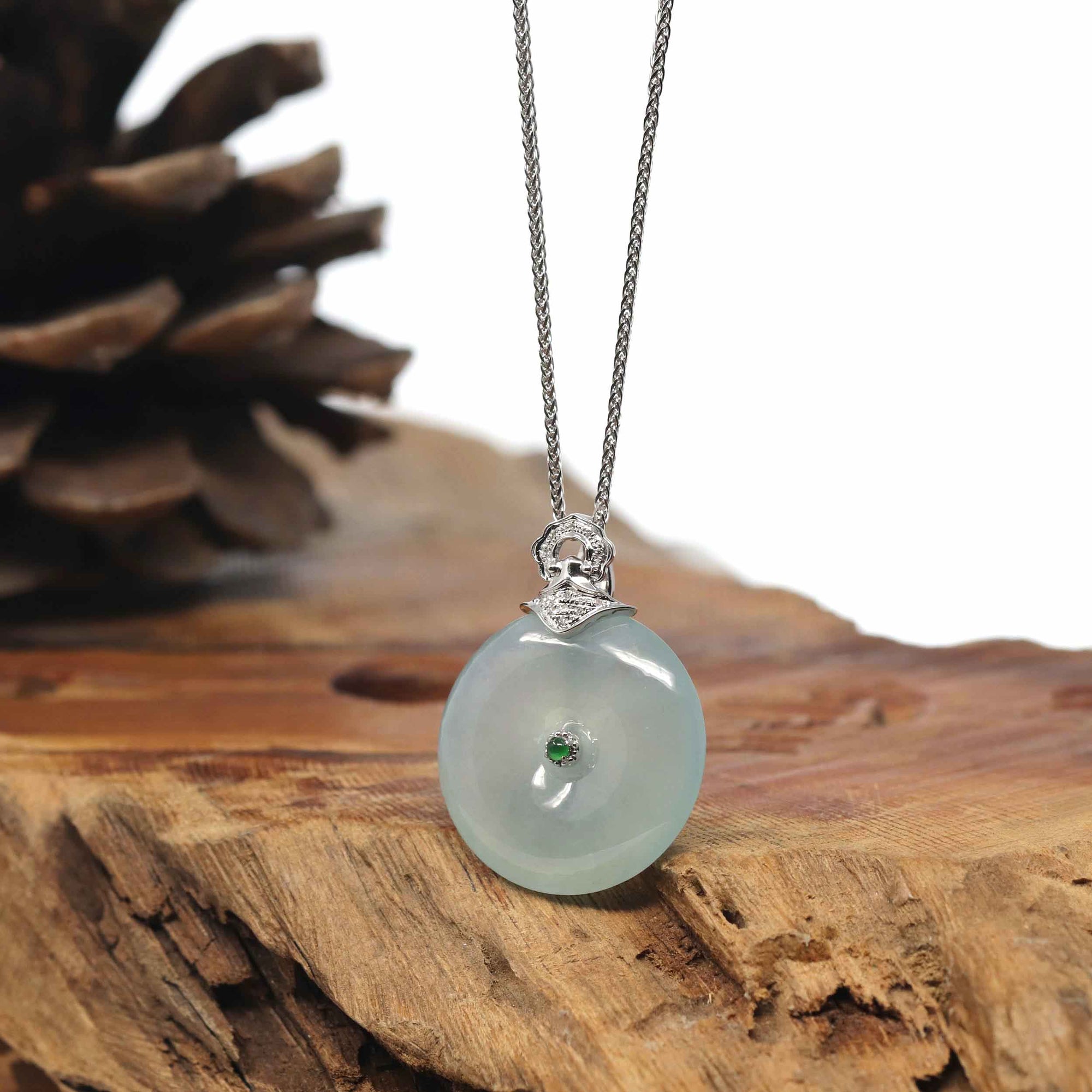 18K White Gold "Good Luck Button" Necklace Icy Green Jadeite Jade Pendant Necklace