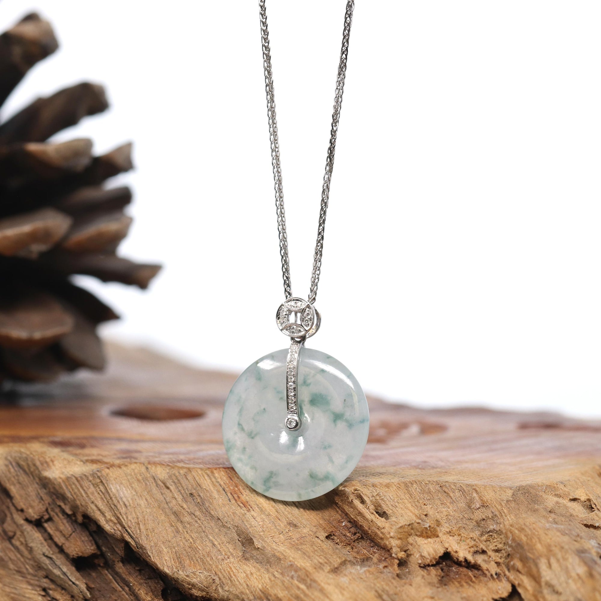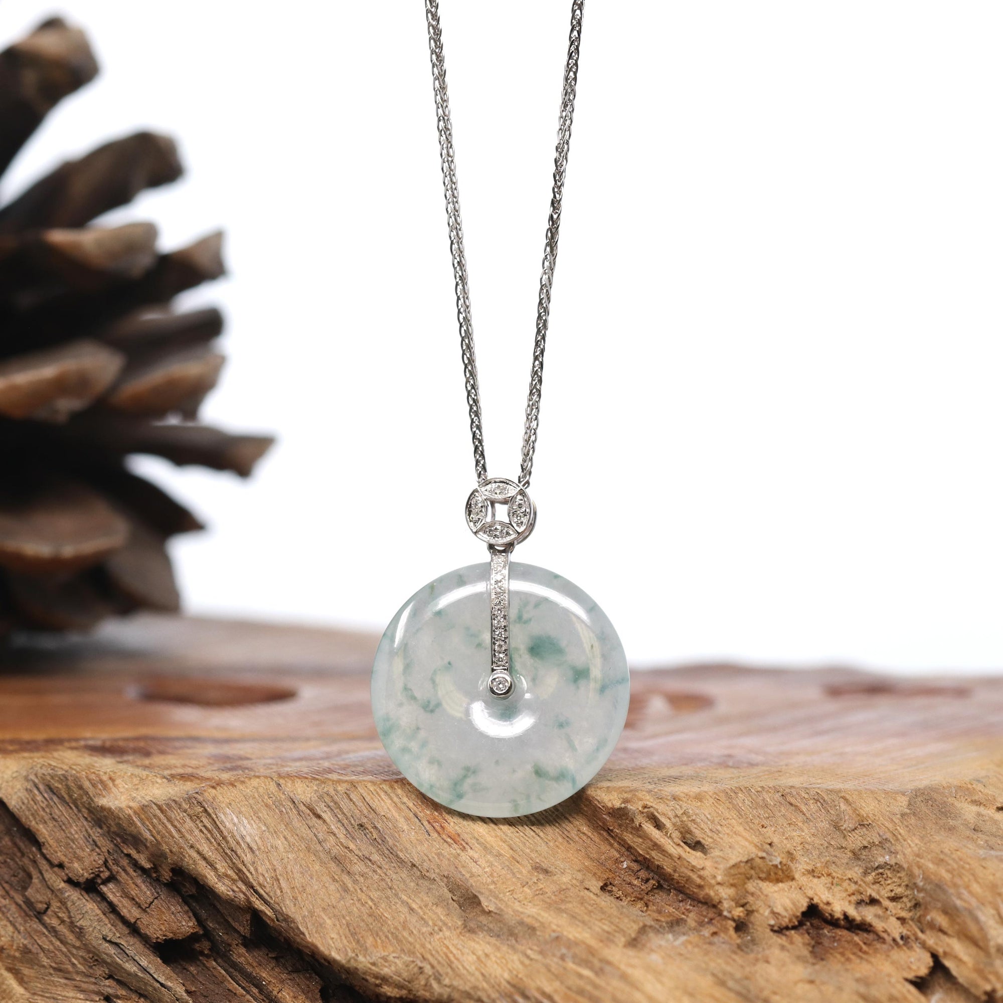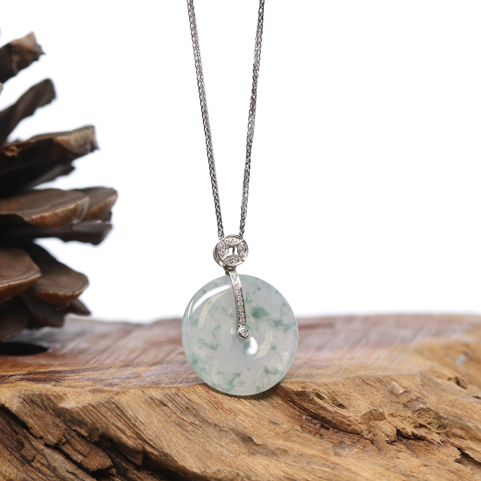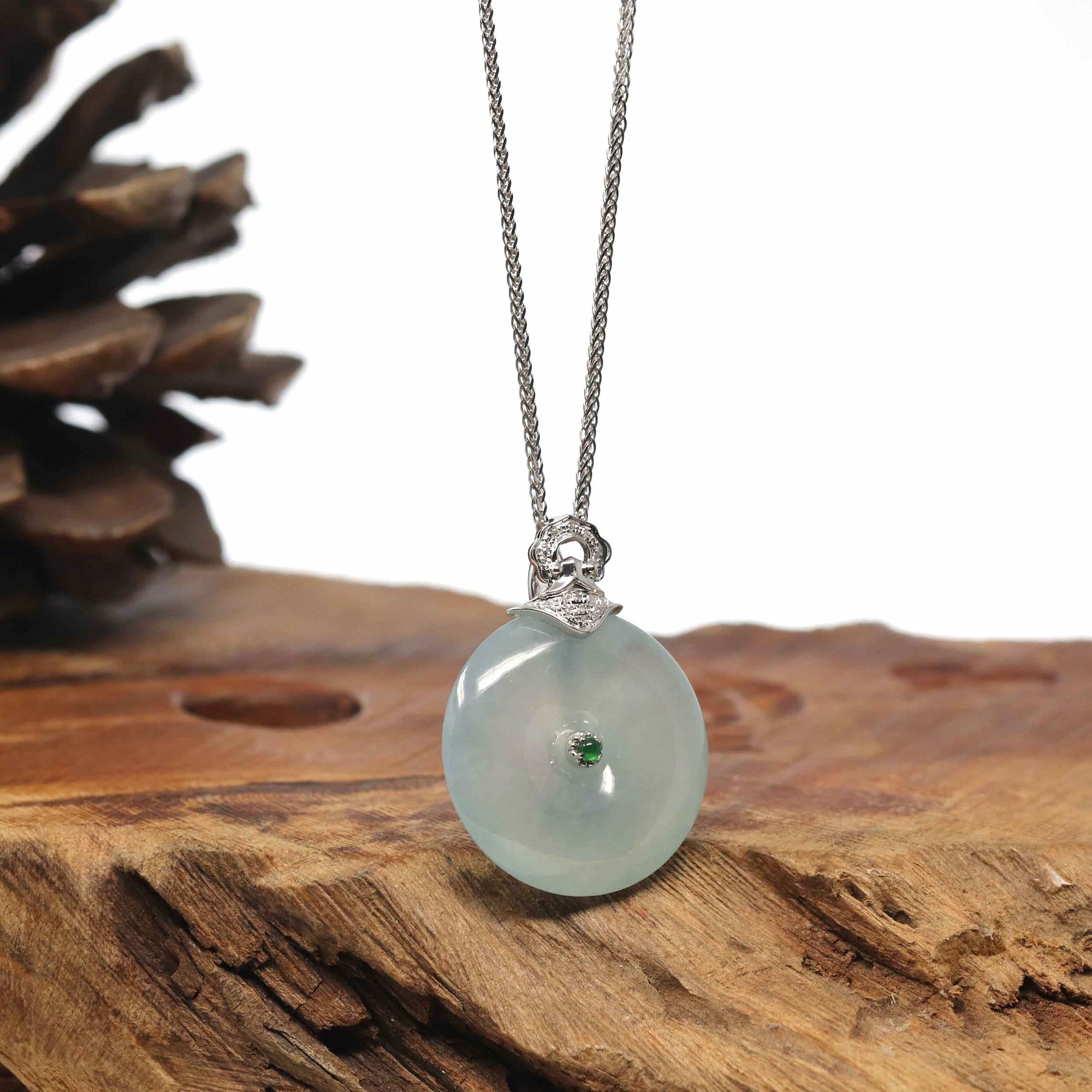 18K White Gold "Good Luck Button" Necklace Icy Green Jadeite Jade Pendant Necklace